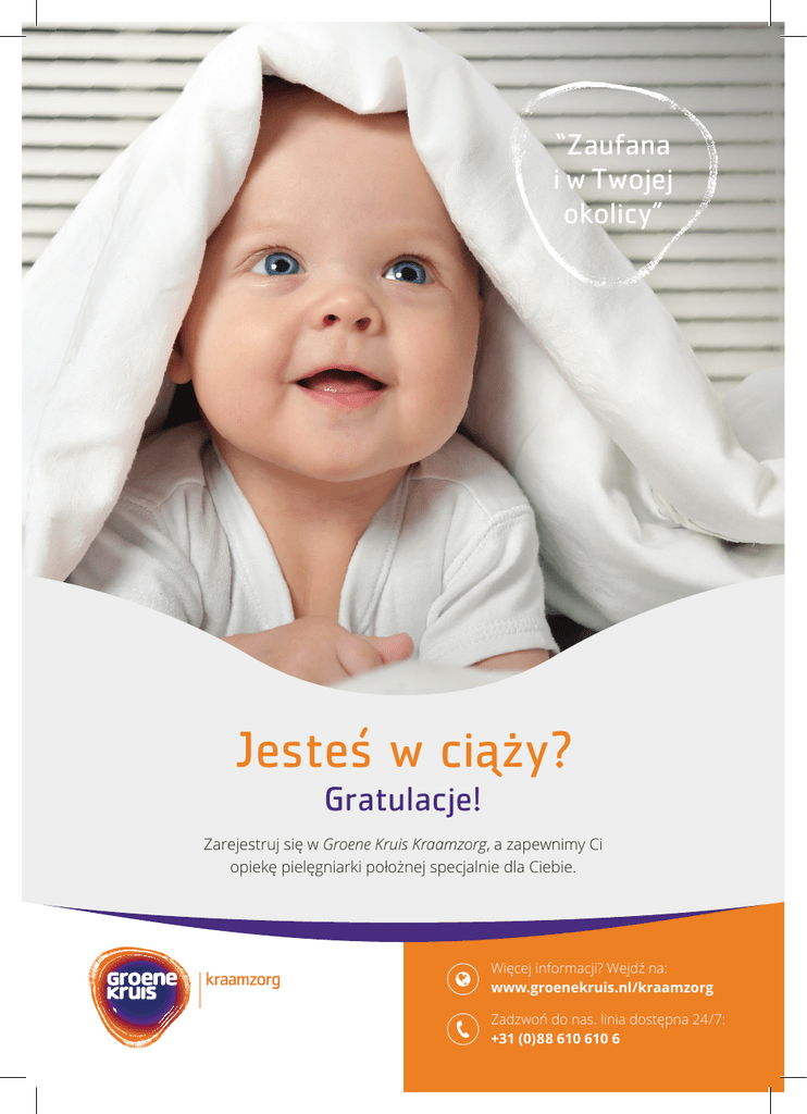 “Zaufana i w Twojej okolicy” Jestes w ciazy? Gratulacje! Zarejestruj się w Groene Kruis Kraamzorg, a zapewnimy Ci opiekę pielęgniarki położnej specjalnie dla Ciebie. Więcej informacji? Wejdź na: www.groenekruis.nl/kraamzorg Zadzwoń do nas. linia dostępna 24/7: +31 (0)88 610 610 6 Hurra, jestes w ciazy! Zaczął się cudowny okres w Twoim życiu. Dlatego chciałabyś, aby wkrótce wszystko było dobrze zorganizowane dla Twojego dziecka. Dlatego już teraz zaczynasz planować: myślisz nad imieniem dla dziecka, jak urządzisz jego pokój i co musisz dla niego kupić. Zarejestruj się online za pomocą naszej strony internetowej lub napisz do nas: [email protected] Zapraszamy również do kontaktu telefonicznego. 24/7 Przyszłe miesiące będą bardzo ekscytujące. Na szczęście od początku trwania ciąży możesz liczyć na Groene Kruis Kraamzorg. Jesteśmy po to, aby zapewnić Tobie i Twojemu dziecku wyjątkowy czas po jego narodzinach. Twoje osobiste wymagania są dla nas najważniejsze, dlatego chcemy dać Ci taką opiekę położniczą, jakiej sama potrzebujesz. Dzięki czemu razem z Twoją nową rodziną będziesz mogła rozpocząć nowy okres w życiu, w którym będziesz się pewnie czuła w roli matki. Nasze doświadczone pielęgniarki położne to profesjonalistki, które podchodzą z entuzjazmem i miłością do swojego zawodu. Jesteśmy dostępni podoba Groene Kruis Kraamzorg: opieka położnicza jakiej oczekujesz numerem telefonu: • • • • • • +31 (0)88 610 610 6 Pielęgniarka położna • Indywidualne podejście, specjalnie dla Ciebie. również dla pozostałych Opieka położnicza, która członków rodziny. dopasowana jest do Twojej • Najlepsze doradztwo w indywidualnej sytuacji. zakresie karmienia piersią. Gwarantowana liczba godzin • Służy poradą przez 24 godziny opieki położniczej. na dobę i jest dostępne dla Zaufana i w Twojej okolicy. wszystkich Twoich pytań Profesjonalne i entuzjastyczne w czasie trwania ciąży, pielęgniarki położne. przy porodzie i w okresie po Coaching przy porodzie (VIP). narodzinach dziecka. • I dużo więcej… Nasi specjaliści oferują także badania krwi noworodka poprzez ukłucie w piętę oraz badania przesiewowe słuchu. społecznościowych: Zorganizowanie opieki położniczej jest bardzo proste. Wystarczy jeden telefon lub e-mail, a my wszystko uregulujemy. Od pierwszego pakietu informacyjnego do beztroskiego czasu po narodzinach Twojego dziecka. Wybierając naszą ofertę, zapewniasz sobie niezapomniany czas w tym wyjątkowym okresie! Zaufanie od początku. GK001 SEP15 Podoba Ci się nasza oferta? Śledź nas na portalach