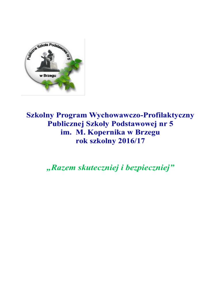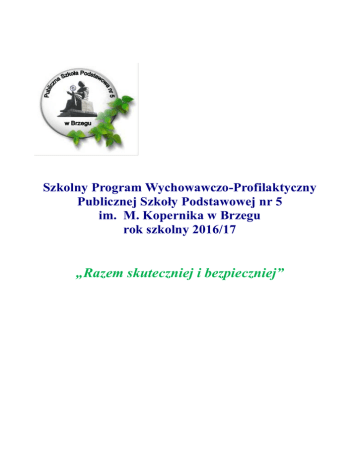 Szkolny Program Wychowawczo-Profilaktyczny Publicznej Szkoły Podstawowej nr 5 im. M. Kopernika w Brzegu rok szkolny 2016/17 „Razem skuteczniej i bezpieczniej” Podstawa prawna Szkolnego Programu Wychowawczo – Profilaktycznego: Problem profilaktyki w polskich aktach prawnych często się pojawia, ale nie zawsze jest znany i stosowany, dlatego też w opracowaniu tego programu dokonano przeglądu najważniejszych dokumentów prawnych obowiązujących w Rzeczpospolitej Polskiej i w Szkole Podstawowej nr 5, do których należą: Konstytucja Rzeczypospolitej Polskiej z dnia 2 kwietnia 1997 r. (Dz.U. Nr 78, poz. 483) Art. 72. Konwencja o prawach dziecka z dnia 20 listopada 1989 r. (Dz.U. 1991 Nr 120, poz. 526) Art. 19; 33. przyjęta przez Zgromadzenie Ogólne Narodów Zjednoczonych Ustawa o wychowaniu w trzeźwości i przeciwdziałaniu alkoholizmowi z dnia 26 października 1982 r. (Dz.U. Nr 35, poz. 230) tekst jednolity z dnia 22 lipca 2002 r. (Dz.U. Nr 147, poz. 1231) tekst jednolity z dnia 28 marca 2007 r. (Dz.U. Nr 70, poz. 473) Ustawa o ochronie zdrowia przed następstwami używania tytoniu i wyrobów tytoniowych z dnia 9 listopada 1995 r. (Dz.U. 1996 Nr 10, poz. 55) Art. 1; 3 Ustawa o przeciwdziałaniu narkomanii z dnia 29 lipca 2005 r. (Dz.U. Nr 179, poz. 1485) Art. 2; 5; 19. Ustawa o systemie oświaty z dnia 7 września 1991 r. (Dz.U. Nr 95, poz. 425) tekst jednolity z dnia 16 maja 1996 r. (Dz.U. Nr 67, poz. 329) tekst jednolity z dnia 19 listopada 2004 r. (Dz.U. Nr 256, poz. 2572) Art. 4; 14; 14a. Europejska Deklaracja w sprawie młodzieży i alkoholu przyjęta w Sztokholmie dnia 21 lutego 2001 roku Narodowy Program Profilaktyki i Rozwiązywania Problemów Alkoholowych na lata 2006 – 2010 opracowany na podstawie art. 3 ust. 3 pkt 1 ustawy o wychowaniu w trzeźwości i przeciwdziałaniu alkoholizmowi opracowany przez Państwową Agencję Rozwiązywania Problemów Alkoholowych "Polska Deklaracja w Sprawie Młodzieży i Alkoholu" UCHWAŁA SEJMU RZECZYPOSPOLITEJ POLSKIEJ z dnia 18 lutego 2000 r. Ustawa o postępowaniu w sprawach nieletnich z dnia 26 października 1982 r. (Dz.U. Nr 35, poz. 228) tekst jednolity z dnia 25 stycznia 2002 r. (Dz.U. Nr 11, poz. 109) Art. 4; 4a. Rozporządzenie Ministra Edukacji Narodowej i Sportu w sprawie zasad udzielania i organizacji pomocy psychologiczno-pedagogicznej w publicznych przedszkolach, szkołach i placówkach z dnia 7 stycznia 2003 r. (Dz.U. Nr 11, poz. 114) Rozporządzenie Ministra Edukacji Narodowej i Sportu w sprawie szczegółowych form działalności wychowawczej i zapobiegawczej wśród dzieci i młodzieży zagrożonych uzależnieniem z dnia 31 stycznia 2003 r. (Dz.U. Nr 26, poz. 226) § 10. Polska Deklaracja w Sprawie Przeciwdziałania Przemocy w Rodzinie przyjęta w grudniu 1995 roku na II Ogólnopolskiej Konferencji na temat Przeciwdziałania Przemocy w Rodzinie. Europejski Plan Działań dotyczących alkoholu, opracowany przez Światową Organizację Zdrowia na lata 2000-2005 Podstawowe kierunki realizacji polityki oświatowej państwa i priorytetowe zadania z zakresu nadzoru pedagogicznego do realizacji w roku szkolnym 2009/2010 Rozporządzenie ministra edukacji narodowej w sprawie podstawy programowej wychowania przedszkolnego oraz kształcenia ogólnego w poszczególnych typach szkół (Dz.U. z 2009 r. nr 4; poz. 17 str. 1) Rozporządzenie Ministra Edukacji Narodowej i Sportu z dnia 13 czerwca 2003r.w sprawie rodzajów, organizacji oraz sposobu działania publicznych placówek kształcenia ustawicznego, w tym publicznych ośrodków dokształcania i doskonalenia zawodowego ) dz. U. z 2003 r. nr 132 poz. 1225) - Strategia Rozwoju Kształcenia Ustawicznego do roku 2010 przyjęta przez Radę Ministrów 8 lipca 2003r. jako jeden z priorytetów uznaje tworzenie zasobów informacyjnych w zakresie kształcenia ustawicznego i rozwój usług doradczych SPIS TREŚCI: I II III IV V VI VII Wprowadzenie Misja szkoły Model absolwenta Założenia podstawowe programu wychowawczo-profilaktycznego Priorytety wychowawczo-profilaktyczne Główne cele wychowawczo – profilaktyczne Realizacja priorytetów wychowawczo – profilaktycznych 1. Kultura osobista 2. Motywacja ucznia do różnorodnych form aktywności 3. Bezpieczeństwo i profilaktyka społeczna 4. Patriotyzm 5. Edukacja czytelnicza i medialna 6. Uzależnienia – profilaktyka 7. Doradztwo edukacyjno – zawodowe. 8.Współpraca z rodzicami VIII Zadania nauczyciela – wychowawcy IX Poznawanie ucznia, zapewnianie pomocy X Organizacja imprez i uroczystości szkolnych oraz akcji podejmowanych i przeprowadzanych przez uczniów XI Procedury XII Ewaluacja programu wychowawczo – profilaktycznego I WPROWADZENIE Wychowanie to świadome oddziaływanie przez wychowawcę na wychowanka, mające na celu wytworzenie pewnej zmiany w jego osobowości. Zmiany te powinny obejmować zarówno stronę poznawczą jak i instrumentalną, a sam proces zachodzący między nimi jest uwarunkowany wieloma czynnikami. Profilaktyka to działanie , które ma celu zapobieganie pojawieniu się lub rozwojowi niekorzystnego zjawiska. Jest też jednym ze sposobów reagowania na zjawiska społeczne, które oceniamy jako szkodliwe i niepożądane. Program Wychowawczo – Profilaktyczny Szkoły to uporządkowany opis celów i działań odnoszących się do funkcjonowania szkoły w aspekcie wychowania i profilaktyki. Program zawiera Misję szkoły, czyli określenie celu istnienia szkoły w naszym środowisku. Nadaje ona kierunek działaniom edukacyjnym i wychowawczym, podejmowanym przez wszystkich Z Misji szkoły wynika Sylwetka absolwenta - czyli wizerunek ucznia kończącego edukację w naszej szkole. Aby osiągnąć pożądany efekt, określono w Szkolnym Programie Wychowawczo Profilaktycznym podstawowe cele wychowania oraz zadania szkoły. Zadania szkoły ujęto w sposób bardzo ogólny, ponieważ wychowanie jest procesem ciągłym i długofalowym. Poszczególne zadania realizowane są na poszczególnych etapach kształce