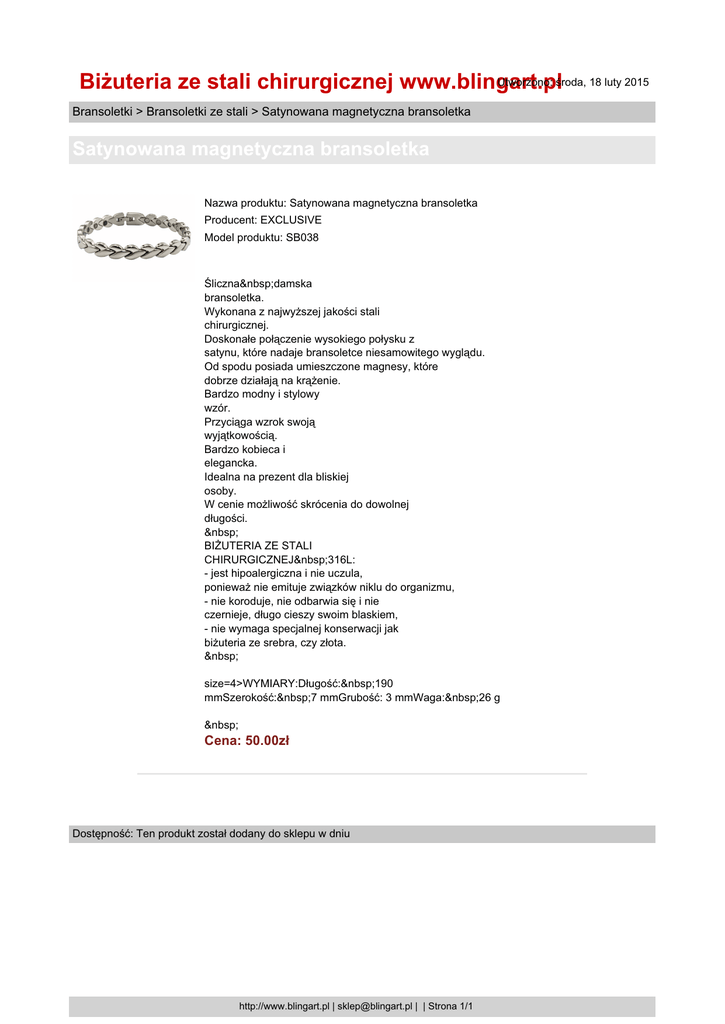 Utworzono: środa, 18 luty 2015 Biżuteria ze stali chirurgicznej www.blingart.pl Bransoletki > Bransoletki ze stali > Satynowana magnetyczna bransoletka Satynowana magnetyczna bransoletka Nazwa produktu: Satynowana magnetyczna bransoletka Producent: EXCLUSIVE Model produktu: SB038 Śliczna damska bransoletka. Wykonana z najwyższej jakości stali chirurgicznej. Doskonałe połączenie wysokiego połysku z satynu, które nadaje bransoletce niesamowitego wyglądu. Od spodu posiada umieszczone magnesy, które dobrze działają na krążenie. Bardzo modny i stylowy wzór. Przyciąga wzrok swoją wyjątkowością. Bardzo kobieca i elegancka. Idealna na prezent dla bliskiej osoby. W cenie możliwość skrócenia do dowolnej długości. BIŻUTERIA ZE STALI CHIRURGICZNEJ 316L: - jest hipoalergiczna i nie uczula, ponieważ nie emituje związków niklu do organizmu, - nie koroduje, nie odbarwia się i nie czernieje, długo cieszy swoim blaskiem, - nie wymaga specjalnej konserwacji jak biżuteria ze srebra, czy złota. size=4>WYMIARY:Długość: 190 mmSzerokość: 7 mmGrubość: 3 mmWaga: 26 g Cena: 50.00zł Dostępność: Ten produkt został dodany do sklepu w dniu http://www.blingart.pl | [email protected] | | Strona 1/1