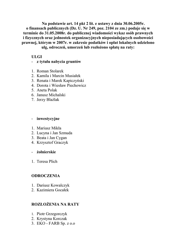 a podstawie art. 14 pkt 2 lit. e ustawy z dnia 30.06.2005r. o finansach publicznych (Dz. U. r 249, poz. 2104 ze zm.) podaje się w terminie do 31.05.2008r. do publicznej wiadomości wykaz osób prawnych i fizycznych oraz jednostek organizacyjnych nieposiadających osobowości prawnej, którym w 2007r. w zakresie podatków i opłat lokalnych udzielono ulg, odroczeń, umorzeń lub rozłożono spłatę na raty: ULGI - z tytułu nabycia gruntów 1. 2. 3. 4. 5. 6. 7. Roman Stolarek Kamila i Marcin Musiałek Renata i Marek Kapiczyński Dorota i Wiesław Piechowicz Aneta Polak Janusz Michalski Jerzy Blaźlak - inwestycyjne 1. 2. 3. 4. Mariusz Mikła Lucyna i Jan Szmuda Beata i Jan Cygan Krzysztof Graczyk - żołnierskie 1. Teresa Plich ODROCZEIA 1. Dariusz Kowalczyk 2. Kazimiera Gocałek ROZŁOŻEIA A RATY 1. Piotr Grzegorczyk 2. Krystyna Korczak 3. EKO - FARB Sp. z o.o UMORZEIA 1. 2. 3. 4. 5. 6. Stolarstwo – Przerób Drewna EXPORT – IMPORT Piotr Nowak Piotr Grzegorczyk Elżbieta Janik Samodzielny Publiczny Zakład Podstawowej Opieki Zdrowotnej Zenon Cichy Elżbieta Brożyńska 7. Anna Kaczmarek 8. Zofia Godlińska – Nosek 9. Marzena Sendak 10.Jolanta i Krzysztof Graczyk 11.Józef Kowalczyk 12.Jarosław Pokorski 13.Barbara Pokorska 14.Antoni Urbański 15.Bogdan Wojciechowski 16.Małgorzata Kaczmarek 17.Elżbieta Brożyńska