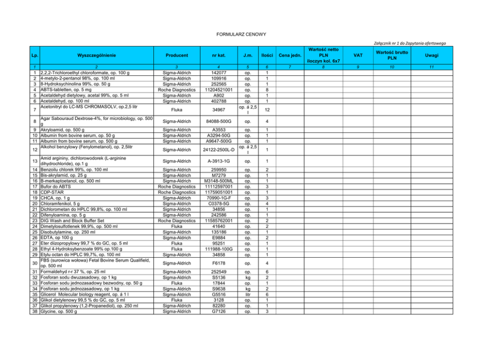 FORMULARZ CENOWY Załącznik nr 1 do Zapytania ofertowego Lp. Wyszczególnienie Producent nr kat. J.m. Ilości Cena jedn. Wartość netto PLN iloczyn kol. 6x7 VAT Wartość brutto PLN Uwagi 1 2 3 4 5 6 7 8 9 10 11 Sigma-Aldrich Sigma-Aldrich Sigma-Aldrich Roche Diagnostics Sigma-Aldrich Sigma-Aldrich 142077 109916 252565 11204521001 A902 402788 1 1 1 8 1 1 Fluka 34967 op. op. op. op. op. op. op. á 2,5 l Sigma-Aldrich 84088-500G op. 4 Sigma-Aldrich Sigma-Aldrich Sigma-Aldrich A3553 A3294-50G A9647-500G 1 1 1 Sigma-Aldrich 24122-2500L-D op. op. op. op. á 2,5 l Sigma-Aldrich A-3913-1G op. 1 Sigma-Aldrich Sigma-Aldrich Sigma-Aldrich Roche Diagnostics Roche Diagnostics Sigma-Aldrich Sigma-Aldrich Sigma-Aldrich Sigma-Aldrich Roche Diagnostics Fluka Sigma-Aldrich Sigma-Aldrich Fluka Fluka Sigma-Aldrich 259950 M7279 M3148-500ML 11112597001 11759051001 70990-1G-F C0378-5G 34856 242586 11585762001 41640 135186 E9884 95251 111988-100G 34858 op. op. op. op. op. op. op. op. op. op. op. op. op. op. op. op. 2 1 1 3 1 3 4 1 1 2 2 1 2 1 1 1 Sigma-Aldrich F6178 op. 4 Sigma-Aldrich Sigma-Aldrich Fluka Sigma-Aldrich Sigma-Aldrich Fluka Sigma-Aldrich Sigma-Aldrich 252549 S5136 17844 S9638 G5516 3128 82280 G7126 op. kg op. kg litr op. op. op. 6 2 1 2 6 1 1 3 1 2 3 4 5 6 7 2,2,2-Trichloroethyl chloroformate, op. 100 g 4-metylo-2-pentanol 98%, op. 100 ml 8-Hydroksychinolina 99%, op. 50 g ABTS-tabletten, op. 5 mg Acetaldehyd dietylowy, acetal 99%, op. 5 ml Acetaldehyd, op. 100 ml Acetonitryl do LC-MS CHROMASOLV, op.2,5 litr Agar Sabouraud Dextrose-4%, for microbiology, op. 500 g 9 Akryloamid, op. 500 g 10 Albumin from bovine serum, op. 50 g 11 Albumin from bovine serum, op. 500 g Alkohol benzylowy (Fenylometanol), op. 2,5litr 12 8 13 14 15 16 17 18 19 20 21 22 23 24 25 26 27 28 29 30 31 32 33 34 35 36 37 38 Amid argininy, dichlorowodorek (L-arginine dihydrochloride), op.1 g Benzoilu chlorek 99%, op. 100 ml Bis-akrylamid, op. 25 g B-merkaptoetanol, op. 500 ml Bufor do ABTS CDP-STAR CHCA, op. 1 g Chloramfenikol, 5 g Dichlorometan do HPLC 99,8%, op. 100 ml Difenyloamina, op. 5 g DIG Wash and Block Buffer Set Dimetylosulfotlenek 99,9%, op. 500 ml Disobutylamine, op. 250 ml EDTA, op 100 g Eter diizopropylowy 99,7 % do GC, op. 5 ml Ethyl 4-Hydroksybenzoate 99% op.100 g Etylu octan do HPLC 99,7%, op. 100 ml FBS (surowica wołowa) Fetal Bovine Serum Qualifield, op. 500 ml Formaldehyd r-r 37 %, op. 25 ml Fosforan sodu dwuzasadowy, op 1 kg Fosforan sodu jednozasadowy bezwodny, op. 50 g Fosforan sodu jednozasadowy, op 1 kg Glicerol Molecular biology reagent, op. á 1 l Glikol dietylenowy 99,5 % do GC, op. 5 ml Glikol propylenowy (1,2-Propanediol), op. 250 ml Glycine, op. 500 g 12 1 39 40 41 42 43 44 Hydranal Composit 5K, op. 500 ml Hydranal Composite 5, op. 500 ml Hydranal Coulomat AG-Oven, op. 500 ml Hydranal Formamide dry, op. 1 l Hydranal Metanol dry, op. 2,5 l Hydranal water standard 1.00 , 1 op.=10 amp.x4 ml Hydranal Water Standard 10.0- Standard for volumetric 45 Karl Fischer titration, op. 10 amp x 8 ml Hydrochloric acid 1.0 N solution, op. 100ml IPTG, op. 10 g Koktail inhibitorów proteaz op. 5 ml Kwas cytrynowy, op. 100 g Kwas L-glutaminowy BioUltra, op. 100g Kwas mrówkowy do LC-MS, op. 50 ml Kwas octowy do LC-MS, op. 50 ml Kwas siarkowy stężony 96,5%, op. 100 ml Kwas siarkowy stężony 96,5%, op. 500 ml Kwas trójchlorooctowy, op. 1 kg Kwas trójfluorooctowy op.100 ml L-Glutamina, op.100 g L-Glutation zredukowany, op.5 g Lumi-film chemiluminescent detection film Lysozyme, op. 25 g MDCK cell line canine - 1VL Medium DMEM, op.= 6x500 ml MEM Non-essential Amino Acid Solution (100x), op. 63 100 ml Metanol do LC-MS CHROMASOLV, op.2,5 litr 64 46 47 48 49 50 51 52 53 54 55 56 57 58 59 60 61 62 65 66 67 68 69 70 71 72 73 74 75 76 77 Mettler Toledo Calibration Substance ME 18555 Benzoic Acid, op. 5 g Minimum Essential Medium Eagle MOPS, 100 g N,N-Dimethylformamide dimethyl acetal (DMF-DMA), op. 100 ml N,N-dimetyloacetamid 99,5%, (GC), op. 1 litr N,N-dimetyloacetamid CHROMASOLV 99,9%,do HPLC, op. 1 litr N,N-dimetyloacetamide -dimethyl acetal (DMA-DMA), op. 25 g N-lauroylsarcosine sodium salt N-Z-amine A, op. 500 g o-Cresol, op. 5 g PBS - Phosphate buffered saline tablet - tabletki do sporządzania buforu, op. 100 szt. p-Cresol, op. 5 g Penicylina-Streptawidyna, op. 20 ml Fluka Riedel-de Haen Riedel-de Haen Fluka 34816-500ML-R 34805-500ML-R 34739-500 ML-R 34724-1L-R 1 2 2 1 D 6546 op. op. op. litr op. á 2,5 l op. 10x4ml op. 10x8ml op. op. op. op. op. op. op. op. op. kg op. op. op. op. op. op. op. Fluka 34741-2,5L-F Fluka 34828-40ML Fluka 34849-80ML Sigma-Aldrich Sigma-Aldrich Sigma-Aldrich Sigma-Aldrich Sigma Fluka Fluka Sigma-Aldrich Sigma-Aldrich Sigma-Aldrich Sigma-Aldrich Sigma-Aldrich Sigma-Aldrich Roche Diagnostics Sigma-Aldrich Sigma-Aldrich Sigma-Aldrich H9892 I6758-10G P-8340 251275-100G 49449 56302 49199 258105-100ML 258105 T 8657 T-6508 G3126 G4251 11666916001 L 2879 Sigma-Aldrich M7145 op. 2 Fluka 34966 op. á 2,5 l 16 Fluka 73983-5G-F op. 1 Sigma-Aldrich Sigma-Aldrich M2279-6x500ml M1254-100G op. g 2 1 Fluka 140732 op. 3 Fluka 38840-1L-F-D litr 1 Sigma-Aldrich 270555 litr 2 Sigma-Aldrich 261483 op. 6 Sigma-Aldrich Sigma-Aldrich Sigma-Aldrich L5777-50G C0626 C85700-5G op. op. op. 1 1 1 Sigma-Aldrich P-4417 op. 2 Sigma-Aldrich Sigma-Aldrich C85751-5G P4333 op. op. 1 8 84121903-1VL 2 2 1 2 1 6 1 1 2 1 1 2 1 1 4 1 1 2 1 1 78 79 80 81 82 83 84 85 86 87 88 89 90 91 92 93 94 95 96 PERFECTHYB PLUS, 125 ml Phenol, op. 100 ml Podłoże R2A 500 g Potasu diwodorofosforan (do IC), op. 100 g Pregabalin-D6 roztwór 100ug/ml w metanolu, amp. 1 ml Propyl 4-hydroxybenzoate (Propyl paraben), op. 5 g Przeciwciala ANTI-Digoxigenin AP, op. á 200 µl Rodanina, op=25g Sabouraud Dextrose Broth, op. 500 g Siarczan amonu, op. 5 kg Sodium dodecyl sulfate Sodowy 1-octanosulfonian, op. 100 g Sodowy 1-oktanosulfonian jednowodny, op. 50 g Sodu azydek, op. 10 g Sodu diwodorofosforan bezwodny, op. 500 g Sodu siarczyn bezwodny czda, op. 1