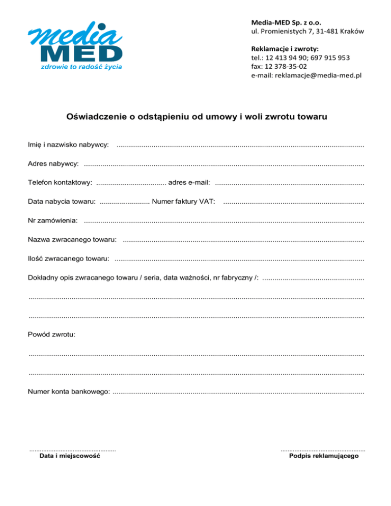 Oświadczenie o odstąpieniu od umowy i woli - Sklep Media-Med