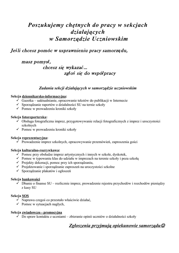 Poszukujemy chętnych do pracy w sekcjach działających w Samorządzie Uczniowskim Je ś li chcesz pomóc w usprawnieniu pracy samorz ą du, masz pomys ł , chcesz si ę wykaza ć … zg ł o ś si ę do wspó ł pracy Zadania sekcji działających w samorządzie uczniowskim Sekcja dziennikarsko-informacyjna: Gazetka – uaktualnianie, opracowanie tekstów do publikacji w Internecie Sporządzanie raportów o działalności SU na ternie szkoły Pomoc w prowadzeniu kroniki szkoły Sekcja fotoreporterska: Obsługa fotograficzna imprez, przygotowywanie relacji fotograficznych z imprez i uroczystości szkolnych Pomoc w prowadzeniu kroniki szkoły Sekcja reprezentacyjna: Prowadzenie imprez szkolnych, opracowywanie przemówień, zaproszenia gości Sekcja kulturalno-rozrywkowa: Pomoc przy obsłudze imprez artystycznych i innych w szkole, dyskotek, Pomoc w typowaniu klas do udziału w imprezach na terenie szkoły i poza szkołą Projekty dekoracji, pomoc przy ich sporządzaniu, Projektowanie i sporządzanie zaproszeń na uroczystości szkolne Sporządzanie plakatów i ogłoszeń Sekcja bankowości Dbanie o finanse SU – rozlicznie imprez, prowadzenie rejestru przychodów i rozchodów pieniędzy z kasy SU Sekcja SOS Naprawa czegoś co przestało właściwie działać, Pomoc w sytuacjach nagłych, Sekcja zwiadowczo - promocyjna Do spraw kontaktu z uczniami – zbieranie opinii uczniów o działalności szkoły Zgłoszenia przyjmują opiekunowie samorządu