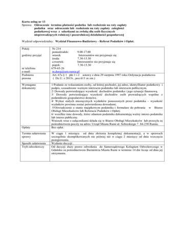 Karta usług nr 13 Sprawa: Odroczenie terminu płatności podatku lub rozłożenie na raty zapłaty podatku oraz odroczenie lub rozłożenie na raty zapłaty zaległości podatkowej wraz z odsetkami za zwłokę dla osób fizycznych nieprowadzących rolniczej i pozarolniczej działalności gospodarczej Wydział odpowiedzialny: Wydział Finansowo-Budżetowy - Referat Podatków i Opłat. Pokój godziny przyjęć nr telefonu e-mail: Podstawa prawna Wymagane dokumenty Opłaty Termin załatwienia sprawy Sposób załatwienia Tryb odwoławczy Nr 214 poniedziałek: 9.00-17.00 wtorek Interesentów nie przyjmuje się środa: 7.30-15.30 czwartek: Interesentów nie przyjmuje się piątek: 7.30-15.30 679-65-26 [email protected] Art. 67a § 1 pkt 1 i 2 ustawy z dnia 29 sierpnia 1997 roku Ordynacja podatkowa ( Dz.U. z 2015r., poz.613 ze zm.) 1/Podanie ze wskazaniem osoby, od której pochodzi, jej adres, identyfikator podatkowy i podpis, uzasadnione ważnym interesem podatnika lub interesem publicznym. 2/ Dowody potwierdzające wysokość dochodów podatnika i jego sytuacje finansową. 3/ Dowody potwierdzające wysokość dochodów osób prowadzących wspólne z podatnikiem gospodarstwo domowe. 4/ Wykaz stałych miesięcznych wydatków ponoszonych przez podatnika – wysokość wydatków powinna zostać potwierdzona dowodami; 5/Oświadczenie o stanie majątkowym podatnika ( formularz do pobrania w Biurze Obsługi Mieszkańców lub Referacie Podatków i Opłat). 6/ wszelkie inne dowody, które zdaniem podatnika dokumentują ważny interes podatnika lub interes publiczny. Wniosek wraz z załącznikami składa się w Biurze Obsługi Mieszkańców lub przesyła za pośrednictwem poczty na adres: Urząd Miasta Rumi ul. Sobieskiego 7 84-230 Rumia. Bez opłat. W ciągu 1 miesiąca od dnia złożenia kompletnej dokumentacji, a w sprawach szczególnie skomplikowanych nie później niż w ciągu 2 miesięcy od dnia wszczęcia postępowania. Wydanie decyzji . Od decyzji służy prawo odwołania do Samorządowego Kolegium Odwoławczego w Gdańsku za pośrednictwem Burmistrza Miasta Rumi w terminie 14 dni licząc od dnia jej otrzymania.