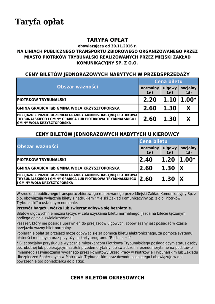 Taryfa opłat TARYFA OPŁAT obowiązująca od 30.11.2016 r. NA LINIACH PUBLICZNEGO TRANSPORTU ZBIOROWEGO ORGANIZOWANEGO PRZEZ MIASTO PIOTRKÓW TRYBUNALSKI REALIZOWANYCH PRZEZ MIEJSKI ZAKŁAD KOMUNIKACYJNY SP. Z O.O. CENY BILETÓW JEDNORAZOWYCH NABYTYCH W PRZEDSPRZEDAŻY Cena biletu Obszar ważności normalny ulgowy socjalny (zł) PIOTRKÓW TRYBUNALSKI GMINA GRABICA lub GMINA WOLA KRZYSZTOPORSKA PRZEJAZD Z PRZEKROCZENIEM GRANICY ADMINISTRACYJNEJ PIOTRKOWA TRYBUNALSKIEGO I GMINY GRABICA LUB PIOTRKOWA TRYBUNALSKIGO I GMINY WOLA KRZYSZTOPORSKA (zł) 2.20 2.60 1.10 1.00* 1.30 X 2.60 1.30 CENY BILETÓW JEDNORAZOWYCH NABYTYCH U KIEROWCY Cena biletu Obszar ważności normalny ulgowy (zł) PIOTRKÓW TRYBUNALSKI GMINA GRABICA lub GMINA WOLA KRZYSZTOPORSKA PRZEJAZD Z PRZEKROCZENIEM GRANICY ADMINISTRACYJNEJ PIOTRKOWA TRYBUNALSKIEGO I GMINY GRABICA LUB PIOTRKOWA TRYBUNALSKIEGO I GMINY WOLA KRZYSZTOPORSKA (zł) (zł) X socjalny (zł) 2.40 2.60 1.20 1.00* 1.30 X 2.60 1.30 X W środkach publicznego transportu zbiorowego realizowanego przez Miejski Zakład Komunikacyjny Sp. z o.o. obowiązują wyłącznie bilety z nadrukiem "Miejski Zakład Komunikacyjny Sp. z o.o. Piotrków Trybunalski" o ustalonym nominale. Przewóz bagażu, wózka lub zwierząt odbywa się bezpłatnie. Biletów ulgowych nie można łączyć w celu uzyskania biletu normalnego. Jazda na bilecie łączonym podlega opłacie zwielokrotnionej. Pasażer, który nie posiada uprawnień do przejazdów ulgowych, zobowiązany jest posiadać w czasie przejazdu ważny bilet normalny. Pobieranie opłat za przejazd może odbywać się za pomocą biletu elektronicznego, za pomocą systemu płatności mobilnych oraz przy użyciu karty programu "Rodzina +4". * Bilet socjalny przysługuje wyłącznie mieszkańcom Piotrkowa Trybunalskiego posiadającym status osoby bezrobotnej lub pobierającym zasiłek przedemerytalny lub świadczenia przedemerytalne na podstawie imiennego zaświadczenia wydanego przez Powiatowy Urząd Pracy w Piotrkowie Trybunalskim lub Zakładu Ubezpieczeń Społecznych w Piotrkowie Trybunalskim oraz dowodu osobistego i obowiązuje w dni powszednie (od poniedziałku do piątku). CENY BILETÓW OKRESOWYCH Cena biletu Rodzaj biletu normalny (zł) ulgowy (zł) BILET 30-DNIOWY IMIENNY NA JEDNĄ LINIĘ, OBOWIĄZUJĄCY NA TERENIE PIOTRKOWA TRYBUNALSKIEGO 60.00 30.00 BILET 30-DNIOWY IMIENNY NA WSZYSTKIE LINIE, OBOWIĄZUJĄCY NA TERENIE PIOTRKOWA TRYBUNALSKIEGO 74.00 37.00 BILET 30-DNIOWY NA OKAZICIELA NA WSZYSTKIE LINIE, OBOWIĄZUJĄCY NA TERENIE PIOTRKOWA TRYBUNALSKIEGO 86.00 43.00 BILET 30-DNIOWY IMIENNY, OBOWIĄZUJĄCY W OBRĘBIE SIECI KOMUNIKACYJNEJ 86.00 43.00 GRANICE STREF TARYFOWYCH Relacja przejazdu Linia Piotrków Trybunalski – Szydłów Piotrków Trybunalski - Bujny 1 5 Ulica Wojska Polskiego Roosevelta Nazwa przystanku Szczekanica Graniczna OPŁATY DODATKOWE Rodzaj opłaty 1. Opłata dodatkowa za przejazd bez odpowiedniego dokumentu przewozu Wysokość opłaty (zł) 110 2. Opłata dodatkowa za przejazd bez ważnego dokumentu poświadczającego uprawnienie do bezpłatnego albo ulgowego przejazdu 88 3. Opłata dodatkowa za naruszenie przepisów o przewozie rzeczy i zwierząt 44 4. Opłata dodatkowa za zatrzymanie lub zmianę trasy środka transportu bez uzasadnionej przyczyny 330 W przypadku uiszczenia opłaty dodatkowej w ciągu 7 dni od daty wystawienia dokumentu zobowiązującego do uiszczenia tej opłaty, wysokość opłat dodatkowych określonych w pkt. 1, 2 i 3 obniża się o 30%. Pasażer, który podczas kontroli nie posiadał biletu okresowego wieloprzejazdowego imiennego, bądź dokumentu uprawniającego do przejazdu bezpłatnego lub ulgowego i okaże go kontrolującemu w ciągu 7 dni, uiści opłatę manipulacyjną w wysokości 10% opłaty, ustalonej w sposób określony pkt.1 i 2. Odwołania od nałożonych opłat dodatkowych oraz reklamacje związane z opłatami dodatkowymi przyjmowane są w siedzibie Miejskiego Zakładu Komunikacyjnego Sp. z o.o. w Piotrkowie Trybunalskim, ul. Krakowskie Przedmieście 73 od poniedziałku do piątku, w godz. 7-15. Sporządzono na podstawie Załączników Nr 1 i 3 do Uchwały Rady Miasta Piotrkowa Trybunalskiego nr XXVII/364/16 z dnia 26 października 2016 r.