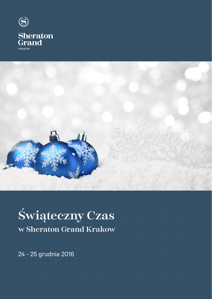 Świąteczny Czas w Sheraton Grand Krakow 24 - 25 grudnia 2016 Przeżyj wyjątkowe Święta z Sheraton Grand Krakow Ten szczególny czas Bożego Narodzenia wzbogacimy wyśmienitym, specjalnie przygotowanym na tę okazję menu. O doskonały smak tradycyjnych i międzynarodowych świątecznych specjałów zadba Szef Kuchni, Jacek Filipczyk. Zaproś rodzinę, przyjaciół i świętuj z nami w eleganckiej scenerii. Świąteczna Kolacja w Restauracji The Olive SOBOTA 24/12/2016 MIĘDZYNARDOWE „6”- DANIOWE MENU Sous Vide marynowany filet z okonia morskiego w tymianku cytrynowym i pomarańczy Konfitura grzybowa pesto z młodego szpinaku i orzechów macadamia *** Bulion z bażanta z klopsikami jagnięcymi i selerem *** Grillowane Atlantyckie przegrzebki i krewetki Mus z marchewki, czarna sosczewica, sos z zielonego curry *** Granitée z owoców granata i imbiru *** Grillowana Polska polędwica wołowa z foie gras Ziemniaczana muffinka, groszek cukrowy, sos z czerwonego wina i szalotki *** Parfait z krwistej pomarańczy o aromacie anyżu Podawane z sosem z wędzonej śliwki *** Kawa i herbata, Świąteczne Ciasteczka 230.00 PLN z VAT od osoby TRADYCYJNE „12”- DANIOWE MENU Sous vide filet z sandacza marynowany w occie z białego wina i ziół Słodka galaretka cytrynowa i sałatka z białej rzodkwi oraz Filet ze śledzia bałtyckiego z salsą z czerwonej cebuli i olejem lnianym *** Barszcz czerwony z uszkami oraz Zupa grzybowa z domowymi kluseczkami skropiona oliwą truflową *** Świąteczny Kulebiak z łososia Sos kurkowy *** Pierogi z kapustą i grzybami Mus selera i pieczonej cebuli *** Krokiety z kapustą i grzybami Duszony groch ze słodką kapustą *** Grillowany filet z pstrąga na sosie z białego wina i pietruszki Spaghetti jarzynowe *** Piernik Tradycyjna Kutia Kompot z suszonych owoców Kawa i herbata, Świąteczne Ciasteczka 205.00 PLN z VAT od osoby Świąteczny Lunch w Restauracji The Olive NIEDZIELA 25/12/2016 ZIMNA ZAKĄSKA Cienkie plastry wędzonej piersi gęsi na parfait z suszonej żurawiny, podawane z sałatką z marynowanej czerwonej kapusty i sosem malinowym lub Świeże liście sałat i chrupiące warzywa, podawane z serem Halloumi i dressingiem z suszonych pomidorów ZUPA Consommé z bażanta z klopsikami jagnięcymi i warzywami lub Krem z białych szparagów i selera podawany z tostem Melba i oliwą truflową NA PRZEŁAMANIE SMAKU Granitée ze świeżego ogórka i limonki DANIE GŁÓWNE Sous vide i grillowna polędwiczka wieprzowa w otoczce z szynki Seranno, na sosie estragonowym w kompozycji polenty i mini warzyw lub Pieczona rolada z indyka nadziewana kasztanami i szałwią na sosie żurawinowym, chutney z dyni i ziemniaki cocotte lub Grillowany filet z labraksa z sosem rakowym, w kompozycji ziemniaków szafranowych, chutney z cytrusów i mini warzyw DESER Tradycyjna Świąteczna rolada “Log” Wefel nugatowy i sos mandarynkowy lub Tradydyjny Polski Ekler z puddingiem waniliowym na salsie z czerwonej porzeczki Świeżo parzona kawa, herbata Świąteczne ciasteczka Woda mineralna Wino domowe białe i czerwone 170.00 PLN z VAT od osoby