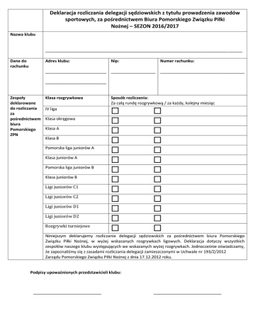 Deklaracja rozliczania delegacji sędziowskich z tytułu prowadzenia zawodów sportowych, za pośrednictwem Biura Pomorskiego Związku Piłki Nożnej – SEZON 2016/2017 Nazwa klubu ____________________________________________________________________________________ Dane do rachunku Adres klubu: Nip: Numer rachunku: __________________________ ___________________ ____________________________________ __________________________ Zespoły deklarowane do rozliczania za pośrednictwem biura Pomorskiego ZPN Klasa rozgrywkowa Sposób rozliczenia: Za całą rundę rozgrywkową / za każdy, kolejny miesiąc IV liga Klasa okręgowa Klasa A Klasa B Pomorska liga juniorów A Klasa juniorów A Pomorska liga juniorów B Klasa juniorów B Ligi juniorów C1 Ligi juniorów C2 Ligi juniorów D1 Ligi juniorów D2 Rozgrywki turniejowe Niniejszym deklarujemy rozliczanie delegacji sędziowskich za pośrednictwem biura Pomorskiego Związku Piłki Nożnej, w wyżej wskazanych rozgrywkach ligowych. Deklaracja dotyczy wszystkich zespołów naszego klubu występujących we wskazanych wyżej rozgrywkach. Jednocześnie oświadczamy, że zapoznaliśmy się z zasadami rozliczania delegacji zamieszczonymi w Uchwale nr 193/Z/2012 Zarządu Pomorskiego Związku Piłki Nożnej z dnia 17.12.2012 roku. Podpisy upoważnionych przedstawicieli klubu: _____________________________ _____________________________