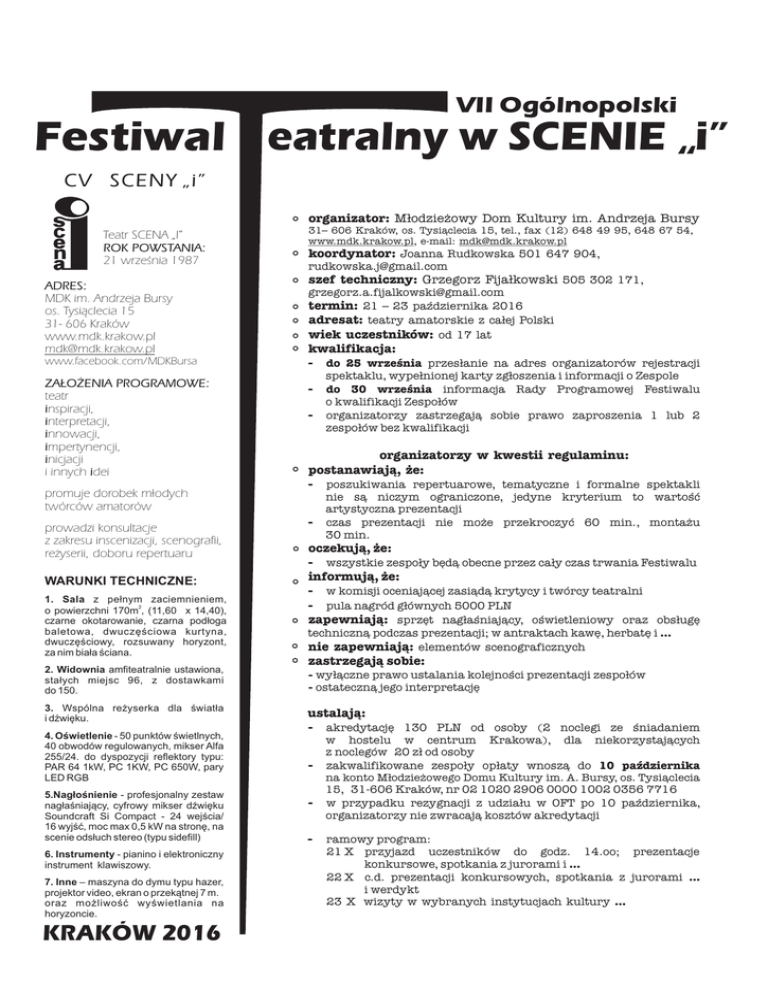 VII Ogólnopolski Festiwal eatralny w SCENIE i” “ CV SCENY „i” organizator: M³odzie¿owy Dom Kultury im. Andrzeja Bursy Teatr SCENA „I” ROK POWSTANIA: 21 wrzeœnia 1987 ADRES: MDK im. Andrzeja Bursy os. Tysi¹clecia 15 31- 606 Kraków www.mdk.krakow.pl [email protected] www.facebook.com/MDKBursa ZA£O¯ENIA PROGRAMOWE: teatr inspiracji, interpretacji, innowacji, impertynencji, inicjacji i innych idei promuje dorobek m³odych twórców amatorów prowadzi konsultacje z zakresu inscenizacji, scenografii, re¿yserii, doboru repertuaru WARUNKI TECHNICZNE: 31– 606 Kraków, os. Tysi¹clecia 15, tel., fax (12) 648 49 95, 648 67 54, www.mdk.krakow.pl, e-mail: [email protected] koordynator: Joanna Rudkowska 501 647 904, [email protected] szef techniczny: Grzegorz Fija³kowski 505 302 171, [email protected] termin: 21 – 23 paŸdziernika 2016 adresat: teatry amatorskie z ca³ej Polski wiek uczestników: od 17 lat kwalifikacja: - do 25 wrzeœnia przes³anie na adres organizatorów rejestracji - spektaklu, wype³nionej karty zg³oszenia i informacji o Zespole do 30 wrzeœnia informacja Rady Programowej Festiwalu o kwalifikacji Zespo³ów organizatorzy zastrzegaj¹ sobie prawo zaproszenia 1 lub 2 zespo³ów bez kwalifikacji organizatorzy w kwestii regulaminu: postanawiaj¹, ¿e: - poszukiwania repertuarowe, tematyczne i formalne spektakli - nie s¹ niczym ograniczone, jedyne kryterium to wartoœæ artystyczna prezentacji czas prezentacji nie mo¿e przekroczyæ 60 min., monta¿u 30 min. oczekuj¹, ¿e: - wszystkie zespo³y bêd¹ obecne przez ca³y czas trwania Festiwalu informuj¹, ¿e: - w komisji oceniaj¹cej zasi¹d¹ krytycy i twórcy teatralni - pula nagród g³ównych 5000 PLN zapewniaj¹: sprzêt nag³aœniaj¹cy, oœwietleniowy oraz obs³ugê 1. Sala z pe³nym zaciemnieniem, o powierzchni 170m2, (11,60 x 14,40), czarne okotarowanie, czarna pod³oga baletowa, dwuczêœciowa kurtyna, dwuczêœciowy, rozsuwany horyzont, za nim bia³a œciana. techniczn¹ podczas prezentacji; w antraktach kawê, herbatê i ... nie zapewniaj¹: elementów scenograficznych 2. Widownia amfiteatralnie ustawiona, sta³ych miejsc 96, z dostawkami do 150. - wy³¹czne prawo ustalania kolejnoœci prezentacji zespo³ów - ostateczn¹ jego interpretacjê 3. Wspólna re¿yserka dla œwiat³a i dŸwiêku. ustalaj¹: - akredytacjê 130 PLN od osoby (2 noclegi ze œniadaniem 4. Oœwietlenie - 50 punktów œwietlnych, 40 obwodów regulowanych, mikser Alfa 255/24. do dyspozycji reflektory typu: PAR 64 1kW, PC 1KW, PC 650W, pary LED RGB 5.Nag³oœnienie - profesjonalny zestaw nag³aœniaj¹cy, cyfrowy mikser dŸwiêku Soundcraft Si Compact - 24 wejœcia/ 16 wyjœæ, moc max 0,5 kW na stronê, na scenie ods³uch stereo (typu sidefill) 6. Instrumenty - pianino i elektroniczny instrument klawiszowy. 7. Inne – maszyna do dymu typu hazer, projektor video, ekran o przek¹tnej 7 m. oraz mo¿liwoœæ wyœwietlania na horyzoncie. KRAKÓW 2016 zastrzegaj¹ sobie: - w hostelu w centrum Krakowa), dla niekorzystaj¹cych z noclegów 20 z³ od osoby zakwalifikowane zespo³y op³aty wnosz¹ do 10 paŸdziernika na konto M³odzie¿owego Domu Kultury im. A. Bursy, os. Tysi¹clecia 15, 31-606 Kraków, nr 02 1020 2906 0000 1002 0356 7716 w przypadku rezygnacji z udzia³u w OFT po 10 paŸdziernika, organizatorzy nie zwracaj¹ kosztów akredytacji ramowy program: 21 X przyjazd uczestników do godz. 14.oo; prezentacje konkursowe, spotkania z jurorami i ... 22 X c.d. prezentacji konkursowych, spotkania z jurorami ... i werdykt 23 X wizyty w wybranych instytucjach kultury ...