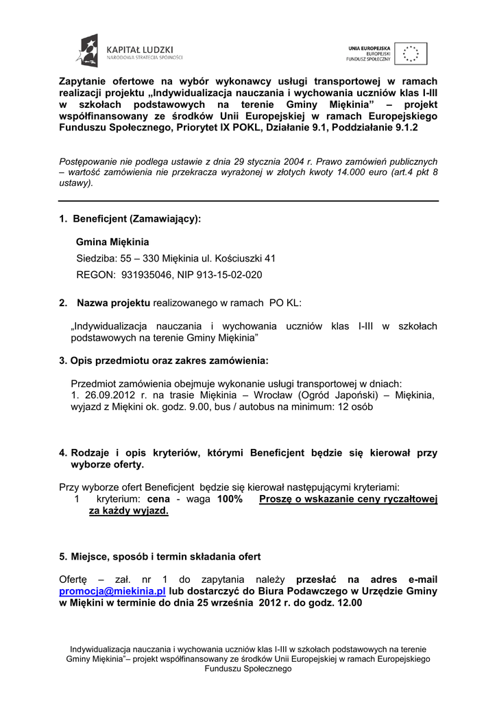 Zapytanie ofertowe na wybór wykonawcy usługi transportowej w ramach realizacji projektu „Indywidualizacja nauczania i wychowania uczniów klas I-III w szkołach podstawowych na terenie Gminy Miękinia” – projekt współfinansowany ze środków Unii Europejskiej w ramach Europejskiego Funduszu Społecznego, Priorytet IX POKL, Działanie 9.1, Poddziałanie 9.1.2 Postępowanie nie podlega ustawie z dnia 29 stycznia 2004 r. Prawo zamówień publicznych – wartość zamówienia nie przekracza wyrażonej w złotych kwoty 14.000 euro (art.4 pkt 8 ustawy). 1. Beneficjent (Zamawiający): Gmina Miękinia Siedziba: 55 – 330 Miękinia ul. Kościuszki 41 REGON: 931935046, NIP 913-15-02-020 2. Nazwa projektu realizowanego w ramach PO KL: „Indywidualizacja nauczania i wychowania uczniów klas I-III w szkołach podstawowych na terenie Gminy Miękinia” 3. Opis przedmiotu oraz zakres zamówienia: Przedmiot zamówienia obejmuje wykonanie usługi transportowej w dniach: 1. 26.09.2012 r. na trasie Miękinia – Wrocław (Ogród Japoński) – Miękinia, wyjazd z Miękini ok. godz. 9.00, bus / autobus na minimum: 12 osób 4. Rodzaje i opis kryteriów, którymi Beneficjent będzie się kierował przy wyborze oferty. Przy wyborze ofert Beneficjent będzie się kierował następującymi kryteriami: 1 kryterium: cena - waga 100% Proszę o wskazanie ceny ryczałtowej za każdy wyjazd. 5. Miejsce, sposób i termin składania ofert Ofertę – zał. nr 1 do zapytania należy przesłać na adres e-mail [email protected] lub dostarczyć do Biura Podawczego w Urzędzie Gminy w Miękini w terminie do dnia 25 września 2012 r. do godz. 12.00 Indywidualizacja nauczania i wychowania uczniów klas I-III w szkołach podstawowych na terenie Gminy Miękinia”– projekt współfinansowany ze środków Unii Europejskiej w ramach Europejskiego Funduszu Społecznego 6. Rozstrzygniecie postępowania i zlecenie realizacji zamówienia Postępowanie ofertowe zostanie rozstrzygnięte nie później niż w dniu 25 września 2012 roku. O wynikach postępowania jego uczestnicy zostaną poinformowani drogą faxową, mailową lub telefonicznie. Miękinia 21 września 2012 r. Indywidualizacja nauczania i wychowania uczniów klas I-III w szkołach podstawowych na terenie Gminy Miękinia”– projekt współfinansowany ze środków Unii Europejskiej w ramach Europejskiego Funduszu Społecznego Załącznik nr 1 OFERTA Ja/My niżej podpisani ........................................................................................................................................ z siedzibą: ........................................................................................................................................ składamy niniejszą ofertę na wykonanie usługi transportowej w ramach realizacji projektu „Indywidualizacja nauczania i wychowania uczniów klas I-III w szkołach podstawowych na terenie Gminy Miękinia” – projekt współfinansowany ze środków Unii Europejskiej w ramach Europejskiego Funduszu Społecznego, Priorytet IX POKL, Działanie 9.1, Poddziałanie 9.1.2 zgodnie z zapytaniem ofertowym z dnia 21.09.2012 r. Wyjazd (26.09.2012 r.) za cenę netto:...........................................zł, plus podatek VAT ....................................zł tj. cena brutto.............................................zł (słownie:..................................................................................................................................... ....................................................... miejscowość i data ............................................................................................................. Pieczęć i podpis Wykonawcy lub osoby uprawnionej do reprezentowania Indywidualizacja nauczania i wychowania uczniów klas I-III w szkołach podstawowych na terenie Gminy Miękinia”– projekt współfinansowany ze środków Unii Europejskiej w ramach Europejskiego Funduszu Społecznego