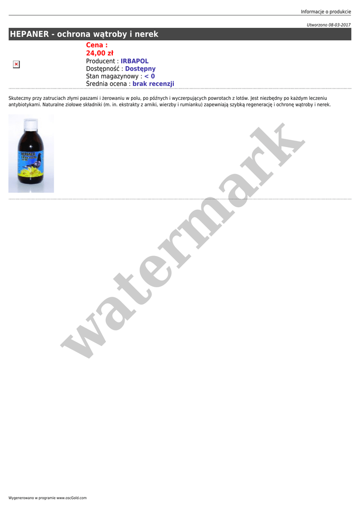 Informacje o produkcie Utworzono 08-03-2017 HEPANER - ochrona wątroby i nerek Cena : 24,00 zł Producent : IRBAPOL Dostępność : Dostępny Stan magazynowy : < 0 Średnia ocena : brak recenzji w at er m ar k Skuteczny przy zatruciach złymi paszami i żerowaniu w polu, po późnych i wyczerpujących powrotach z lotów. Jest niezbędny po każdym leczeniu antybiotykami. Naturalne ziołowe składniki (m. in. ekstrakty z arniki, wierzby i rumianku) zapewniają szybką regenerację i ochronę wątroby i nerek. Wygenerowano w programie www.oscGold.com