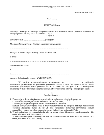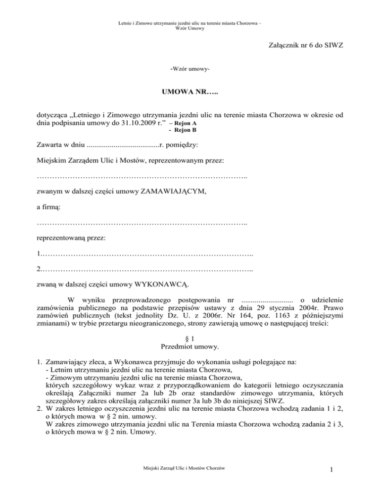 Letnie i Zimowe utrzymanie jezdni ulic na terenie miasta Chorzowa – Wzór Umowy Załącznik nr 6 do SIWZ -Wzór umowyUMOWA NR….. dotycząca „Letniego i Zimowego utrzymania jezdni ulic na terenie miasta Chorzowa w okresie od dnia podpisania umowy do 31.10.2009 r.” – Rejon A - Rejon B Zawarta w dniu ......................................r. pomiędzy: Miejskim Zarządem Ulic i Mostów, reprezentowanym przez: ……………………………………………………………………….. zwanym w dalszej części umowy ZAMAWIAJĄCYM, a firmą: ……………………………………………………………………….. reprezentowaną przez: 1.……………………………………………………………………….. 2.……………………………………………………………………….. zwaną w dalszej części umowy WYKONAWCĄ. W wyniku przeprowadzonego postępowania nr ........................... o udzielenie zamówienia publicznego na podstawie przepisów ustawy z dnia 29 stycznia 2004r. Prawo zamówień publicznych (tekst jednolity Dz. U. z 2006r. Nr 164, poz. 1163 z późniejszymi zmianami) w trybie przetargu nieograniczonego, strony zawierają umowę o następującej treści: §1 Przedmiot umowy. 1. Zamawiający zleca, a Wykonawca przyjmuje do wykonania usługi polegające na: - Letnim utrzymaniu jezdni ulic na terenie miasta Chorzowa, - Zimowym utrzymaniu jezdni ulic na terenie miasta Chorzowa, których szczegółowy wykaz wraz z przyporządkowaniem do kategorii letniego oczyszczania określają Załączniki numer 2a lub 2b oraz standardów zimowego utrzymania, których szczegółowy zakres określają załączniki numer 3a lub 3b do niniejszej SIWZ. 2. W zakres letniego oczyszczenia jezdni ulic na terenie miasta Chorzowa wchodzą zadania 1 i 2, o których mowa w § 2 nin. umowy. W zakres zimowego utrzymania jezdni ulic na Terenia miasta Chorzowa wchodzą zadania 2 i 3, o których mowa w § 2 nin. Umowy. Miejski Zarząd Ulic i Mostów Chorzów 1 Letnie i Zimowe utrzymanie jezdni ulic na terenie miasta Chorzowa – Wzór Umowy 3. Wykonawca zobowiązuje się do wykonywania usług zgodnie z wymogami specyfikacji technicznej, specyfikacji istotnych warunków zamówienia, postanowieniami umowy i oferty wykonawcy stanowiącej integralną część niniejszej umowy, powszechnie obowiązujących przepisów, w tym bezpieczeństwa i ochrony zdrowia oraz zasadami wiedzy technicznej i ochrony środowiska. 4. Usługi będą wykonane przy uŜyciu materiałów, narzędzi oraz sprzętu i urządzeń dostarczonych przez Wykonawcę za wyjątkiem urządzeń opisanych w ust 5 niniejszego paragrafu. 5. Wykonawca wyraŜa zgodę na wyposaŜenie pojazdów przeznaczonych do realizacji usługi zadania 1 i zadania 3 w urządzenia przeznaczone do satelitarnego monitorowania usługi (GPS) wraz z osprzętem umoŜliwiającym monitorowanie naleŜytej pracy tych urządzeń. §2 Szczegółowy przedmiot umowy. Zadanie 1: Letnie oczyszczanie nawierzchni jezdni ulic – będących w Zarządzie Miejskiego Zarządu Ulic i Mostów w Chorzowie. 1. Zamawiający powierza, a Wykonawca przyjmuje do naleŜytego wykonania: Letnie oczyszczanie nawierzchni jezdni – dróg będących w Zarządzie Miejskiego Zarządu Ulic i Mostów w Chorzowie. 2. Zamawiający zastrzega sobie prawo do przedłuŜenia lub skrócenia realizacji Zadania 1 /wpis do dziennika kontroli/, w zaleŜności od warunków atmosferycznych, z dokładnością do jednego dnia. 3. W okresie realizacji Zadania 1 tj. od 01.04.2008r. do 31.10.2008r. i od 01.04.2009r. do 31.10.2009r. Wykonawca wyraŜa zgodę na wyposaŜenie zmywarko-zamiatarek przeznaczonych do realizacji usługi letniego utrzymania jezdni ulic miasta Chorzowa w urządzenia przeznaczone do satelitarnego monitorowania usługi (GPS) wraz z osprzętem umoŜliwiającym monitorowanie pracy szczotek czyszczących i zraszania wodą stosownie do oświadczenia załączonego do oferty. 4. Wykonawca wyraŜa zgodę na dokonanie niezbędnych przeróbek we własnych pojazdach włącznie z wykonaniem otworów w tym w karoserii w celu przeprowadzenia przewodów i montaŜu czujników. 5. W/w urządzenia GPS zamontowane będą na koszt Zamawiającego. Eksploatację i serwis przedmiotowych urządzeń zapewnia Zamawiający. 6. Wykonawca zobowiązuje się do umoŜliwienia zainstalowania w zmywarko-zamiatarkach przeznaczonych do prowadzenia letniego utrzymania jezdni ulic miasta Chorzowa - ujętych w formularzu ofertowym (słuŜących do realizacji przedmiotu umowy), systemu monitoringu wykonywanych prac (GPS). 7. O terminie montaŜu Zamawiający powiadomi wykonawcę pisemnie na co najmniej 7 dni przed planowanym montaŜem. MontaŜ odbędzie się na terenie bazy sprzętowej Wykonawcy wskazanej w formularzu ofertowym. 8. Wykonawca umoŜliwi serwisantowi podłączenie do gniazda elektrycznego drobnego sprzętu elektrycznego na czas montaŜu GPS i nieodpłatne w tym celu korzystanie z energii elektrycznej. 9. Raz zamontowany osprzęt pozostaje w zmywarko-zamiatarkach przez cały okres obowiązywania umowy. Po zakończeniu sezonu letniego moduł GPS zostanie wymontowany i przełoŜony do pojazdów przeznaczonych do realizacji zimowego utrzymania. 10. Wykonawca zobowiązuje się do zwrotu przedmiotowych urządzeń GPS w stanie niezniszczonym i nieuszkodzonym. 11. O terminie demontaŜu Zamawiający powiadomi wykonawcę pisemnie na co najmniej 7 dni przed planowanym demontaŜem. DemontaŜ odbędzie się na terenie bazy sprzętowej Wykonawcy wskazanej w formularzu ofertowym. 12. Wykonawca umoŜliwi serwisantowi podłączenie do gniazda elektrycznego drobnego sprzętu elektrycznego na czas demontaŜu GPS i nieodpłatne w tym celu korzystanie z energii elektrycznej. 13. Zamawiający powierza, a Wykonawca przyjmuje do wykonania następujące prace: Miejski Zarząd Ulic i Mostów Chorzów 2 Letnie i Zimowe utrzymanie jezdni ulic na terenie miasta Chorzowa – Wzór Umowy a) mechaniczne czyszczeni