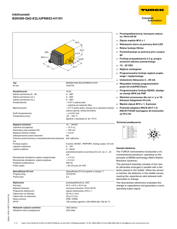 Inklinometr B2N360-Q42-E2LiUPN8X2-H1181 ■ Prostopadłościenny, tworzywo sztuczne, PA12-GF30 ■ Złącze męskie M12 x 1 ■ Wskazanie stanu za pomocą diod LED ■ Różne funkcje filtrów ■ Parametryzacja za pomocą pinu uczącego ■ Funkcja przyspieszenia ± 2 g, programowanie zakresu pomiarowego ■ 15…30 VDC ■ Wyjście analogowe ■ Programowalne funkcje wyjścia prądowego i napięciowego ■ Ustawienia fabryczne 4…20 mA Typ Nr kat. B2N360-Q42-E2LiUPN8X2-H1181 1534116 Rozdzielczość Zakres pomiarowy [A…B] Zakres pomiarowy osi x zakres pomiarowy osi y Powtarzalność 16 bit 0…360° 0…360° 0…360° ð 0.07 % pełnej skali ð zależnie od ustawień filtra ð 0.3 % pełna skala, stosuje się w obszarze funkcjonalnym górnej i dolnej hemisfery ð ± 0.015 %/K -25…+85 °C Zgodnie z aprobatą UL do +70°C Błąd liniowości Dryft temperaturowy Temperatura pracy Edition • 2016-11-09T11:10:43+01:00 Napięcie zasilania Tętnienia szczątkowe Nominalny prąd zasilania DC Napięcie testowe izolacji Zabezpieczenie przed zwarciem Ochrona przed przerwą w obwodzie/odwrotną polaryzacją Funkcja wyjścia napięcie wyjściowe wyjście prądowe 15… 30VDC ð 10 % Uss ð 150 mA ð 0.5 kV tak tak/ całkowita Rezystancja obciążenia wyjścia napięciowego Rezystancja obciążenia, wyjście prądowe Prędkość próbkowania Pobór prądu 8 pinów, NO/NZ , PNP/NPN, Analog output, IO-Link 0…10V 0…20mA parametryzowanie za pomocą IO-Link, np. 4…20 mA ï 4.7 kò ð 0.4 kò 500 Hz < 60 mA przy 24 VDC Specyfikacja IO-Link Programming Frame type Specyfikacja IO-Link zgodna z wersją 1.1 FDT/DTM 2,2 Wykonanie Wymiary Materiał obudowy Połączenie elektryczne Odporność na wibracje Odporność na uderzenia Klasa ochrony MTTF prostopadłościenna, Q42 67.5 x 42.5 x 42.5 mm tworzywo sztuczne, PA12-GF30 złącze kołnierzowe, M12 x 1 55 Hz (1 mm) 30 g (11 ms) IP68 / IP69K 159 rok/lata zgodnie z SN 29500 (Ed. 99) 40 °C Wskaźnik napięcia zasilania Wskaźnik stanu przełączenia LED zielony LED żółta 1/4 ■ Wszystkie funkcje programowalne przez IO-Link/PACTware ■ Programowalna funkcja NZ/NO, dostępne wersje NPN lub PNP ■ Wartości procesowe dla osi x i y w 16bitowym telegramie IO-Link ■ Męskie złącze M12 x 1, 8-pinowe ■ Przewód adaptera RKC8.301T-1,5RSC4T/TX320 wymagany do komunikacji IO-Link Schemat podłączenia Zasada działania The TURCK inclinometers incorporate a micromechanical pendulum, operating on the principle of MEMS technology (Mikro Elektro Mechanic Systems). The pendulum basically consists of two 'plate' electrodes arranged in parallel with a dielectric placed in the middle. When the sensor is inclined, the dielectric in the middle moves, causing the capacitance ratio between both electrodes to change. The downstream electronics evaluates this change in capacitance and generates a corresponding output signal. Hans Turck GmbH & Co.KG ñ D-45472 Mülheim an der Ruhr ñ Witzlebenstraße 7 ñ Tel. 0208 4952-0 ñ Fax 0208 4952-264 ñ [email protected] ñ www.turck.com Inklinometr B2N360-Q42-E2LiUPN8X2-H1181 Czujnik ma możliwość wyświetlania wartości dowolnego kąta w 2 osiach. Rysunek przedstawia sposób przypisania do odpowiednich osi nachylenia X lub Y. Urządzenia można konfigurować za pomocą IO-Link (zakres pomiarowy, przesunięcie punktu zerowego, okno przełączania, ustawienia filtra) i dostosowywać do aplikacji. Różne typy wyjść analogowych i dwustanowych zapewniają najwyższy stopień elastyczności na etapie integracji. 4 … 20 mA, 0 …10 V, PNP/NPN, histereza, programowalne NZ lub NO, 2 x 16 bitów (telegram Edition • 2016-11-09T11:10:43+01:00 IO-Link) 2/4 Hans Turck GmbH & Co.KG ñ D-45472 Mülheim an der Ruhr ñ Witzlebenstraße 7 ñ Tel. 0208 4952-0 ñ Fax 0208 4952-264 ñ [email protected] ñ www.turck.com Inklinometr B2N360-Q42-E2LiUPN8X2-H1181 Instrukcje uczące Parametry Wejście "teach" LED Przesunięcie punktu zerowego mostek przez 5 sek. między pinem 3 (masa) Miga dioda LED stanu (żółta), po 1 s świeci, po 3 s mi(patrz uwagi) i pinem 8 Początek zakresu pomiarowe- Mostek przez 1 sek. między pinem 1 (UB) i go, oś x (patrz uwagi) ga, po 5 s świeci Dioda LED stanu miga (zielona), po 1 sek. świeci stale pinem 8 Koniec zakresu pomiarowego, mostek przez 3 sek. między pinem 1 (UB) i Miga dioda LED stanu (zielona), po 1 s świeci, po 3 s oś x (patrz uwagi) miga pinem 8 Początek zakresu pomiarowe- Mostek przez 1 sek. między pinem 3 (masa) Dioda LED stanu miga (żółta), po 1 sek. świeci stale go, oś y (patrz uwagi) i pinem 8 Koniec zakresu pomiarowego, mostek przez 3 sek. między pinem 3 (masa) Miga dioda LED stanu (żółta), po 1 s świeci, po 3 s mioś y (patrz uwagi) i pinem 8 ga Tryb ustawień Mostek przez 10 sek. między pinem 1 (UB) i Dioda LED stanu miga (zielona), po 10 sek. świeci sta- Kątowy pinem 8. Następnie w ciągu 10 s należy za- le łączyć wejście uczące lub urządzenie automatycznie wyjdzie z tego trybu -10° … +10° pojedyncze krótkie zwarcie pinu 3 (masa) i Dioda LED (żółta) miga jednokrotnie pinu 8 -45 ° … +45 ° dwukrotne krótkie zwarcie pinu 3 (masa) i pi- Dioda LED (żółta) miga dwukrotnie nu 8 -60 ° … +60 ° trzykrotne krótkie zwarcie pinu 3 (masa) i pi- Dioda LED (żółta) miga trzykrotnie nu 8 -85 ° … +85 ° czterokrotne krótkie zwarcie pinu 3 (masa) i Dioda LED (żółta) miga czterokrotnie pinu 8 Tryb ustawień Mostek przez 10 sek. między pinem 1 (UB) i Funkcja pinem 8. Następnie w ciągu 10 s należy za- Dioda LED stanu świeci (zielona), po 10 sek. miga łączyć wejście uczące lub urządzenie automatycznie wyjdzie z tego trybu Tryb 1 “górna hemisfera”, usta- Raz na krótko mostek między pinem 1 (UB) i Dioda LED (zielona) miga jednokrotnie wienia domyślne pinem 8 Tryb 2 “dolna hemisfera” Dwukrotnie na krótko mostek między pinem Dioda LED (zielona) miga dwukrotnie 1 (UB) i pinem 8 Tryb 3, 2 x 360° Trzykrotnie na krótko mostek międz
