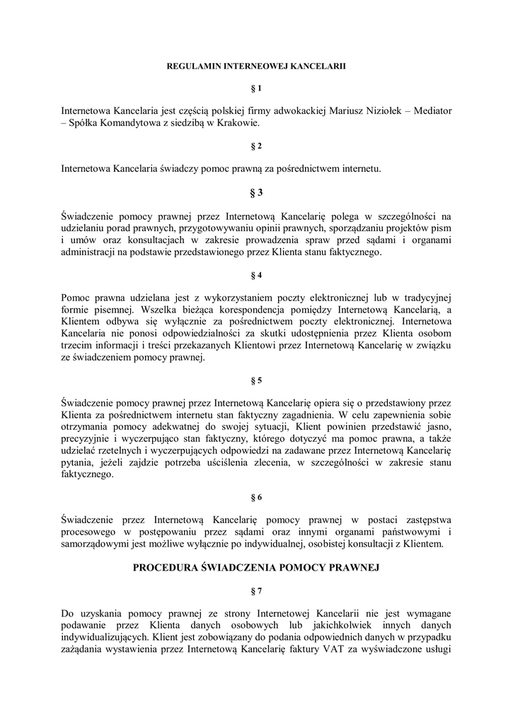 REGULAMIN INTERNEOWEJ KANCELARII §1 Internetowa Kancelaria jest częścią polskiej firmy adwokackiej Mariusz Niziołek – Mediator – Spółka Komandytowa z siedzibą w Krakowie. §2 Internetowa Kancelaria świadczy pomoc prawną za pośrednictwem internetu. §3 Świadczenie pomocy prawnej przez Internetową Kancelarię polega w szczególności na udzielaniu porad prawnych, przygotowywaniu opinii prawnych, sporządzaniu projektów pism i umów oraz konsultacjach w zakresie prowadzenia spraw przed sądami i organami administracji na podstawie przedstawionego przez Klienta stanu faktycznego. §4 Pomoc prawna udzielana jest z wykorzystaniem poczty elektronicznej lub w tradycyjnej formie pisemnej. Wszelka bieżąca korespondencja pomiędzy Internetową Kancelarią, a Klientem odbywa się wyłącznie za pośrednictwem poczty elektronicznej. Internetowa Kancelaria nie ponosi odpowiedzialności za skutki udostępnienia przez Klienta osobom trzecim informacji i treści przekazanych Klientowi przez Internetową Kancelarię w związku ze świadczeniem pomocy prawnej. §5 Świadczenie pomocy prawnej przez Internetową Kancelarię opiera się o przedstawiony przez Klienta za pośrednictwem internetu stan faktyczny zagadnienia. W celu zapewnienia sobie otrzymania pomocy adekwatnej do swojej sytuacji, Klient powinien przedstawić jasno, precyzyjnie i wyczerpująco stan faktyczny, którego dotyczyć ma pomoc prawna, a także udzielać rzetelnych i wyczerpujących odpowiedzi na zadawane przez Internetową Kancelarię pytania, jeżeli zajdzie potrzeba uściślenia zlecenia, w szczególności w zakresie stanu faktycznego. §6 Świadczenie przez Internetową Kancelarię pomocy prawnej w postaci zastępstwa procesowego w postępowaniu przez sądami oraz innymi organami państwowymi i samorządowymi jest możliwe wyłącznie po indywidualnej, osobistej konsultacji z Klientem. PROCEDURA ŚWIADCZENIA POMOCY PRAWNEJ §7 Do uzyskania pomocy prawnej ze strony Internetowej Kancelarii nie jest wymagane podawanie przez Klienta danych osobowych lub jakichkolwiek innych danych indywidualizujących. Klient jest zobowiązany do podania odpowiednich danych w przypadku zażądania wystawienia przez Internetową Kancelarię faktury VAT za wyświadczone usługi lub w przypadku żądania przesłania przez Internetową Kancelarię druków pism pocztą tradycyjną. §8 W celu uzyskania pomocy prawnej należy wysłać list elektroniczny (e-mail) na podany na internetowej stronie głównej Internetowej Kancelarii adres poczty internetowej; w liście tym, zwanym dalej "zleceniem", powinien zostać przedstawiony problem mający być przedmiotem usługi prawnej, w szczególności stan faktyczny, na podstawie którego ma być świadczona pomoc prawna wraz z wyraźnym określeniem, jakiego rodzaju pomocy prawnej Klient oczekuje od Internetowej Kancelarii (porada, opinia, projekt pisma lub umowy, konsultacje procesowe). §9 Pomoc prawna zostanie udzielona przez Internetową Kancelarię niezwłocznie po otrzymaniu Zapytania i po udzieleniu przez Klienta opłaty na wskazany przez firmę rachunek bankowy. §10 W przypadku zaistnienia konieczności wyjaśnienia lub uzupełnienia przekazanego przez Klienta zlecenia, w szczególności przedstawionego stanu faktycznego o dodatkowe dane lub informacje niezbędne do udzielenia pomocy prawnej, Internetowa Kancelaria zwróci się do Klienta z poleceniem przekazania brakujących danych lub informacji. Otrzymanie pomocy prawnej ze strony Internetowej Kancelarii uzależnione jest w takim przypadku od przekazania przez Klienta brakujących danych lub informacji. §11 Niezwłocznie po wykonaniu żądanej przez Klienta usługi - przygotowaniu porady prawnej, opinii, projektu umowy lub pisma lub też konsultacji - Internetowa Kancelaria zawiadamia o tym Klienta oraz wzywa Klienta do wyboru sposobu dostarczenia usługi oraz wyboru formy płatności, jak również do dokonania płatności w wybranej przez Klienta formie. §12 Przekazanie Klientowi przez Internetową Kancelarię porady prawnej, opinii, projektu pisma lub umowy lub też konsultacji procesowej następuje niezwłocznie po uiszczeniu przez Klienta zapłaty, dokonanej w wybranej przez Klienta formie płatności, to znaczy: w przypadku przelewu bankowego - poprzez wysłanie listu elektronicznego niezwłocznie po zasileniu rachunku Internetowej Kancelarii, w przypadku zaliczenia pocztowego - poprzez niezwłoczną wysyłkę wydruku pisma. ZAKRES USŁUG I HONORARIA §13 Honorarium za świadczenie pomocy prawnej przez Internetową Kancelarię Adwokacką wynosi 50 (pięćdziesiąt) złotych za usługę standardową plus 22 % VAT. Za wskazaną jednostkę Klient otrzymuje standardową usługę prawną w wybranej przez siebie formie w postaci pisemnej o objętości zawartości merytorycznej do 1 strony tekstu formatu A-4 w parametrach standardowych (czcionka Times New Roman rozmiar 11; wszystkie akapity 2 cm). Do objętości zawartości merytorycznej tekstu nie wlicza się opisu stanu faktycznego. §14 W przypadku sporządzania przez Internetowa Kancelarię projektu umowy lub pisma procesowego honoraium obejmuje standardową usługę w wielkości do 2 stron formatu A-4 zawartości merytorycznej tekstu. §15 W przypadku przekroczenia objętości standardowych wskazanych odpowiednio w §13 i §14, hoorarium za usługę świadczoną przez Internetową Kancelarię ulega zwiększeniu o 50 zł za każdą rozpoczętą stronę tekstu formatu A4 w parametrach standardowych plus podatek VAT 22%. §16 Wykonanie przez Internetową Kancelarię usługi z przekroczeniem standardowych wielkości, wskazanych odpowiedni w §13 i §14, może nastąpić z uzasadnionych przyczyn i po uprzednim uzyskaniu od Klienta zgody na sporządzenie pisma przekraczającego objętości standardowe. §17 W przypadku szczególnie skomplikowanego bądź obszernego stanu faktycznego Internetowa Kancelaria zastrzega sobie prawo do podwyższenia honorarium za usługę standardową. O podw