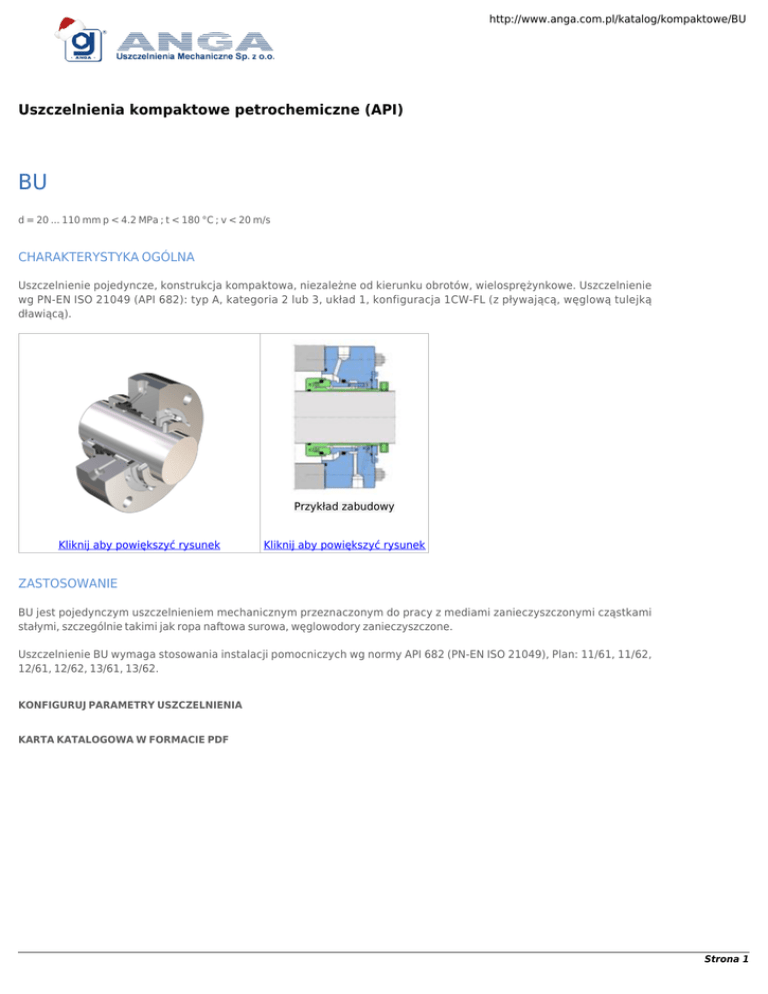 http://www.anga.com.pl/katalog/kompaktowe/BU Uszczelnienia kompaktowe petrochemiczne (API) BU d = 20 ... 110 mm p < 4.2 MPa ; t < 180 °C ; v < 20 m/s CHARAKTERYSTYKA OGÓLNA Uszczelnienie pojedyncze, konstrukcja kompaktowa, niezależne od kierunku obrotów, wielosprężynkowe. Uszczelnienie wg PN-EN ISO 21049 (API 682): typ A, kategoria 2 lub 3, układ 1, konfiguracja 1CW-FL (z pływającą, węglową tulejką dławiącą). Przykład zabudowy Kliknij aby powiększyć rysunek Kliknij aby powiększyć rysunek ZASTOSOWANIE BU jest pojedynczym uszczelnieniem mechanicznym przeznaczonym do pracy z mediami zanieczyszczonymi cząstkami stałymi, szczególnie takimi jak ropa naftowa surowa, węglowodory zanieczyszczone. Uszczelnienie BU wymaga stosowania instalacji pomocniczych wg normy API 682 (PN-EN ISO 21049), Plan: 11/61, 11/62, 12/61, 12/62, 13/61, 13/62. KONFIGURUJ PARAMETRY USZCZELNIENIA KARTA KATALOGOWA W FORMACIE PDF Strona 1