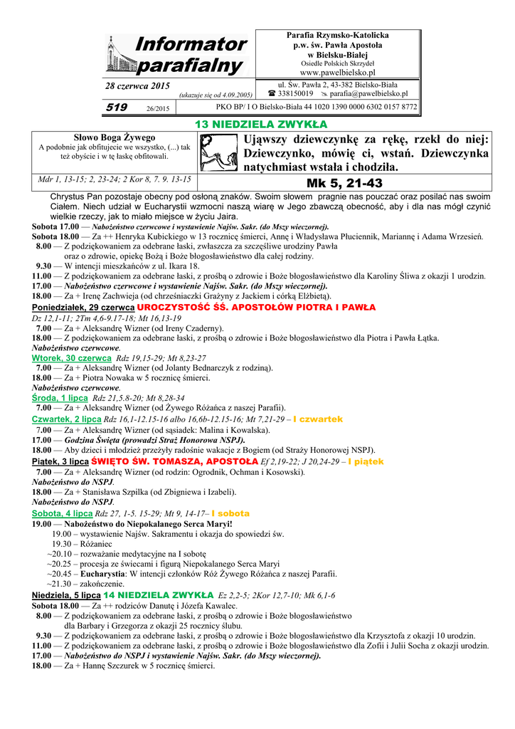 Parafia Rzymsko-Katolicka p.w. św. Pawła Apostoła w Bielsku-Białej Osiedle Polskich Skrzydeł www.pawelbielsko.pl 28 czerwca 2015 (ukazuje się od 4.09.2005) 519 26/2015 ul. Św. Pawła 2, 43-382 Bielsko-Biała 338150019 [email protected] PKO BP/ I O Bielsko-Biała 44 1020 1390 0000 6302 0157 8772 13 NIEDZIELA ZWYKŁA Słowo Boga Żywego A podobnie jak obfitujecie we wszystko, (...) tak też obyście i w tę łaskę obfitowali. Mdr 1, 13-15; 2, 23-24; 2 Kor 8, 7. 9. 13-15 Ująwszy dziewczynkę za rękę, rzekł do niej: Dziewczynko, mówię ci, wstań. Dziewczynka natychmiast wstała i chodziła. Mk 5, 21-43 Chrystus Pan pozostaje obecny pod osłoną znaków. Swoim słowem pragnie nas pouczać oraz posilać nas swoim Ciałem. Niech udział w Eucharystii wzmocni naszą wiarę w Jego zbawczą obecność, aby i dla nas mógł czynić wielkie rzeczy, jak to miało miejsce w życiu Jaira. Sobota 17.00 — Nabożeństwo czerwcowe i wystawienie Najśw. Sakr. (do Mszy wieczornej). Sobota 18.00 — Za ++ Henryka Kubickiego w 13 rocznicę śmierci, Annę i Władysława Płuciennik, Mariannę i Adama Wrzesień. 8.00 — Z podziękowaniem za odebrane łaski, zwłaszcza za szczęśliwe urodziny Pawła oraz o zdrowie, opiekę Bożą i Boże błogosławieństwo dla całej rodziny. 9.30 — W intencji mieszkańców z ul. Ikara 18. 11.00 — Z podziękowaniem za odebrane łaski, z prośbą o zdrowie i Boże błogosławieństwo dla Karoliny Śliwa z okazji 1 urodzin. 17.00 — Nabożeństwo czerwcowe i wystawienie Najśw. Sakr. (do Mszy wieczornej). 18.00 — Za + Irenę Zachwieja (od chrześniaczki Grażyny z Jackiem i córką Elżbietą). Poniedziałek, 29 czerwca UROCZYSTOŚĆ ŚŚ. APOSTOŁÓW PIOTRA I PAWŁA Dz 12,1-11; 2Tm 4,6-9.17-18; Mt 16,13-19 7.00 — Za + Aleksandrę Wizner (od Ireny Czaderny). 18.00 — Z podziękowaniem za odebrane łaski, z prośbą o zdrowie i Boże błogosławieństwo dla Piotra i Pawła Łątka. Nabożeństwo czerwcowe. Wtorek, 30 czerwca Rdz 19,15-29; Mt 8,23-27 7.00 — Za + Aleksandrę Wizner (od Jolanty Bednarczyk z rodziną). 18.00 — Za + Piotra Nowaka w 5 rocznicę śmierci. Nabożeństwo czerwcowe. Środa, 1 lipca Rdz 21,5.8-20; Mt 8,28-34 7.00 — Za + Aleksandrę Wizner (od Żywego Różańca z naszej Parafii). Czwartek, 2 lipca Rdz 16,1-12.15-16 albo 16,6b-12.15-16; Mt 7,21-29 – I czwartek 7.00 — Za + Aleksandrę Wizner (od sąsiadek: Malina i Kowalska). 17.00 — Godzina Święta (prowadzi Straż Honorowa NSPJ). 18.00 — Aby dzieci i młodzież przeżyły radośnie wakacje z Bogiem (od Straży Honorowej NSPJ). Piątek, 3 lipca ŚWIĘTO ŚW. TOMASZA, APOSTOŁA Ef 2,19-22; J 20,24-29 – I piątek 7.00 — Za + Aleksandrę Wizner (od rodzin: Ogrodnik, Ochman i Kosowski). Nabożeństwo do NSPJ. 18.00 — Za + Stanisława Szpilka (od Zbigniewa i Izabeli). Nabożeństwo do NSPJ. Sobota, 4 lipca Rdz 27, 1-5. 15-29; Mt 9, 14-17– I sobota 19.00 — Nabożeństwo do Niepokalanego Serca Maryi! 19.00 – wystawienie Najśw. Sakramentu i okazja do spowiedzi św. 19.30 – Różaniec ~20.10 – rozważanie medytacyjne na I sobotę ~20.25 – procesja ze świecami i figurą Niepokalanego Serca Maryi ~20.45 – Eucharystia: W intencji członków Róż Żywego Różańca z naszej Parafii. ~21.30 – zakończenie. Niedziela, 5 lipca 14 NIEDZIELA ZWYKŁA Ez 2,2-5; 2Kor 12,7-10; Mk 6,1-6 Sobota 18.00 — Za ++ rodziców Danutę i Józefa Kawalec. 8.00 — Z podziękowaniem za odebrane łaski, z prośbą o zdrowie i Boże błogosławieństwo dla Barbary i Grzegorza z okazji 25 rocznicy ślubu. 9.30 — Z podziękowaniem za odebrane łaski, z prośbą o zdrowie i Boże błogosławieństwo dla Krzysztofa z okazji 10 urodzin. 11.00 — Z podziękowaniem za odebrane łaski, z prośbą o zdrowie i Boże błogosławieństwo dla Zofii i Julii Socha z okazji urodzin. 17.00 — Nabożeństwo do NSPJ i wystawienie Najśw. Sakr. (do Mszy wieczornej). 18.00 — Za + Hannę Szczurek w 5 rocznicę śmierci. OGŁOSZENIA DUSZPASTERSKIE Jutro przypada uroczystość Świętych Apostołów Piotra i Pawła. Składka przeznaczona jest na Świętopietrze czyli na dzieła, które realizuje Stolica Apostolska. 2. W tym tygodniu przypadają I czwartek, I piątek i I sobota miesiąca: • w czwartek od godz. 1700 Godzina Święta, którą poprowadzi Straż Honorowa NSPJ, w tym czasie okazja do spowiedzi św. przed I piątkiem (!); w czasie Mszy św. Komunia pod obiema postaciami; • w piątek po rannej i wieczornej Mszy św. nabożeństwo do NSPJ; • w sobotę po I piątku odwiedziny chorych z Komunią św. – prosimy o zgłaszanie ich w zakrystii; • od godz. 1900 w sobotę nabożeństwo do Niepokalanego Serca Maryi. 3. Porządek Mszy św. w lipcu i sierpniu będzie następujący: Niedziela: bez zmian; W tygodniu: poniedziałek, środa i piątek: 700; wtorek, czwartek i sobota: 1800; I czwartek i I piątek: 700 i 1800. 1. DIAKONIA SPRZĄTANIA Również w tym tygodniu nie było nikogo do sprzątania kościoła (tym razem z Trzech Diamentów 34!). W najbliższym tygodniu o posługę czystości z wystrojem kwiatowym prosimy mieszkańców z ul. Trzech Diamentów 36. 50-LECIE KORONACJI OBRAZU MATKI BOŻEJ RYCHWAŁDZKIEJ W niedzielę, 19 lipca 2015 roku, wspólnota parafialna w Rychwałdzie zaprasza na Uroczystość Złotego Jubileuszu Koronacji łaskami słynącego Obrazu Matki Bożej Rychwałdzkiej. Liturgii będzie przewodniczył Ksiądz Arcybiskup Wojciech Polak, metropolita gnieźnieński i Prymas Polski. Rozpoczęcie uroczystości o godzinie 1400. Szczegółowy plan można znaleźć na stronie internetowej sanktuarium: www.rychwald.franciszkanie.pl. Informacje znajdują się po prawej stronie w zakładce aktualności. PIELGRZYMKA CHORYCH NA JASNĄ GÓRĘ W poniedziałek, 6 lipca br. odbędzie się 50. Jubileuszowa Ogólnopolska Pielgrzymka Osób Chorych, Niepełnosprawnych i Starszych na Jasną Górę. Rozpoczęcie o godzinie 1000 w Bazylice Jasnogórskiej. O godzinie 1100 Msza święta 