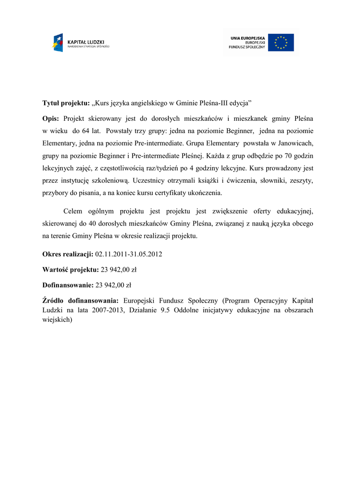 Tytuł projektu: „Kurs języka angielskiego w Gminie Pleśna-III edycja” Opis: Projekt skierowany jest do dorosłych mieszkańców i mieszkanek gminy Pleśna w wieku do 64 lat. Powstały trzy grupy: jedna na poziomie Beginner, jedna na poziomie Elementary, jedna na poziomie Pre-intermediate. Grupa Elementary powstała w Janowicach, grupy na poziomie Beginner i Pre-intermediate Pleśnej. Każda z grup odbędzie po 70 godzin lekcyjnych zajęć, z częstotliwością raz/tydzień po 4 godziny lekcyjne. Kurs prowadzony jest przez instytucję szkoleniową. Uczestnicy otrzymali książki i ćwiczenia, słowniki, zeszyty, przybory do pisania, a na koniec kursu certyfikaty ukończenia. Celem ogólnym projektu jest projektu jest zwiększenie oferty edukacyjnej, skierowanej do 40 dorosłych mieszkańców Gminy Pleśna, związanej z nauką języka obcego na terenie Gminy Pleśna w okresie realizacji projektu. Okres realizacji: 02.11.2011-31.05.2012 Wartość projektu: 23 942,00 zł Dofinansowanie: 23 942,00 zł Źródło dofinansowania: Europejski Fundusz Społeczny (Program Operacyjny Kapitał Ludzki na lata 2007-2013, Działanie 9.5 Oddolne inicjatywy edukacyjne na obszarach wiejskich)