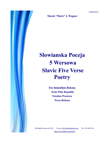 10/04/2014 Marek “Mark” J. Wagner Slowianska Poezja 5 Wersowa Slavic Five Verse Poetry For Immediate Release from Pink Republic Notatka Prasowa Press Release All All Rights Reserved 2014 E-mai: [email protected] http://www.zhibit.org/mjw23 Tel: 536 508 394 SLOWIANSKA POEZJA 5 WERSOWA Szanowni Panstwo, Pragne przedstawic Slowianska Poezja 5wersowa: Styl: * Tytul * 5 wersow * Wolna forma, rym moze byc, ale nie musi * Rytm jest waznym elementem Slowianskiej Poezji Pieciowersowej * Temat: pozytywny, budujacy, tolerancyjny, czlowiek, natura, kosmos, duchowosc, historia, czasy wspolczesne, przyszlosc, muzyka, folozofia, srodowisko, spoleczenstwo, rasa, nie moze zawierac tresci dyskryminacyjnych lub obrazliwych (wyrazow, porownan, opinii). Przytulanie Przytul się do tęsknot, Jak motyl zimowy, Popłyń w myśli gorące, Biesiadne, Wolne… . Marzenia Czy wiesz, Jak patrzeć na sny ? Zamknij oczy, płyń, W zwierciadle złotego księżyca, Czytaj światła gwiazd, molekuł wszechświata … . Zwierciadlo Ocuć zwierciadło Świadomością, I popatrz, na kogoś, Siebie samego ? Może innego … . Slowianski Zagiel Ożywić żagle, Ułożyć blask myśli Szlachetnych, U stóp góry, Z żyznym wiaterkiem mądrości … . Muza Ukradnij ze źródełka, Choćby kropelkę, I tak wróci, W cudownym rynsztunku Życia, natchnienia … . Piesc Nadzieje Popieść nadzieje, Codziennie, Rano, w południe, Z wieczora, W nocy zapuści korzenie … . Tropiciel Snu Jeśli szukasz w rzekach, Jeziorach, snów, Musisz złapać kroplę wody, W emaliowane dłonie Czaru przeznaczeń … . Przelewajki Wylej z dzbana gwiazdozbiorów, Myśli ciche, Kolory, kształty, Namaszczone Pluskaniem blasku, cudownych twych oczu … . SLAVIC FIVE VERSE POETRY I would like to introduce Five Verse Slavic Poetry Philosophical Positive Uplifting Humanstic Spiritual Sensitive I have been writing a poetry for decades, including five verse, brief, yet elegant, descriptive, eloquent, appealing compositon. Five verse poetry can become a life time journey into the new experience, passion, literary exploration. Style: * Title * Five verses * Free form, rhyme non essential * Rhythm shall be present * Theme: positive, uplifting, libertarian, meritoric subjects of literary exploration, such as human, nature, cosmos, spirituality, history, modern times, future, music, philosophy, environment, social, race, ethnic, religiously sensitive, non discriminative themes. Five verse poem is well balanced, harmonious, and very efficient in terms of content. Five verse composition can deliver great depth of thought, as well as artistic style, often intricate, fine style preferred by writer. I would like to encourage you to exercise the style of five verse poems, yet, please bring to the light best of man has to offer, which means no offensive language, etc. My first five verse poems I wrote in the United States. After 2010 I have been writing poetry, including five verses in Poland. SLAVIC FIVE VERSE POETRY Universe What is universe ? Imagine, look up, Count stars, galaxies, Speed of particles, purpose, Divine breath dwell in self … . Infinity Is there an end ? Universe, multiplying matter in great variety, Vast, harmonious space, Transform density, shapes, Milky Way among many, The Primary Law of Transformation, rhythmical dance … . Museum In museum of art, Internal light, perception, Fulfill Paramount feelings, masterpiece, Curve, shape pristine transcendence… . Greetings Good Morning, Do you pay attention ? Good Night, Do you understand ? Words dwell in meaning, liberated space … . Erotica Gorgeous hair, Silky skin, vivid lips, Fresh, never touched, dew of pleasure, Still chase memory space, Precious, blooming reward, forever … . Great Battle of Poetry III No prisoners! In a great battle of poetry, Fearless, ancient soldiers, Authenticity, Defeat linguistic prostitution, blasphemy … . Gladiator’s Taste Garrison of maidens, In disobedient parlor, Under the sun, blue sky, Fresh dew, weeping at twilight, Slender, seductive, radiant … . Zwracam sie z propozycja promocji Slowianskiej Poezji 5 Wersowej. Proponuje: * spotkania autorskie * spotkania poetyckie * festiwale * informacje w prasie, mediach * konkursy poetyckie szkolne, srodowiskowe. Rzeka, nie jest przemijaniem, Lecz transformacją Życia, pluskiem przeznaczeń, Grą światła i cienia … . Z tomiku: „Poezje Kropla Pisane” 2004 Z powazaniem, Marek “Mark” J. Wagner http://pinkrepublic1.wordpress.com/2014/04/11/five-verse-slavic-polish-poetry/ https://www.facebook.com/groups/552304321552273/ All Rights Reserved 2014 E-mai: [email protected] Tel: 536 508 394 http://www.zhibit.org/mjw23