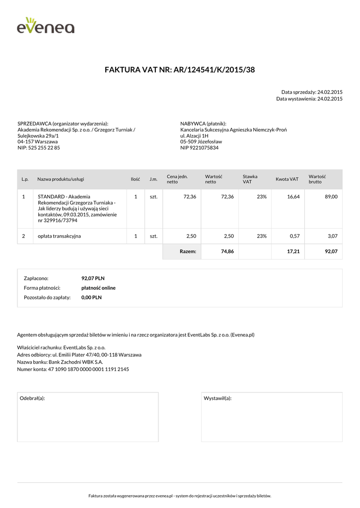 FAKTURA VAT NR: AR/124541/K/2015/38 Data sprzedaży: 24.02.2015 Data wystawienia: 24.02.2015 SPRZEDAWCA (organizator wydarzenia): Akademia Rekomendacji Sp. z o.o. / Grzegorz Turniak / Sulejkowska 29a/1 04-157 Warszawa NIP: 525 255 22 85 L.p. Nazwa produktu/usługi 1 2 NABYWCA (płatnik): Kancelaria Sukcesyjna Agnieszka Niemczyk-Proń ul. Alzacji 1H 05-509 Józefosław NIP 9221075834 Cena jedn. netto Wartość netto Stawka VAT J.m. STANDARD - Akademia Rekomendacji Grzegorza Turniaka Jak liderzy budują i używają sieci kontaktów, 09.03.2015, zamówienie nr 329916/73794 1 szt. 72,36 72,36 23% 16,64 89,00 opłata transakcyjna 1 szt. 2,50 2,50 23% 0,57 3,07 Razem: 74,86 17,21 92,07 Zapłacono: 92,07 PLN Forma płatności: płatność online Pozostało do zapłaty: 0,00 PLN Agentem obsługującym sprzedaż biletów w imieniu i na rzecz organizatora jest EventLabs Sp. z o.o. (Evenea.pl) Właściciel rachunku: EventLabs Sp. z o.o. Adres odbiorcy: ul. Emilii Plater 47/40, 00-118 Warszawa Nazwa banku: Bank Zachodni WBK S.A. Numer konta: 47 1090 1870 0000 0001 1191 2145 Odebrał(a): Wystawił(a): Faktura została wygenerowana przez evenea.pl - system do rejestracji uczestników i sprzedaży biletów. Kwota VAT Wartość brutto Ilość