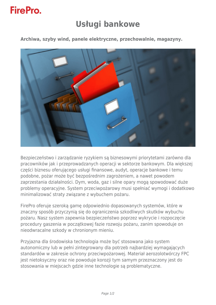 Usługi bankowe Archiwa, szyby wind, panele elektryczne, przechowalnie, magazyny. Bezpieczeństwo i zarządzanie ryzykiem są biznesowymi priorytetami zarówno dla pracowników jak i przeprowadzanych operacji w sektorze bankowym. Dla większej części biznesu oferującego usługi finansowe, audyt, operacje bankowe i temu podobne, pożar może być bezpośrednim zagrożeniem, a nawet powodem zaprzestania działalności. Dym, woda, gaz i silne opary mogą spowodować duże problemy operacyjne. System przeciwpożarowy musi spełniać wymogi i dodatkowo minimalizować straty związane z wybuchem pożaru. FirePro oferuje szeroką gamę odpowiednio dopasowanych systemów, które w znaczny sposób przyczynią się do ograniczenia szkodliwych skutków wybuchu pożaru. Nasz system zapewnia bezpieczeństwo poprzez wykrycie i rozpoczęcie procedury gaszenia w początkowej fazie rozwoju pożaru, zanim spowoduje on nieodwracalne szkody w chronionym mieniu. Przyjazna dla środowiska technologia może być stosowana jako system autonomiczny lub w pełni zintegrowany dla potrzeb najbardziej wymagających standardów w zakresie ochrony przeciwpożarowej. Materiał aerozolotwórczy FPC jest nietoksyczny oraz nie powoduje korozji tym samym przeznaczony jest do stosowania w miejscach gdzie inne technologie są problematyczne. Page 1/2 Page 2/2