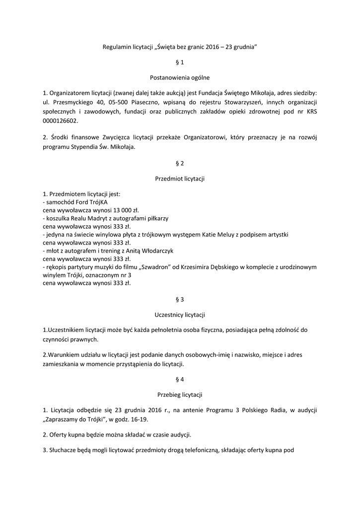 Regulamin licytacji „Święta bez granic 2016 – 23 grudnia” §1 Postanowienia ogólne 1. Organizatorem licytacji (zwanej dalej także aukcją) jest Fundacja Świętego Mikołaja, adres siedziby: ul. Przesmyckiego 40, 05-500 Piaseczno, wpisaną do rejestru Stowarzyszeń, innych organizacji społecznych i zawodowych, fundacji oraz publicznych zakładów opieki zdrowotnej pod nr KRS 0000126602. 2. Środki finansowe Zwycięzca licytacji przekaże Organizatorowi, który przeznaczy je na rozwój programu Stypendia Św. Mikołaja. §2 Przedmiot licytacji 1. Przedmiotem licytacji jest: - samochód Ford TrójKA cena wywoławcza wynosi 13 000 zł. - koszulka Realu Madryt z autografami piłkarzy cena wywoławcza wynosi 333 zł. - jedyna na świecie winylowa płyta z trójkowym występem Katie Meluy z podpisem artystki cena wywoławcza wynosi 333 zł. - młot z autografem i trening z Anitą Włodarczyk cena wywoławcza wynosi 333 zł. - rękopis partytury muzyki do filmu „Szwadron” od Krzesimira Dębskiego w komplecie z urodzinowym winylem Trójki, oznaczonym nr 3 cena wywoławcza wynosi 333 zł. §3 Uczestnicy licytacji 1.Uczestnikiem licytacji może być każda pełnoletnia osoba fizyczna, posiadająca pełną zdolność do czynności prawnych. 2.Warunkiem udziału w licytacji jest podanie danych osobowych-imię i nazwisko, miejsce i adres zamieszkania w momencie przystąpienia do licytacji. §4 Przebieg licytacji 1. Licytacja odbędzie się 23 grudnia 2016 r., na antenie Programu 3 Polskiego Radia, w audycji „Zapraszamy do Trójki”, w godz. 16-19. 2. Oferty kupna będzie można składać w czasie audycji. 3. Słuchacze będą mogli licytować przedmioty drogą telefoniczną, składając oferty kupna pod nr telefonu 22 33 33 333 (koszt połączenia uzależniony od taryfy operatora). 4. Składając propozycje kwot licytacji, słuchacze podają za każdym razem deklarowaną kwotę oraz imię i nazwisko licytującego. Telefony anonimowe nie będą brane pod uwagę. 5. Cena podbicia oferowana przez uczestników Licytacji jest jawna dla innych uczestników (o każdym przebiciu prowadzący audycję będzie informował słuchaczy). 6. Licytację wygrywa uczestnik, który do momentu zakończenia licytacji złożył najwyższą ofertę. 7. Oferta staje się wiążąca z chwilą udzielenia przybicia, o czym prowadzący audycję poinformuje słuchaczy na antenie. Przybicie jest ustnym oświadczeniem woli o przyjęciu oferty zgłoszonej w toku aukcji. 8. Organizatorowi przysługuje prawo dochodzenia wylicytowanej kwoty wraz z odsetkami do dnia zapłaty na drodze postępowania sądowego. 9. Zwycięzcy licytacji nie przysługuje prawo odstąpienia. 10. W razie zgłoszenia przez co najmniej dwóch uczestników licytacji jednakowych cen danego przedmiotu pierwszeństwo ma oferta zgłoszona wcześniej (decyduje czas odebrania telefonu). 11. W przypadku nie wpłacenia wylicytowanej kwoty w określonym terminie przez licytanta z najwyższą ofertą i nie skorzystania przez Organizatora z prawa wskazanego w ust 8, prawo do nabycia przedmiotu przechodzi na następnego licytanta, który złożył drugą co do wartości ofertę. 12. Imię i miejsce zamieszkania zwycięzcy licytacji może zostać podane na antenie Trójki oraz na stronie internetowej. §5 Zapłata ceny nabycia i wydanie wylicytowanego przedmiotu 1. Zwycięzca licytacji zobowiązany jest do zapłacenia ceny nabycia do 2 stycznia 2016 r., na wskazany rachunek bankowy Fundacji Świętego Mikołaja: Volkswagen Bank Polska S.A. 37 2130 0004 2001 0299 9993 0002 Ul. Przesmyckiego 40 05-500 Piaseczno W tytule przelewu należy wpisać „Trójka - Święta bez granic 2016”. 2. Wydanie wylicytowanego przedmiotu nastąpi po dokonaniu przez Zwycięzcę wpłaty na podane konto. 3. Szczegóły dotyczące sposobu odebrania przedmiotu zostaną ustalone ze Zwycięzcą licytacji. 4. Zwycięzca licytacji jest zobowiązany do odebrania przedmiotu do końca stycznia 2017 r. §6 Przetwarzanie danych Poprzez przystąpienie do licytacji, uczestnik biorący w niej udział akceptuje postanowienia niniejszego Regulaminu oraz wyraża zgodę na przetwarzanie jego danych osobowych, w zakresie niezbędnym do prawidłowej realizacji wszelkich czynności związanych z licytacją, jej zakończeniem i odbiorem wylicytowanego przedmiotu. Dane osobowe uczestnika będą przetwarzane wyłącznie doraźnie. Dane te będą przechowywane tylko przez okres, jaki wymagają tego obowiązujące przepisy prawa, a po jego zakończeniu zostaną usunięte. Administratorem danych osobowych udostępnionych przez uczestników jest Organizator oraz Polskie Radio S.A. Podanie danych osobowych jest dobrowolne, jednak ich niepodanie uniemożliwia udział w licytacji. Każdy uczestnik licytacji posiada prawo wglądu do swoich danych osobowych, do ich poprawiania oraz żądania ich usunięcia. Dane osobowe będą przetwarzane zgodnie z przepisami ustawy z dnia 29 sierpnia 1997r. o ochronie danych osobowych (tj.: Dz.U. 2016.922 j.t.). §7 Reklamacje 1.Wszelkie reklamacje mogą być kierowane na adres: Trójka Polskie Radio S.A., ul. Myśliwiecka 3/5/7, 00-977 Warszawa. 2. Złożone przez Uczestników reklamacje będą rozpatrywane w terminie 14 dni od dnia otrzymania. O rozpatrzeniu reklamacji Uczestnik zostanie powiadomiony pisemnie.