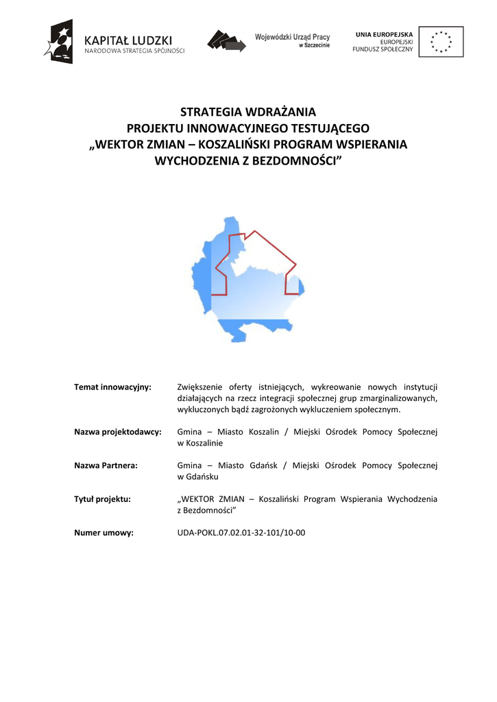 STRATEGIA WDRAŻANIA PROJEKTU INNOWACYJNEGO TESTUJĄCEGO „WEKTOR ZMIAN – KOSZALIOSKI PROGRAM WSPIERANIA WYCHODZENIA Z BEZDOMNOŚCI” Temat innowacyjny: Zwiększenie oferty istniejących, wykreowanie nowych instytucji działających na rzecz integracji społecznej grup zmarginalizowanych, wykluczonych bądź zagrożonych wykluczeniem społecznym. Nazwa projektodawcy: Gmina – Miasto Koszalin / Miejski Ośrodek Pomocy Społecznej w Koszalinie Nazwa Partnera: Gmina – Miasto Gdaosk / Miejski Ośrodek Pomocy Społecznej w Gdaosku Tytuł projektu: „WEKTOR ZMIAN – Koszalioski Program Wspierania Wychodzenia z Bezdomności” Numer umowy: UDA-POKL.07.02.01-32-101/10-00 Spis treści I UZASADNIENIE ................................................................................................................................ 1 Opis i przyczyny problemów, ich skala i konsekwencje .......................................................................................1 II CEL WPROWADZENIA INNOWACJI ........................................................................................ 4 III OPIS INNOWACJI, W TYM PRODUKTU FINALNEGO ......................................................... 6 Na czym polega innowacja..................................................................................................................................6 Grupy docelowe ..................................................................................................................................................7 Warunki konieczne aby innowacja działała skutecznie .......................................................................................8 Jakie efekty może przynieśd zastosowanie innowacji .........................................................................................8 IV PLAN DZIAŁAŃ W PROCESIE TESTOWANIA PRODUKTU FINALNEGO....................... 9 Opis grupy Użytkowników i Odbiorców na etapie testowania ...........................................................................9 Opis przebiegu testowania ................................................................................................................................10 Charakterystyka materiałów, jakie otrzymają uczestnicy .................................................................................11 Zakres monitoringu procesu testowania ...........................................................................................................11 V SPOSÓB SPRAWDZENIA, CZY INNOWACJA DZIAŁA ........................................................ 12 Efekty zastosowania innowacji uzasadniające jej stosowanie na szerszą skalę ...............................................12 Sposób dokonania oceny wyników testowania oraz przeprowadzenie ewaluacji zewnętrznej ......................12 VI STRATEGIA UPOWSZECHNIANIA ........................................................................................ 14 Cel działao upowszechniających .......................................................................................................................14 Grupy docelowe ................................................................................................................................................14 Plan działao etapu upowszechniania ................................................................................................................15 VII STRATEGIA WŁĄCZANIA DO GŁÓWNEGO NURTU POLITYKI ................................... 16 Cel działao włączających ...................................................................................................................................16 Grupy docelowe ................................................................................................................................................16 Plan działao etapu włączania ............................................................................................................................16 VIII KAMIENIE MILOWE II ETAPU PROJEKTU ...................................................................... 16 IX ANALIZA RYZYKA ..................................................................................................................... 16 I. Uzasadnienie 1. Opis i przyczyny problemów, ich skala i konsekwencje Bezdomnośd stanowi jeden z najtrudniejszych i najbardziej złożonych problemów społecznych. W Polsce kilkukrotnie podejmowano próby zbadania skali zjawiska bezdomności (m.in. spis powszechny, raporty MPiPS, sprawozdania z realizacji programów ministerialnych). Wyniki nie zostały opublikowane ze względu na trudności z dotarciem do os. bezdomnych przebywających w miejscach niemieszkalnych i związaną z tym niedokładnością wyników. W 2010 r. na zlecenie MPiPS wykonano badanie polegające na spisie osób korzystających ze schronisk i noclegowni w nocy z 26/27 stycznia. W skali kraju zarejestrowano 20.960 os. (w woj. zachodniopomorskim 1 366). W badaniu podkreślono niedokładnośd związaną z trudnością w dotarciu do wszystkich osób. Statystyki MOPS dotyczące liczby osób, którym udzielono pomocy z tytułu bezdomności mówią o 110 osobach w r. 2009 oraz 88 osobach w r. 2008. Statystyki noclegów w Schronisku dla Bezdomnych mówią o 287 osobach w 2010 r., 207 w 2009 r., 159 w 2008 roku korzystających z tej formy pomocy. Ze schronienia w Centrum Kryzysowym dla kobiet z dziedmi w l. 2005-2009 skorzystało łącznie 178 osób (82 kobiet i 96 dzieci). Jak do tej pory nie prowadzono na terenie miasta badao jakościowych populacji osób bezdomnych. Brak dokładnych badao ilościowych i jakościowych oraz genezy stanowi dużą barierę nie tylko w określeniu rzeczywistej skali zjawiska oraz jego bezpośrednich przyczyn ale też jest źródłem problemu, bo uniemożliwia przygotowanie form pomocy adekwatnych do rzeczywistych potrzeb Odbiorców oraz diagnozowanie obszarów niedoboru wśród dostępnych już form wsparcia w celu poprawy 