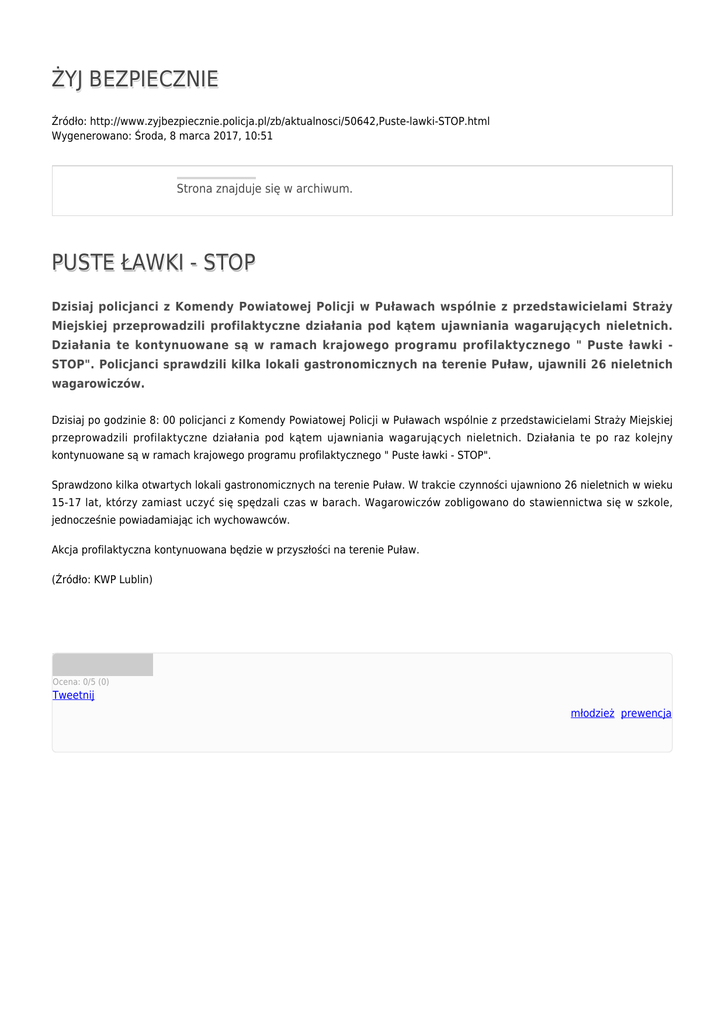 ŻYJ BEZPIECZNIE Źródło: http://www.zyjbezpiecznie.policja.pl/zb/aktualnosci/50642,Puste-lawki-STOP.html Wygenerowano: Środa, 8 marca 2017, 10:51 Strona znajduje się w archiwum. PUSTE ŁAWKI - STOP Dzisiaj policjanci z Komendy Powiatowej Policji w Puławach wspólnie z przedstawicielami Straży Miejskiej przeprowadzili profilaktyczne działania pod kątem ujawniania wagarujących nieletnich. Działania te kontynuowane są w ramach krajowego programu profilaktycznego " Puste ławki STOP". Policjanci sprawdzili kilka lokali gastronomicznych na terenie Puław, ujawnili 26 nieletnich wagarowiczów. Dzisiaj po godzinie 8: 00 policjanci z Komendy Powiatowej Policji w Puławach wspólnie z przedstawicielami Straży Miejskiej przeprowadzili profilaktyczne działania pod kątem ujawniania wagarujących nieletnich. Działania te po raz kolejny kontynuowane są w ramach krajowego programu profilaktycznego " Puste ławki - STOP". Sprawdzono kilka otwartych lokali gastronomicznych na terenie Puław. W trakcie czynności ujawniono 26 nieletnich w wieku 15-17 lat, którzy zamiast uczyć się spędzali czas w barach. Wagarowiczów zobligowano do stawiennictwa się w szkole, jednocześnie powiadamiając ich wychowawców. Akcja profilaktyczna kontynuowana będzie w przyszłości na terenie Puław. (Źródło: KWP Lublin) Ocena: 0/5 (0) Tweetnij młodzież, prewencja