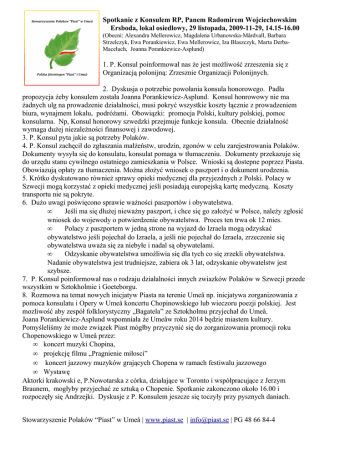 Spotkanie z Konsulem RP, Panem Radomirem Wojciechowskim Ersboda, lokal osiedlowy, 29 listopada, 2009-11-29, 14.15-16.00 (Obecni: Alexandra Mellerowicz, Magdalena Urbanowska-Mårdvall, Barbara Strzelczyk, Ewa Porankiewicz, Ewa Mellerowicz, Iza Blaszczyk, Marta DerbaMaceluch, Joanna Porankiewicz-Asplund) 1. P. Konsul poinformował nas że jest możliwość zrzeszenia się z Organizacją polonijną: Zrzesznie Organizacji Polonijnych. 2. Dyskusja o potrzebie powołania konsula honorowego. Padła propozycja żeby konsulem została Joanna Porankiewicz-Asplund. Konsul honrowowy nie ma żadnych ulg na prowadzenie działalności, musi pokryć wszystkie koszty łącznie z prowadzeniem biura, wynajmem lokalu, podróżami. Obowiązki: promocja Polski, kultury polskiej, pomoc konsularna. Np, Konsul honorowy szwedzki przejmuje funkcje konsula. Obecnie działalność wymaga dużej niezależności finansowej i zawodowej. 3. P. Konsul pyta jakie są potrzeby Polaków. 4. P. Konsul zachęcił do zgłaszania małżeństw, urodzin, zgonów w celu zarejestrowania Polaków. Dokumenty wysyła się do konsulatu, konsulat pomaga w tłumaczeniu. Dokumenty przekazuje się do urzędu stanu cywilnego ostatniego zamieszkania w Polsce. Wnioski są dostepne poprzez Piasta. Obowiazują opłaty za tłumaczenia. Można złożyć wniosek o paszport i o dokument urodzenia. 5. Krótko dyskutowano również sprawy opieki medycznej dla przyjezdnych z Polski. Polacy w Szwecji mogą korzystać z opieki medycznej jeśli posiadają europejską kartę medyczną. Koszty transportu nie są pokryte. 6. Dużo uwagi poświęcono sprawie ważności paszportów i obywatelstwa. • Jeśli ma się dłużej nieważny paszport, i chce się go założyć w Polsce, należy zgłosić wniosek do wojewody o potwierdzenie obywatelstwa. Proces ten trwa ok 12 mies. • Polacy z paszportem w jedną strone na wyjazd do Izraela mogą odzyskać obywatelstwo jeśli pojechał do Izraela, a jeśli nie pojechał do Izraela, zrzeczenie się obywatelstwa uważa się za niebyłe i nadal są obywatelami. • Odzyskanie obywatelstwa umożliwia się dla tych co się zrzekli obywatelstwa. Nadanie obywatelstwa jest trudniejsze, zabiera ok 3 lat, odzyskanie obywatelstw jest szybsze. 7. P. Konsul poinformował nas o rodzaju działalności innych zwiazków Polaków w Szwecji przede wszystkim w Sztokholmie i Goeteborgu. 8. Rozmowa na temat nowych inicjatyw Piasta na terenie Umeå np. inicjatywa zorganizowania z pomoca konsulatu i Opery w Umeå koncertu Chopinowskiego lub wieczoru poezji polskiej. Jest mozliwość aby zespół folklorystyczny „Bagatela” ze Sztokholmu przyjechał do Umeå. Joana Porankiewicz-Asplund wspomniała że Umeåw roku 2014 będzie miastem kultury. Pomyśleliśmy że może związek Piast mógłby przyczynić się do zorganizowania promocji roku Chopenowskiego w Umeå przez: • koncert muzyki Chopina, • projekcję filmu „Pragnienie miłosci” • koncert jazzowy muzyków grających Chopena w ramach festiwalu jazzowego • Wystawę Aktorki krakowski e, P.Nowotarska z córka, działające w Toronto i współpracujące z Jerzym Braunem, mogłyby przyjechać ze sztuką o Chopenie. Spotkanie zakonczono około 16.00 i rozpoczęły się Andrzejki. Dyskusje z P. Konsulem jeszcze się toczyły przy pysznych daniach. Stowarzyszenie Polaków “Piast” w Umeå | www.piast.se | [email protected] | PG 48 66 84-4