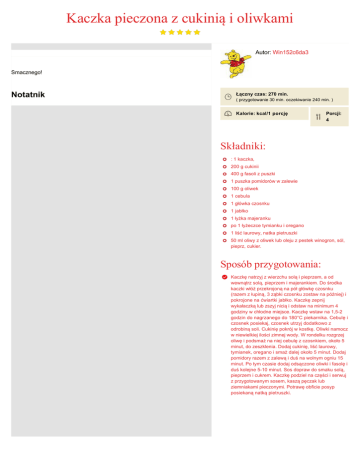 Kaczka pieczona z cukinią i oliwkami Autor: Win152c6da3 Smacznego! Notatnik Łączny czas: 270 min. ( przygotowanie 30 min. oczekiwanie 240 min. ) Kalorie: kcal/1 porcję Porcji: 4 Składniki: : 1 kaczka, 200 g cukinii 400 g fasoli z puszki 1 puszka pomidorów w zalewie 100 g oliwek 1 cebula 1 główka czosnku 1 jabłko 1 łyżka majeranku po 1 łyżeczce tymianku i oregano 1 liść laurowy, natka pietruszki 50 ml oliwy z oliwek lub oleju z pestek winogron, sól, pieprz, cukier. Sposób przygotowania: Kaczkę natrzyj z wierzchu solą i pieprzem, a od wewnątrz solą, pieprzem i majerankiem. Do środka kaczki włóż przekrojoną na pół główkę czosnku (razem z łupiną, 3 ząbki czosnku zostaw na później) i pokrojone na ćwiartki jabłko. Kaczkę zepnij wykałaczką lub zszyj nicią i odstaw na minimum 4 godziny w chłodne miejsce. Kaczkę wstaw na 1,52 godzin do nagrzanego do 180°C piekarnika. Cebulę i czosnek posiekaj, czosnek utrzyj dodatkowo z odrobiną soli. Cukinię pokrój w kostkę. Oliwki namocz w niewielkiej ilości zimnej wody. W rondelku rozgrzej oliwę i podsmaż na niej cebulę z czosnkiem, około 5 minut, do zeszklenia. Dodaj cukinię, liść laurowy, tymianek, oregano i smaż dalej około 5 minut. Dodaj pomidory razem z zalewą i duś na wolnym ogniu 15 minut. Po tym czasie dodaj odsączone oliwki i fasolę i duś kolejne 510 minut. Sos dopraw do smaku solą, pieprzem i cukrem. Kaczkę podziel na części i serwuj z przygotowanym sosem, kaszą pęczak lub ziemniakami pieczonymi. Potrawę obficie posyp posiekaną natką pietruszki.