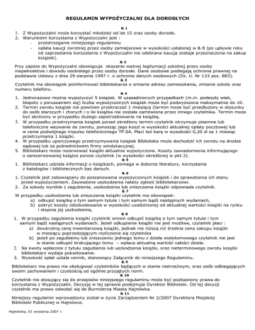 REGULAMIN WYPOŻYCZALNI DLA DOROSŁYCH &1 1. Z Wypożyczalni może korzystać młodzież od lat 15 oraz osoby dorosłe. 2. Warunkiem korzystania z Wypożyczalni jest : - przestrzeganie niniejszego regulaminu - opłata kaucji zwrotnej przez osoby zamiejscowe w wysokości ustalonej w & 8 (po upływie roku od zaprzestania korzystania z Wypożyczalni nie odebrana kaucja zostaje przeznaczona na zakup książek). &2 Przy zapisie do Wypożyczalni obowiązuje okazanie ważnej legitymacji szkolnej przez osoby niepełnoletnie i dowodu osobistego przez osoby dorosłe. Dane osobowe podlegają ochronie prawnej na podstawie Ustawy z dnia 29 sierpnia 1997 r. o ochronie danych osobowych (Dz. U. Nr 133 poz. 883). &3 Czytelnik ma obowiązek poinformować bibliotekarza o zmianie adresu zamieszkania, zmianie szkoły oraz numeru telefonu. &4 1. Jednorazowo można wypożyczyć 5 książek. W uzasadnionych przypadkach (m.in. podeszły wiek, kłopoty z poruszaniem się) liczba wypożyczonych książek może być podwyższona maksymalnie do 10. 2. Termin zwrotu książek nie powinien przekraczać 1 miesiąca (termin może być przedłużony w stosunku do osób starszych i chorych i o ile książka nie została zamówiona przez innego czytelnika. Termin może być skrócony w przypadku dużego zapotrzebowania na książkę. 3. W przypadku przetrzymania książek ponad określony termin czytelnik otrzymuje pisemne lub telefoniczne wezwanie do zwrotu, ponosząc jego koszt w wysokości aktualnej opłaty pocztowej lub w cenie podwójnego impulsu telefonicznego TP.SA. Płaci też karę w wysokości 0,20 zł za 1 miesiąc przetrzymania 1 książki. 4. W przypadku uporczywego przetrzymywania książek Biblioteka może dochodzić ich zwrotu na drodze sądowej lub za pośrednictwem firmy windykacyjnej. 5. Bibliotekarz może rezerwować książki aktualnie wypożyczone. Koszty zawiadomienia informującego o zarezerwowanej książce ponosi czytelnik (w wysokości określonej w pkt.3). &5 1. Bibliotekarz udziela informacji o książkach, pomaga w doborze literatury, korzystania z katalogów i bibliotecznych baz danych. &6 1. Czytelnik jest zobowiązany do poszanowania wypożyczonych książek i do sprawdzenia ich stanu przed wypożyczeniem. Zauważone uszkodzenia należy zgłosić bibliotekarzowi. 2. Za szkody wynikłe z zagubienia, uszkodzenia lub zniszczenia książki odpowiada czytelnik. &7 W przypadku uszkodzenia lub zniszczenia książki czytelnik ma obowiązek: a) odkupić książkę o tym samym tytule i tym samym bądź następnych wydaniach, b) pokryć koszty odszkodowania w wysokości uzależnionej od aktualnej wartości książki na rynku i stopnia jej uszkodzenia, &8 1. W przypadku zagubienia książki czytelnik winien odkupić książkę o tym samym tytule i tym samym bądź następnych wydaniach. Jeżeli odkupienie książki nie jest możliwe, czytelnik płaci : a) dwukrotną cenę inwentarzową książki, jednak nie niższą niż średnia cena zakupu książki w miesiącu poprzedzającym rozliczenie się czytelnika b) jeżeli po zagubieniu lub zniszczeniu jednego tomu z dzieła wielotomowego czytelnik nie jest w stanie odkupić brakującego tomu – wpłaca aktualną wartość całości dzieła. 2. Na kwoty wpłacone z tytułu zagubienia lub uszkodzenia książki, oraz nieterminowego zwrotu książki bibliotekarz wydaje pokwitowanie. 3. Wysokość opłat ustala cennik, stanowiący Załącznik do niniejszego Regulaminu. &9 Bibliotekarz ma prawo nie obsługiwać czytelników będących w stanie nietrzeźwym, oraz osób odbiegających swoim zachowaniem i czystością od ogólnie przyjętych norm. & 10 Czytelnik nie stosujący się do przepisów niniejszego regulaminu może być pozbawiony prawa do korzystania z Wypożyczalni. Decyzję w tej sprawie podejmuje Dyrektor Biblioteki. Od tej decyzji czytelnik ma prawo odwołać się do Burmistrza Miasta Hajnówka. & 11 Niniejszy regulamin wprowadzony został w życie Zarządzeniem Nr 2/2007 Dyrektora Miejskiej Biblioteki Publicznej w Hajnówce. Hajnówka, 01 września 2007 r.