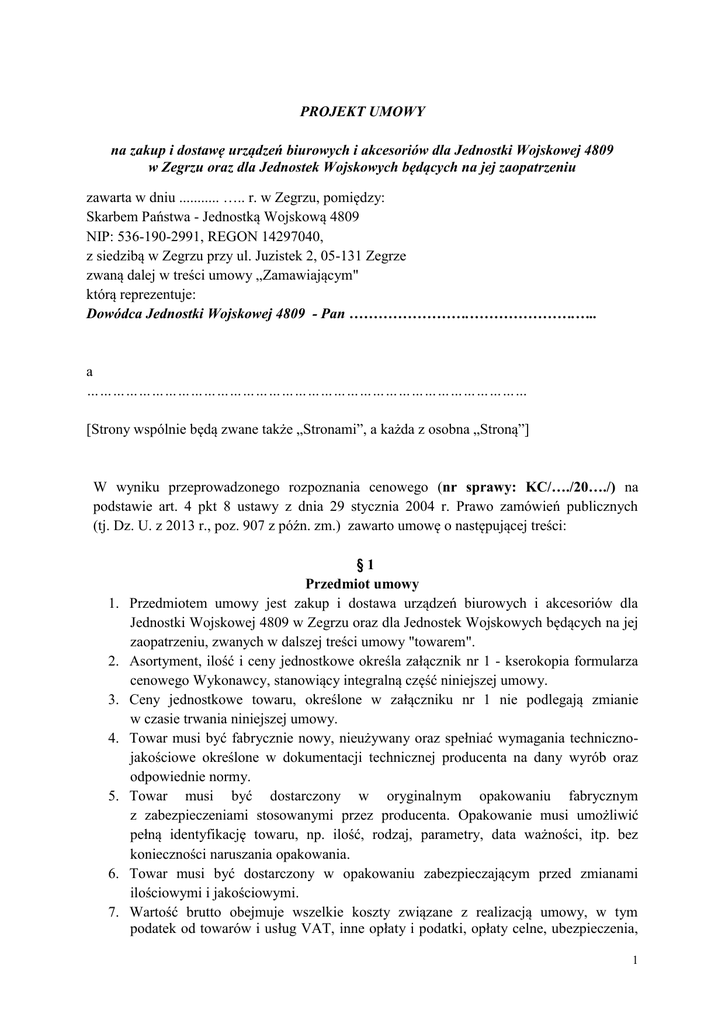 PROJEKT UMOWY na zakup i dostawę urządzeń biurowych i akcesoriów dla Jednostki Wojskowej 4809 w Zegrzu oraz dla Jednostek Wojskowych będących na jej zaopatrzeniu zawarta w dniu ........... ….. r. w Zegrzu, pomiędzy: Skarbem Państwa - Jednostką Wojskową 4809 NIP: 536-190-2991, REGON 14297040, z siedzibą w Zegrzu przy ul. Juzistek 2, 05-131 Zegrze zwaną dalej w treści umowy „Zamawiającym" którą reprezentuje: Dowódca Jednostki Wojskowej 4809 - Pan …………………….………………….….. a ………………………………………………………………………………………… [Strony wspólnie będą zwane także „Stronami”, a każda z osobna „Stroną”] W wyniku przeprowadzonego rozpoznania cenowego (nr sprawy: KC/…./20…./) na podstawie art. 4 pkt 8 ustawy z dnia 29 stycznia 2004 r. Prawo zamówień publicznych (tj. Dz. U. z 2013 r., poz. 907 z późn. zm.) zawarto umowę o następującej treści: 1. 2. 3. 4. 5. 6. 7. §1 Przedmiot umowy Przedmiotem umowy jest zakup i dostawa urządzeń biurowych i akcesoriów dla Jednostki Wojskowej 4809 w Zegrzu oraz dla Jednostek Wojskowych będących na jej zaopatrzeniu, zwanych w dalszej treści umowy "towarem". Asortyment, ilość i ceny jednostkowe określa załącznik nr 1 - kserokopia formularza cenowego Wykonawcy, stanowiący integralną część niniejszej umowy. Ceny jednostkowe towaru, określone w załączniku nr 1 nie podlegają zmianie w czasie trwania niniejszej umowy. Towar musi być fabrycznie nowy, nieużywany oraz spełniać wymagania technicznojakościowe określone w dokumentacji technicznej producenta na dany wyrób oraz odpowiednie normy. Towar musi być dostarczony w oryginalnym opakowaniu fabrycznym z zabezpieczeniami stosowanymi przez producenta. Opakowanie musi umożliwić pełną identyfikację towaru, np. ilość, rodzaj, parametry, data ważności, itp. bez konieczności naruszania opakowania. Towar musi być dostarczony w opakowaniu zabezpieczającym przed zmianami ilościowymi i jakościowymi. Wartość brutto obejmuje wszelkie koszty związane z realizacją umowy, w tym podatek od towarów i usług VAT, inne opłaty i podatki, opłaty celne, ubezpieczenia, 1 koszty opakowania oraz koszty dostawy (transportu) produktów do miejsca wskazanego przez Zamawiającego wraz z kosztami rozładunku. 8. Wykonawca oświadcza, iż jest uprawniony do wprowadzania do obrotu towarów. §2 Termin i miejsce wykonania umowy 1. Towar zostanie dostarczony przez Wykonawcę w terminie 15 dni roboczych od daty podpisania umowy. 2. Miejsce dostawy towaru: Jednostka Wojskowa 4809 Zegrze, ul. Juzistek 2, 05-131 Zegrze. §3 Warunki dostawy i odbioru towaru 1. Dostawa towaru do miejsca wskazanego w § 2 niniejszej umowy nastąpi transportem na koszt i ryzyko Wykonawcy. 2. Dostawa winna być zrealizowana w godzinach od 8.00 do 14.00 w dniach od poniedziałku do czwartku, w godzinach od 8.00 do 11.00 w piątek. 3. Za realizację umowy ze strony Zamawiającego odpowiedzialna jest ……………….. tel. …………………... 4. Za realizację umowy ze strony Wykonawcy odpowiedzialny jest …………………. tel. ……………………… 5. Warunkiem dokonania odbioru przez Zamawiającego będzie dostarczenie przez Wykonawcę towaru, zgodnie z warunkami niniejszej umowy, wraz z dowodem dostawy (tj. dokument wydania z magazynu lub faktura) oraz karty gwarancyjne, wykazy ukompletowania, instrukcje obsługi. 6. Po dokonaniu odbioru towaru zostanie sporządzony pisemny protokół odbioru, wg wzoru stanowiącego zał. nr 2 do umowy, podpisany przez przedstawicieli Stron, po stwierdzeniu ilości, jakości, rodzaju i ukompletowania towaru. 7. W razie stwierdzenia wad lub niekompletności towaru w trakcie odbioru, Zamawiający uprawniony jest do odmowy przyjęcia przedmiotu umowy w całości lub części, co zostanie potwierdzone w protokole odbioru. 8. Wykonawca zobowiązany jest do dostarczenia towaru zgodnego z umową, najpóźniej w terminie 5 dni od daty odmowy odbioru towaru lub jego części przez Zamawiającego. W przypadku braku możliwości dostarczenia partii towaru wolnego od wad lub określonej ilości, Zamawiający uprawniony jest do odstąpienia od umowy (lub jej części) i naliczenia kary umownej, zgodnie z § 6 umowy, bądź żądania wykonania umowy, z zachowaniem prawa do żądania kar umownych. 9. Wykonawca wniesie towar do miejsca wskazanego przez upoważnionego przedstawiciela Zamawiającego. 10. Wykonawca o planowanej dostawie towaru powiadomi Zamawiającego (telefonicznie, na numer wskazany w niniejszej umowie), z co najmniej 2-dniowym wyprzedzeniem (dwa dni robocze). 2 11. Do czasu odbioru towaru przez Zamawiającego, ryzyko wszelkich niebezpieczeństw związanych z ewentualnym uszkodzeniem lub utratą zamówionego towaru ponosi Wykonawca. 12. Zmiana osób wymienionych w ust. 3 i 4 wymaga pisemnego poinformowania drugiej Strony i nie stanowi zmiany umowy. 1. 2. 3. 4. 5. 6. 7. §4 Wartość umowy i warunki płatności Wartość przedmiotu umowy, zgodnie z przedstawioną i przyjętą ofertą cenową wynosi: netto: ……………. zł (słownie: ……………………………………………………….) podatek VAT: ………………. zł (słownie: …………………………………………...) brutto : …………. zł (słownie: ………………………………………………………..) Zapłata za dostarczony towar nastąpi wg cen jednostkowych, określonych w załączniku nr 1 do niniejszej umowy, w formie polecenia przelewu z rachunku bankowego Zamawiającego na rachunek bankowy Wykonawcy wskazany na fakturze VAT. Termin płatności wynosi 30 dni od dnia doręczenia Zamawiającemu prawidłowo wystawionej faktury VAT. Podstawą do wystawienia faktury VAT jest protokół odbioru towaru bez uwag, o którym mowa w § 3 niniejszej umowy. Za dzień zapłaty uznaje się dzień obciążenia rachunku Zamawiającego. Wartość przedmiotu umowy nie mo