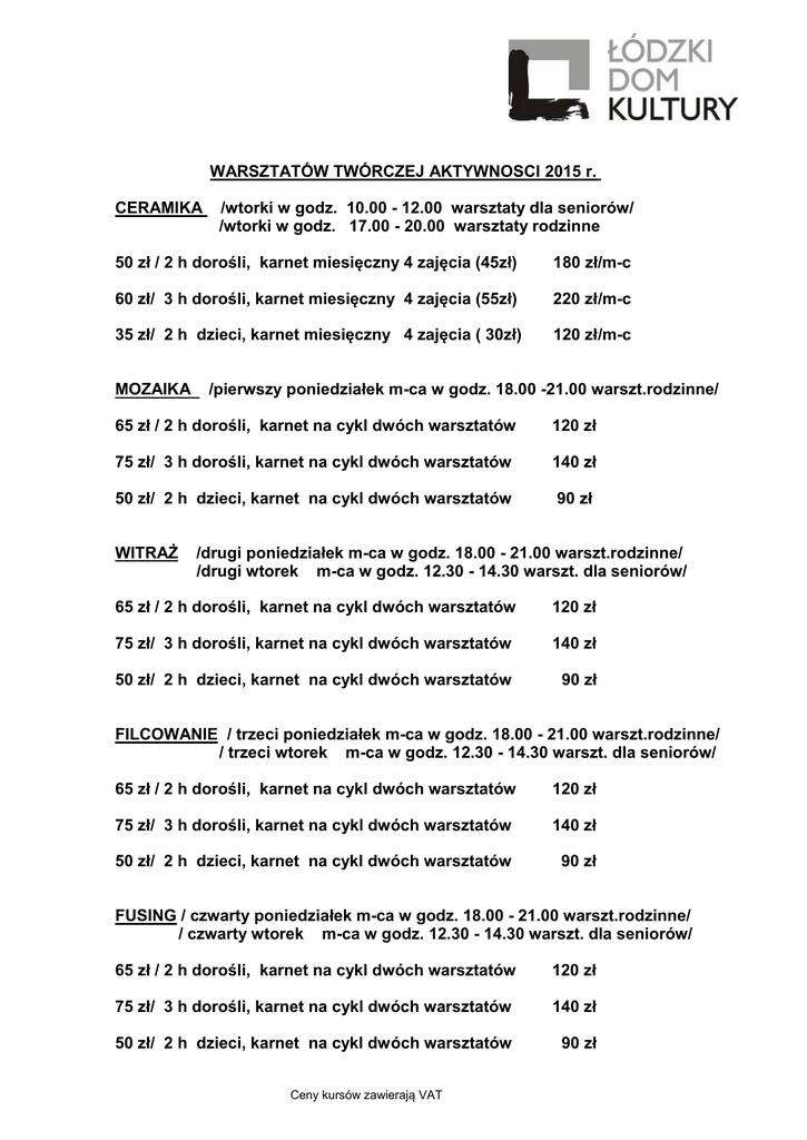 WARSZTATÓW TWÓRCZEJ AKTYWNOSCI 2015 r. CERAMIKA /wtorki w godz. 10.00 - 12.00 warsztaty dla seniorów/ /wtorki w godz. 17.00 - 20.00 warsztaty rodzinne 50 zł / 2 h dorośli, karnet miesięczny 4 zajęcia (45zł) 180 zł/m-c 60 zł/ 3 h dorośli, karnet miesięczny 4 zajęcia (55zł) 220 zł/m-c 35 zł/ 2 h dzieci, karnet miesięczny 4 zajęcia ( 30zł) 120 zł/m-c MOZAIKA /pierwszy poniedziałek m-ca w godz. 18.00 -21.00 warszt.rodzinne/ 65 zł / 2 h dorośli, karnet na cykl dwóch warsztatów 120 zł 75 zł/ 3 h dorośli, karnet na cykl dwóch warsztatów 140 zł 50 zł/ 2 h dzieci, karnet na cykl dwóch warsztatów 90 zł WITRAŻ /drugi poniedziałek m-ca w godz. 18.00 - 21.00 warszt.rodzinne/ /drugi wtorek m-ca w godz. 12.30 - 14.30 warszt. dla seniorów/ 65 zł / 2 h dorośli, karnet na cykl dwóch warsztatów 120 zł 75 zł/ 3 h dorośli, karnet na cykl dwóch warsztatów 140 zł 50 zł/ 2 h dzieci, karnet na cykl dwóch warsztatów 90 zł FILCOWANIE / trzeci poniedziałek m-ca w godz. 18.00 - 21.00 warszt.rodzinne/ / trzeci wtorek m-ca w godz. 12.30 - 14.30 warszt. dla seniorów/ 65 zł / 2 h dorośli, karnet na cykl dwóch warsztatów 120 zł 75 zł/ 3 h dorośli, karnet na cykl dwóch warsztatów 140 zł 50 zł/ 2 h dzieci, karnet na cykl dwóch warsztatów 90 zł FUSING / czwarty poniedziałek m-ca w godz. 18.00 - 21.00 warszt.rodzinne/ / czwarty wtorek m-ca w godz. 12.30 - 14.30 warszt. dla seniorów/ 65 zł / 2 h dorośli, karnet na cykl dwóch warsztatów 120 zł 75 zł/ 3 h dorośli, karnet na cykl dwóch warsztatów 140 zł 50 zł/ 2 h dzieci, karnet na cykl dwóch warsztatów 90 zł Ceny kursów zawierają VAT