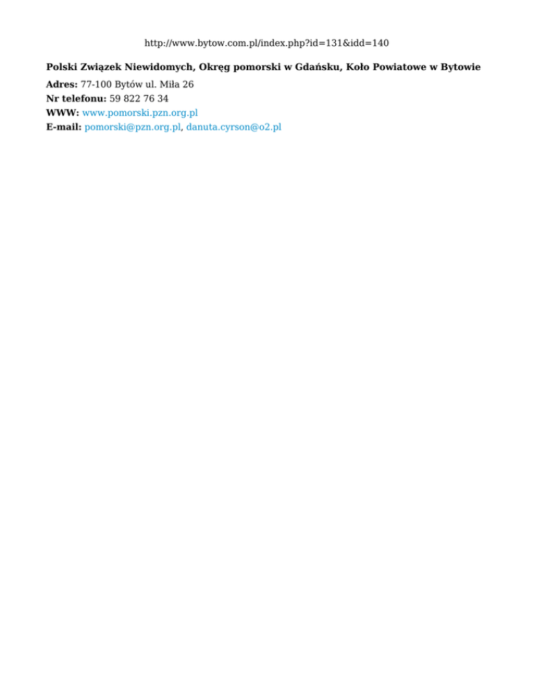 http://www.bytow.com.pl/index.php?id=131&idd=140 Polski Związek Niewidomych, Okręg pomorski w Gdańsku, Koło Powiatowe w Bytowie Adres: 77-100 Bytów ul. Miła 26 Nr telefonu: 59 822 76 34 WWW: www.pomorski.pzn.org.pl E-mail: [email protected], [email protected] Kontakt: Danuta Cyrson Związek zrzesza osoby niewidome i słabowidzące w celu ich społecznej integracji, rehabilitacji, ochrony interesów zawodowych, ekonomicznych i społecznych, przeciwdziałania ich dyskryminacji. Powyższe cele Związek realizuje przez: 1. Rejestrację i przyjmowanie niewidzących w poczet członków. 2. Prowadzenie oraz współdziałanie w prowadzeniu rehabilitacji podstawowej, leczniczej, społecznej i zawodowej niewidomych , m. in. przez prowadzenie własnych ośrodków leczniczo i szkoleniowo-rahabilitacyjnych, organizowanie różnych form rehabilitacji, działania na rzecz zaopatrzenia niewidomych w sprzęt rehabilitacyjny oraz współpracę z innymi wyspecjalizowanymi instytucjami w kraju i za granicą. 3. Organizowanie oraz współdziałanie w organizowaniu różnych form działalności kulturalnej i artystycznej niewidomych, a także sportu, turystyki i rekreacji. 4. Wydawanie i kolportaż podręczników szkolnych, produkcję i sprowadzanie pomocy naukowym, wydawanie czasopism, organizacje specjalistycznych bibliotek, wydawanie książek i innych wydawnictw pismem punktowym, powiększonym drukiem, na kasetach dźwiękowych, a także z zastosowaniem innych nośników informacji. 5. Prowadzenie domów pomocy społecznej, domów dziennego popytu, placówek rehabilitacyjnych, ośrodków opiekuńczo-rehabilitacyjnych, warsztatów terapii zajęciowej, poradni i innych tego typu placówek. 6. Działania na rzecz zatrudnienia niewidomych, pomoc w organizowaniu się zawodowych środowisk niewidomych, organizowanie różnych form kształcenia i szkolenia zawodowego. 7. Inicjowanie i opiniowanie regulacji prawnych dotyczących osób niewidomych. 8. Inicjowanie, organizowanie i prowadzenie prac badawczych z zakresu rehabilitacji, warunków życia i potrzeb niewidomych. 9. Prowadzenie działalności propagandowej na rzecz niewidomych z wykorzystaniem środków masowego przekazu i własnych publikacji oraz popularyzowanie zagadnień z zakresu profilaktyki i ochrony narządu wzroku. 10. Prowadzenie działalności gospodarczej zagadnień z zakresu profilaktyki i ochrony narządu wzroku. Związek realizuje swoje zadania współdziałając z innymi organizacjami zrzeszającymi niewidomych lub działającymi na rzecz niewidomych, z zakładami pracy zatrudniającymi niewidomych, ze stowarzyszeniami, fundacjami, instytucjami państwowymi i samorządowymi oraz z osobami fizycznymi, z placówkami naukowymi, a ponadto z organizacjami zagranicznymi i międzynarodowymi, działającymi na rzecz niewidomych. {label8}