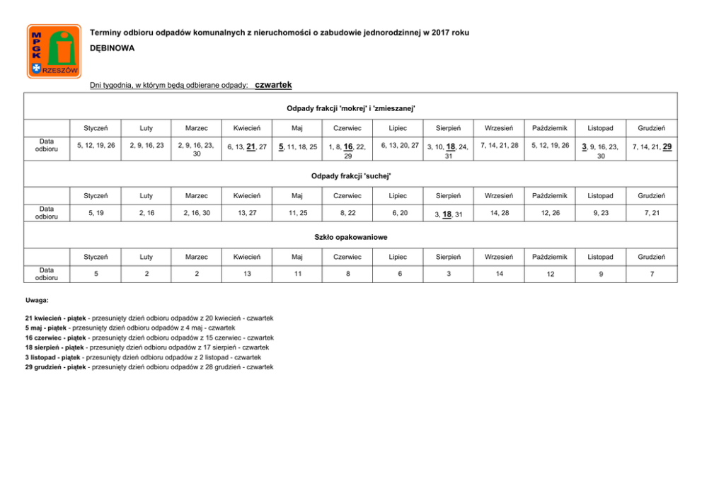 Terminy odbioru odpadów komunalnych z nieruchomości o zabudowie jednorodzinnej w 2017 roku DĘBINOWA Dni tygodnia, w którym będą odbierane odpady: czwartek Odpady frakcji 'mokrej' i 'zmieszanej' Data odbioru Styczeń Luty Marzec Kwiecień Maj Czerwiec 5, 12, 19, 26 2, 9, 16, 23 2, 9, 16, 23, 30 6, 13, 21, 27 5, 11, 18, 25 1, 8, 16, 22, 29 Lipiec Sierpień Wrzesień Październik Listopad Grudzień 3, 10, 18, 24, 31 7, 14, 21, 28 5, 12, 19, 26 3, 9, 16, 23, 7, 14, 21, 29 Lipiec Sierpień Wrzesień Październik Listopad Grudzień 6, 20 3, 18, 31 14, 28 12, 26 9, 23 7, 21 Lipiec Sierpień Wrzesień Październik Listopad Grudzień 3 14 12 9 7 6, 13, 20, 27 30 Odpady frakcji 'suchej' Data odbioru Styczeń Luty Marzec Kwiecień Maj Czerwiec 5, 19 2, 16 2, 16, 30 13, 27 11, 25 8, 22 Szkło opakowaniowe Data odbioru Styczeń Luty Marzec Kwiecień Maj Czerwiec 5 2 2 13 11 8 Uwaga: 21 kwiecień - piątek - przesunięty dzień odbioru odpadów z 20 kwiecień - czwartek 5 maj - piątek - przesunięty dzień odbioru odpadów z 4 maj - czwartek 16 czerwiec - piątek - przesunięty dzień odbioru odpadów z 15 czerwiec - czwartek 18 sierpień - piątek - przesunięty dzień odbioru odpadów z 17 sierpień - czwartek 3 listopad - piątek - przesunięty dzień odbioru odpadów z 2 listopad - czwartek 29 grudzień - piątek - przesunięty dzień odbioru odpadów z 28 grudzień - czwartek 6 Terminy odbioru odpadów komunalnych z nieruchomości o zabudowie jednorodzinnej w 2017 roku DĘBINOWA 32, 34 Dni tygodnia, w którym będą odbierane odpady: piątek Odpady frakcji 'mokrej' i 'zmieszanej' Data odbioru Styczeń Luty Marzec Kwiecień Maj Czerwiec 7, 13, 20, 27 3, 10, 17, 24 3, 10, 17, 24, 31 7, 14, 22, 28 6, 12, 19, 26 2, 9, 17, 23, 30 Lipiec 7, 14, 21, 28 Sierpień Wrzesień Październik Listopad Grudzień 4, 11, 19, 25 1, 8, 15, 22, 29 6, 13, 20, 27 4, 10, 17, 24 1, 8, 15, 22, Sierpień Wrzesień Październik Listopad Grudzień 11, 25 8, 22 6, 20 4, 17 1, 15, 30 Sierpień Wrzesień Październik Listopad Grudzień 25 22 20 17 30 30 Odpady frakcji 'suchej' Data odbioru Styczeń Luty Marzec Kwiecień Maj Czerwiec Lipiec 13, 27 10, 24 10, 24 7, 22 6, 19 2, 17, 30 14, 28 Szkło opakowaniowe Data odbioru Styczeń Luty Marzec Kwiecień Maj Czerwiec 27 24 24 22 19 30 Uwaga: 7 styczeń - sobota - przesunięty dzień odbioru odpadów z 6 styczeń - piątek 22 kwiecień - sobota - przesunięty dzień odbioru odpadów z 21 kwiecień - piątek 6 maj - sobota - przesunięty dzień odbioru odpadów z 5 maj - piątek 17 czerwiec - sobota - przesunięty dzień odbioru odpadów z 16 czerwiec - piątek 19 sierpień - sobota - przesunięty dzień odbioru odpadów z 18 sierpień - piątek 4 listopad - sobota - przesunięty dzień odbioru odpadów z 3 listopad - piątek 30 grudzień - sobota - przesunięty dzień odbioru odpadów z 29 grudzień - piątek Lipiec 28 Terminy odbioru odpadów komunalnych z nieruchomości o zabudowie jednorodzinnej w 2017 roku DĘBINOWA 16, 24 Dni tygodnia, w którym będą odbierane odpady: piątek Odpady frakcji 'mokrej' i 'zmieszanej' Data odbioru Styczeń Luty Marzec Kwiecień Maj Czerwiec 7, 13, 20, 27 3, 10, 17, 24 3, 10, 17, 24, 31 7, 14, 22, 28 6, 12, 19, 26 2, 9, 17, 23, 30 Lipiec 7, 14, 21, 28 Sierpień Wrzesień Październik Listopad Grudzień 4, 11, 19, 25 1, 8, 15, 22, 29 6, 13, 20, 27 4, 10, 17, 24 1, 8, 15, 22, Sierpień Wrzesień Październik Listopad Grudzień 11, 25 8, 22 6, 20 4, 17 1, 15, 30 Sierpień Wrzesień Październik Listopad Grudzień 11 8 6 4 1 30 Odpady frakcji 'suchej' Data odbioru Styczeń Luty Marzec Kwiecień Maj Czerwiec Lipiec 13, 27 10, 24 10, 24 7, 22 6, 19 2, 17, 30 14, 28 Szkło opakowaniowe Data odbioru Styczeń Luty Marzec Kwiecień Maj Czerwiec 13 10 10 7 6 2 Uwaga: 7 styczeń - sobota - przesunięty dzień odbioru odpadów z 6 styczeń - piątek 22 kwiecień - sobota - przesunięty dzień odbioru odpadów z 21 kwiecień - piątek 6 maj - sobota - przesunięty dzień odbioru odpadów z 5 maj - piątek 17 czerwiec - sobota - przesunięty dzień odbioru odpadów z 16 czerwiec - piątek 19 sierpień - sobota - przesunięty dzień odbioru odpadów z 18 sierpień - piątek 4 listopad - sobota - przesunięty dzień odbioru odpadów z 3 listopad - piątek 30 grudzień - sobota - przesunięty dzień odbioru odpadów z 29 grudzień - piątek Lipiec 14