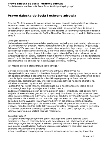 Prawo dziecka do życia i ochrony zdrowia Opublikowane na Rzecznik Praw Dziecka (http://brpd.gov.pl) Prawo dziecka do życia i ochrony zdrowia Dziecko "[...]ma prawo do najwyższego poziomu zdrowia i udogodnień w zakresie leczenia chorób oraz rehabilitacji zdrowotnej [...]" nie może być też "[...] pozbawione prawa dostępu do tego rodzaju opieki zdrowotnej". Jest to jedno z podstawowych praw dziecka, które zostało zawarte w Konwencji o prawach dziecka a przyjęte przez Zgromadzenie Ogólne Narodów Zjednoczonych w dniu 20 listopada 1989 r. Co to jest zdrowie? Na to pytanie można odpowiedzieć posługując się jednym z najczęściej cytowanych i przywoływanych podejść, które zaproponowane jest przez Światową Organizację Zdrowia (ŚOZ), zgodnie z którym zdrowie stanowi pełnię fizycznego, psychicznego i społecznego dobrostanu człowieka, a nie tylko brak choroby lub kalectwa. Jest to zasób fizycznych, psychicznych i społecznych potencjałów, które człowiek ma w swojej dyspozycji i dzięki, któremu można podnosić indywidualną, ale też społeczną jakość życia. Na ten zasób można wpływać. Powiększać go np. poprzez zachowania prozdrowotne lub obniżać np. nadużywając alkoholu, nikotyny. Jak można określić stan zdrowia społecznego? Do tego celu służą wskaźniki oceny stanu zdrowia. Dzielimy je na: - bezpośrednie, a w ramach mierników bezpośrednich na pozytywne i negatywne. W ten sposób powstają bezpośrednie mierniki pozytywne jest to np. przeciętne dalsze trwanie życia oraz bezpośrednie mierniki negatywne są to śmiertelność, umieralność, zachorowalność, chorobowość, zapadalność na różne choroby np. zakaźne, nerwowe czy układu krążenia, - pośrednie np. liczba lekarzy przypadająca na 1 mieszkańca czy liczba porad stomatologicznych przypadająca na 1 mieszkańca. Badania stwierdzają, że stan zdrowia polskich dzieci i młodzieży jest gorszy niż w krajach UE o rozwiniętej gospopdarce rynkowej. Stunkowo duży jest odsetek osób, które są już uzależnione od tytoniu i alkoholu, środków psychoaktywnych. Kolejnym zagrożeniem dla zdrowia są zachowania ryzykowne np. w ruchu drogowym, co powoduje liczne wypadki i są przyczyną licznych schorzeń a często i zgonów. Stosowanie niebezpiecnych dla zdrowia diet, mała aktywność ruchowa w czasie wolnym, nieodpowiednia dieta (zbyt mało produktów mlecznych, warzyw i owoców a nadmiar produktów zawierajacych cukier). To tylko część z przyczyn, które ujemnie wpływają na kształt zdrowia młodzieży. Co należy robić? Osiągnięcie strategicznego celu, jakim jest poprawa stanu zdrowia dzieci i młodzieży w Polsce zmierzać będzie do zwiększenia roli i efektywności działań profilaktycznych, leczniczych i z zakresu promocji zdrowia, którą należy rozumieć jako proces umożliwiający ludziom kontrolę nad własnym zdrowiem oraz jego poprawę i utrzymanie tej poprawy. Jedną z możliwości są programy promocji zdrowia wdrażane między innymi w Strona 1 z 2 Prawo dziecka do życia i ochrony zdrowia Opublikowane na Rzecznik Praw Dziecka (http://brpd.gov.pl) szkołach. Przykładem takiego działania jest realizowany w Polsce projekt szkoły promującej zdrowie. Cechą charakterystyczną szkół uczestniczących w projekcie jest wcielanie w życie idei promocji zdrowia, zaś głównym założeniem szkoły promującej zdrowie jest stworzenie takiego środowiska, w którym żyje, uczy, pracuje, rozwija się i odpoczywa nie tylko uczeń ale nauczyciele i pozostali pracownicy szkoły. Również istotą koncepcji tej szkoły jest adekwatność treści edukacyjnych i deklaracji w stosunku do działań i to nie tylko w otoczeniu szkoły, ale też w rodzinie i gminie. Jednak nie samo wdrażanie programów jak i nawet samo zdrowie nie jest celem samym w sobie a raczej środkiem umożliwiającym takie wykorzystanie istniejących możliwości, aby życie mogło być bardziej produktywne, wartościowe i twórcze. A to stać się może za sprawą podniesienia sprawności fizycznej i psychicznej na skutek ograniczenia uzależnień, wzrostu poczucia bezpieczeństwa, poprawienia sposobu odżywiania czy wzrostu aktywności fizycznej. Udostępnij: Facebook [1] Google Plus [2] Twitter [3] Adres URL źródła: http://brpd.gov.pl/aktualnosci/prawo-dziecka-do-zycia-i-ochronyzdrowia Odnośniki: [1] http://facebook.com/sharer.php?u=http%3A%2F%2Fbrpd.gov.pl%2Faktualnosci %2Fprawo-dziecka-do-zycia-i-ochrony-zdrowia&t=Prawo%20dziecka%20do%2 0%C5%BCycia%20i%20ochrony%20zdrowia [2] https://plus.google.com/share?url=http%3A%2F%2Fbrpd.gov.pl%2Faktualnosci %2Fprawo-dziecka-do-zycia-i-ochrony-zdrowia [3] http://twitter.com/intent/tweet?url=http%3A%2F%2Fbrpd.gov.pl%2Faktualnosci %2Fprawo-dziecka-do-zycia-i-ochrony-zdrowia&text=Prawo%20dziecka%20do %20%C5%BCycia%20i%20ochrony%20zdrowia Strona 2 z 2
