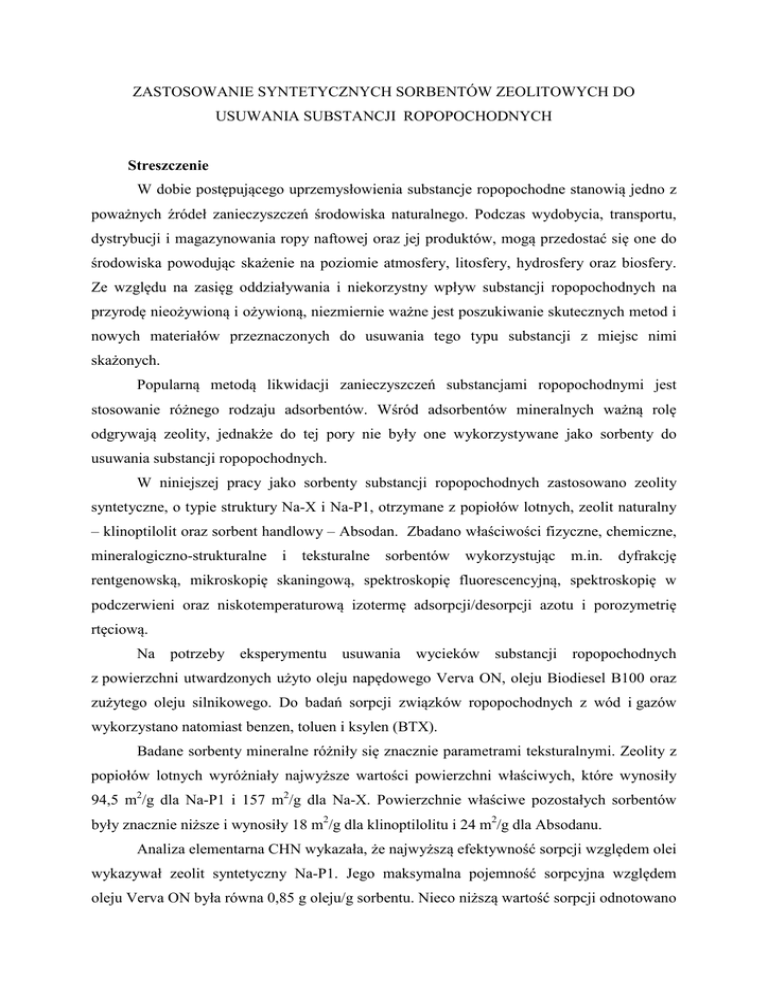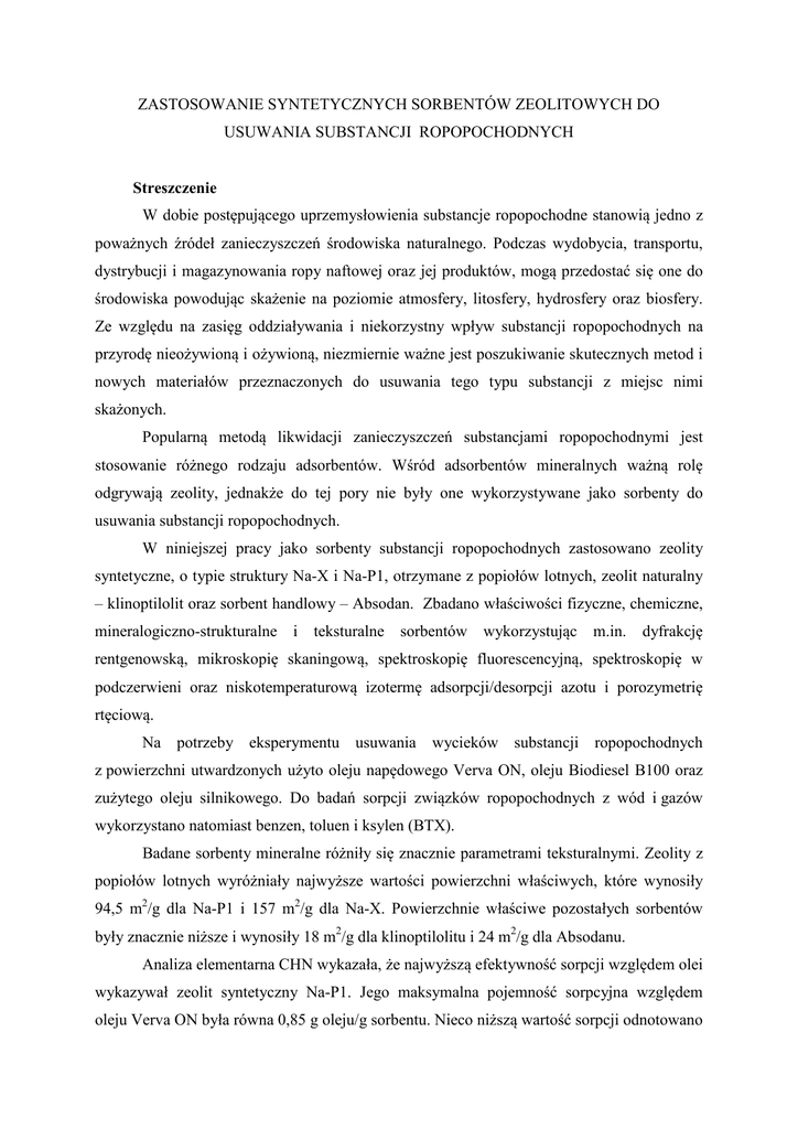 ZASTOSOWANIE SYNTETYCZNYCH SORBENTÓW ZEOLITOWYCH DO USUWANIA SUBSTANCJI ROPOPOCHODNYCH Streszczenie W dobie postępującego uprzemysłowienia substancje ropopochodne stanowią jedno z poważnych źródeł zanieczyszczeń środowiska naturalnego. Podczas wydobycia, transportu, dystrybucji i magazynowania ropy naftowej oraz jej produktów, mogą przedostać się one do środowiska powodując skażenie na poziomie atmosfery, litosfery, hydrosfery oraz biosfery. Ze względu na zasięg oddziaływania i niekorzystny wpływ substancji ropopochodnych na przyrodę nieożywioną i ożywioną, niezmiernie ważne jest poszukiwanie skutecznych metod i nowych materiałów przeznaczonych do usuwania tego typu substancji z miejsc nimi skażonych. Popularną metodą likwidacji zanieczyszczeń substancjami ropopochodnymi jest stosowanie różnego rodzaju adsorbentów. Wśród adsorbentów mineralnych ważną rolę odgrywają zeolity, jednakże do tej pory nie były one wykorzystywane jako sorbenty do usuwania substancji ropopochodnych. W niniejszej pracy jako sorbenty substancji ropopochodnych zastosowano zeolity syntetyczne, o typie struktury Na-X i Na-P1, otrzymane z popiołów lotnych, zeolit naturalny – klinoptilolit oraz sorbent handlowy – Absodan. Zbadano właściwości fizyczne, chemiczne, mineralogiczno-strukturalne i teksturalne sorbentów wykorzystując m.in. dyfrakcję rentgenowską, mikroskopię skaningową, spektroskopię fluorescencyjną, spektroskopię w podczerwieni oraz niskotemperaturową izotermę adsorpcji/desorpcji azotu i porozymetrię rtęciową. Na potrzeby eksperymentu usuwania wycieków substancji ropopochodnych z powierzchni utwardzonych użyto oleju napędowego Verva ON, oleju Biodiesel B100 oraz zużytego oleju silnikowego. Do badań sorpcji związków ropopochodnych z wód i gazów wykorzystano natomiast benzen, toluen i ksylen (BTX). Badane sorbenty mineralne różniły się znacznie parametrami teksturalnymi. Zeolity z popiołów lotnych wyróżniały najwyższe wartości powierzchni właściwych, które wynosiły 94,5 m2/g dla Na-P1 i 157 m2/g dla Na-X. Powierzchnie właściwe pozostałych sorbentów były znacznie niższe i wynosiły 18 m2/g dla klinoptilolitu i 24 m2/g dla Absodanu. Analiza elementarna CHN wykazała, że najwyższą efektywność sorpcji względem olei wykazywał zeolit syntetyczny Na-P1. Jego maksymalna pojemność sorpcyjna względem oleju Verva ON była równa 0,85 g oleju/g sorbentu. Nieco niższą wartość sorpcji odnotowano dla zeolitu Na-X - 0,75 g/g sorbentu. Wielkości sorpcji oleju Verva ON na Absodanie i klinoptilolicie wynosiły odpowiednio 0,40 i 0,23 g/g sorbentu. Wartości maksymalnych pojemności sorpcyjnych były ściśle związane z właściwościami teksturalnymi sorbentów. Bardziej rozwinięta powierzchnia właściwa zeolitów syntetycznych powodowała, że pochłaniały one prawie czterokrotnie więcej substancji ropopochodnych na jednostkę masy niż zeolit naturalny i prawie dwukrotnie więcej niż Absodan. Dla sorpcji związków BTX z roztworów wodnych stwierdzono podobne wielkości sorpcji dla zeolitu Na-X oraz Na-P1 (około 0,32 mg BTX/g sorbentu). Wielkość sorpcji benzenu i jego pochodnych była wynikiem oddziaływań specyficznych elektronów π pierścienia aromatycznego z siecią krystaliczną minerałów zeolitowych. W przypadku sorpcji związków BTX ze strumienia gazu najefektywniejszym sorbentem był zeolit Na-X. Dla benzenu, toluenu, o-, m- i p-ksylenu jego pojemność sorpcyjna wynosiła odpowiednio 384, 525, 545, 564 i 573 µmol/g sorbentu. Otrzymane wielkości sorpcji wynikały najprawdopodobniej z obecności w strukturze zeolitu Na-X „okien” o wymiarach podobnych do średnic cząsteczek analizowanych związków. Dla zużytych sorbentów zeolitowych po sorpcji substancji ropopochodnych zaproponowano sposób utylizacji. Wykorzystano je jako dodatki modyfikujące skład mieszanki mineralnej do produkcji kruszywa lekkiego. Dodatek ten zapewnił pożądaną porowatość otrzymanych kruszyw oraz odpowiednie parametry techniczne. Wyniki otrzymane w pracy wskazują, że zeolity z popiołów lotnych z powodzeniem mogą być stosowane jako sorbenty substancji ropopochodnych. Posiadały one zdecydowanie lepsze zdolności sorpcyjne względem tych substancji w stosunku do sorbentu komercyjnego. Wykazano również, że sorpcja substancji ropopochodnych na zeolitach z popiołów lotnych ma charakter fizyczny, uzależniony w głównej mierze od parametrów teksturalnych sorbentu oraz jego uziarnienia. Zaproponowane w pracy wykorzystanie zeolitów z popiołów lotnych może w znacznym stopniu przyczynić się nie tylko do redukcji deponowanych ilości popiołów, ale również do eliminacji ropopochodnymi. zanieczyszczeń środowiska szkodliwymi substancjami