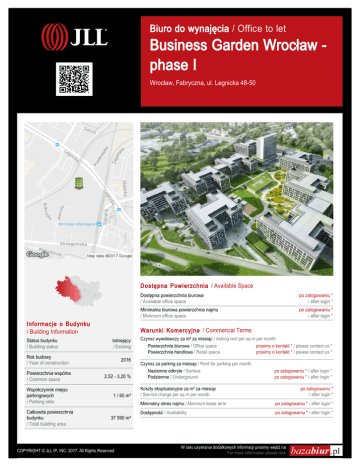 Biuro do wynajęcia / Office to let Business Garden Wrocław phase I Wrocław, Fabryczna, ul. Legnicka 48-50 Dostępna Powierzchnia / Available Space Informacje o Budynku / Building Information Status budynku / Building status Współczynnik miejsc parkingowych / Parking ratio Całkowita powierzchnia budynku / Total building area po zalogowaniu * / after login * Minimalna biurowa powierzchnia najmu / Minimum office space po zalogowaniu * / after login * Warunki Komercyjne / Commercial Terms Istniejący / Existing Rok budowy / Year of construction Powierzchnia wspólna / Common space Dostępna powierzchnia biurowa / Available office space 2016 2,52 - 3,20 % 1 / 60 m² 37 590 m² COPYRIGHT © JLL IP, INC. 2017. All Rights Reserved Czynsz wywoławczy za m² za miesiąc / Asking rent per sq m per month Powierzchnia biurowa / Office space prosimy o kontakt * / please contact us * Powierzchnia handlowa / Retail space prosimy o kontakt * / please contact us * Czynsz za parking za miesiąc / Rent for parking per month Naziemne odkryte / Surface Podziemne / Underground po zalogowaniu * / after login * po zalogowaniu * / after login * Koszty eksploatacyjne za m² za miesiąc / Service charge per sq m per month po zalogowaniu * / after login * Minimalny okres najmu / Minimum lease term po zalogowaniu * / after login * Dostępność / Availability po zalogowaniu * / after login * W celu uzyskania dodatkowych informacji prosimy wejdź na For more information please click Dostępna Powierzchnia / Available Space Budynek 2-3 Piętro / Floor Powierzchnia wolna / Vacant space Dostępność / Availability 0 prosimy o kontakt * / please contact us * prosimy o kontakt * / please contact us * 0 prosimy o kontakt * / please contact us * prosimy o kontakt * / please contact us * 0 prosimy o kontakt * / please contact us * prosimy o kontakt * / please contact us * 0 prosimy o kontakt * / please contact us * prosimy o kontakt * / please contact us * 1 prosimy o kontakt * / please contact us * prosimy o kontakt * / please contact us * Razem / Total po zalogowaniu * / after login * Budynek 1 Piętro / Floor 0 Powierzchnia wolna / Vacant space Dostępność / Availability prosimy o kontakt * / please contact us * prosimy o kontakt * / please contact us * Razem / Total po zalogowaniu * / after login * Standardowe Wykończenie / Standard Fit-Out Typowy Plan Piętra / Typical Floor Plan Klimatyzacja / Air conditioning Podnoszone podłogi / Raised floor Podwieszany sufit / Suspended ceiling Okablowanie telefoniczne (opcja) / Telephone cabling (option) Okablowanie komputerowe (opcja) / Computer cabling (option) Okablowanie elektryczne / Power cabling Tryskacze / Sprinklers Czujniki dymu / Smoke detectors Wykładzina / Carpeting Podział powierzchni ściankami / Wall partitioning Recepcja / Reception Ochrona budynku / Security Kable światłowodowe / Fiber optics Kontrola dostępu do budynku / Access control Uchylne okna / Openable windows Dwustronne zasilanie / Emergency power supply BMS / BMS W celu uzyskania dodatkowych informacji lub zorganizowania spotkania prosimy o kontakt: / For more information or to arrange a viewing please contact: +48 22 167 00 00 Niniejsze warunki mają charakter wyłącznie informacyjny i nie stanowią części wiążącej oferty lub umowy. / The Property Particulars are for information purposes only and do not form any part of binding offer or contract. COPYRIGHT © JLL IP, INC. 2017. All Rights Reserved W celu uzyskania dodatkowych informacji prosimy wejdź na For more information please click
