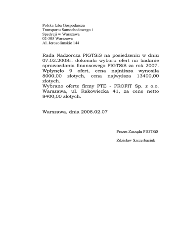 Polska Izba Gospodarcza Transportu Samochodowego i Spedycji w Warszawa 02-305 Warszawa Al. Jerozolimskie 144 Rada Nadzorcza PIGTSiS na posiedzeniu w dniu 07.02.2008r. dokonała wyboru ofert na badanie sprawozdania finansowego PIGTSiS za rok 2007. Wpłynęło 9 ofert, cena najniższa wynosiła 8000,00 złotych, cena najwyższa 13400,00 złotych. Wybrano ofertę firmy PTE - PROFIT Sp. z o.o. Warszawa, ul. Rakowiecka 41, za cenę netto 8400,00 złotych. Warszawa, dnia 2008.02.07 Prezes Zarządu PIGTSiS Zdzisław Szczerbaciuk