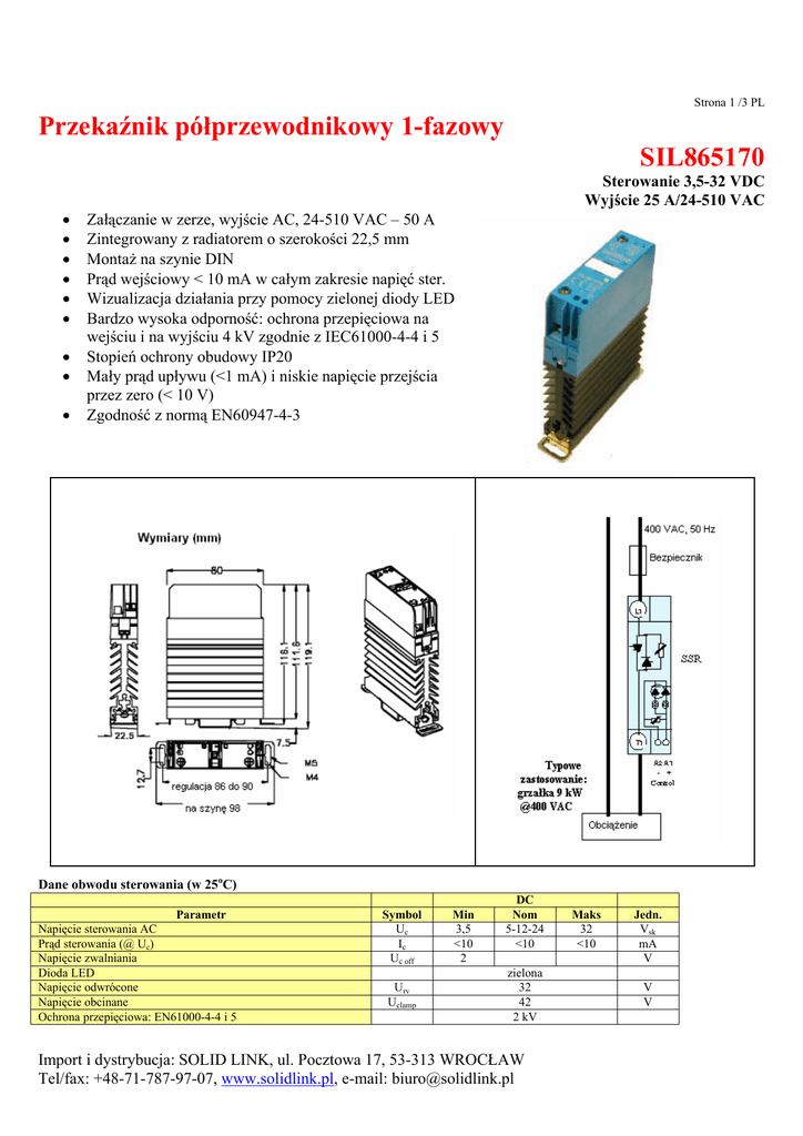 Przekaźnik półprzewodnikowy 1-fazowy SIL865170