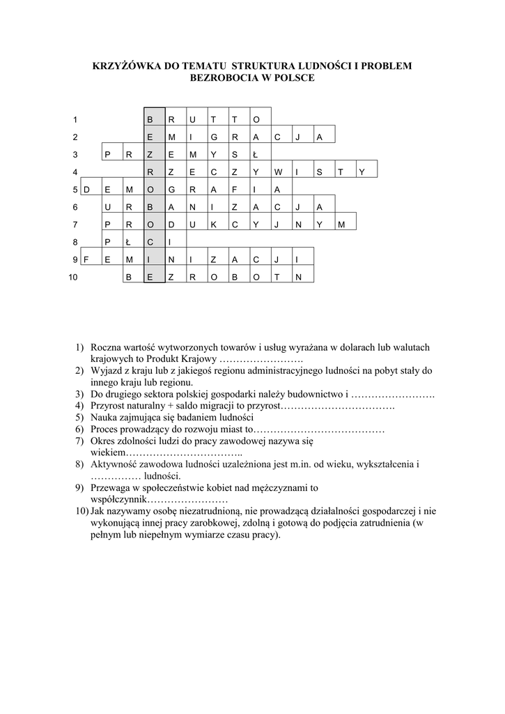 krzyżówka do tematu struktura ludności i problem bezrobocia w polsce