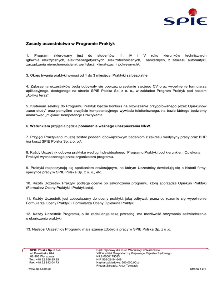Zasady uczestnictwa w Programie Praktyk 1. Program skierowany jest do studentów III, IV i V roku kierunków technicznych /głównie elektrycznych, elektroenergetycznych, elektrotechnicznych, sanitarnych, z zakresu automatyki, zarządzania nieruchomościami, ściami, wentylacji, klimatyzacji i pokrewnych/. 3. Okres trwania praktyki wynosi od 1 do 3 miesięcy. miesi Praktyki są bezpłatne. 4. Zgłoszenia uczestników będą ędą odbywały się poprzez przesłanie swojego CV oraz wypełnienie formularza aplikacyjnego, dostępnego pnego na stronie SPIE Polska Sp. z o. o., w zakładce Program Praktyk pod hasłem „Aplikuj teraz”. 5. Kryterium selekcji do Programu Praktyk będzie b konkurs na rozwiązanie zanie przygotowanego przez Opiekunów „case study” oraz pomyślne ślne przejście przejście kompetencyjnego wywiadu telefonicznego, na bazie którego b będziemy analizować „miękkie” kkie” kompetencje Praktykanta. 6. Warunkiem przyjęcia będzie posiadanie ważnego wa ubezpieczenia NNW. 7. Przyjęci Praktykanci muszą ą zostać zosta poddani obowiązkowym zkowym badaniom z zakresu medycyny pracy oraz BHP /na koszt SPIE Polska Sp. z o. o./. 8. Każdy dy Uczestnik odbywa praktykę według Indywidualnego Programu Praktyki pod kierunkiem Opiekuna Praktyki wyznaczonego przez organizatora organizat programu. 9. Praktyki rozpoczynają ą się ę spotkaniem otwierającym, otwieraj cym, na którym Uczestnicy dowiadują dowiaduj się o historii firmy, specyfice pracy w SPIE Polska Sp. z o. o., etc. 10. Każdy dy Uczestnik Praktyki podlega ocenie po zakończeniu zako czeniu programu, którą sporządza sporz Opiekun Praktyki (Formularz Oceny Praktyki i Praktykanta). 11. Każdy dy Uczestnik jest zobowiązany zobowią do oceny praktyki, jaką odbywał, przez co rozumie si się wypełnienie Formularza Oceny Praktyki i Formularza Oceny Opiekuna Praktyki. 12. Każdy dy Uczestnik Programu, o ile zadeklaruje tak taką potrzebę, ma możliwość żliwość otrzymania zaświadczenia o ukończeniu praktyki 13. Najlepsi Uczestnicy Programu mają maj szansę zdobycia pracy w SPIE Polska Sp. z o .o. SPIE Polska Sp. z o.o. ul. Powsińska 64A 02-903 Warszawa Tel.: +48 22 858 85 25 Fax: +48 22 842 04 73 www.spie.com.pl Sąd Rejonowyy dla m.st. Warszawy w Warszawie XIII Wydział Gospodarczy Krajowego Rejestru Sądowego Są KRS 0000175583 NIP 526-22-54-649 Kapitał zakładowy: 500.000,00 zł Prezes Zarządu: Artur Tomczyk Strona 1 z 1