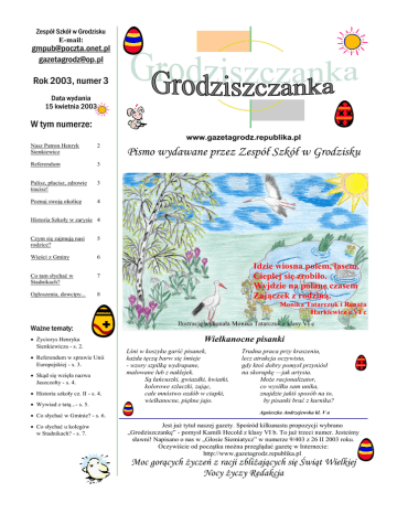 Zespół Szkół w Grodzisku E-mail: [email protected] [email protected] Rok 2003, numer 3 Data wydania 15 kwietnia 2003 W tym numerze: www.gazetagrodz.republika.pl Nasz Patron Henryk Sienkiewicz 2 Referendum 3 Palisz, płacisz, zdrowie tracisz! 3 Poznaj swoją okolicę 4 Pismo wydawane przez Zespół Szkół w Grodzisku Historia Szkoły w zarysie 4 Czym się zajmują nasi rodzice? 5 Wieści z Gminy 6 Co tam słychać w Stadnikach? 7 Ogłoszenia, dowcipy... 8 Idzie wiosna polem, lasem, Cieplej się zrobiło. Wyjdzie na polanę czasem Zajączek z rodziną. Monika Tatarczuk i Renata Harkiewicz z VI c Ważne tematy: Życiorys Henryka Sienkiewicza - s. 2. Referendum w sprawie Unii Europejskiej - s. 3. Skąd się wzięła nazwa Jaszczołty - s. 4. Historia szkoły cz. II - s. 4. Wywiad z tatą...- s. 5. Co słychać w Gminie? - s. 6. Co słychać u kolegów w Stadnikach? - s. 7. Ilustrację wykonała Monika Tatarczuk z klasy VI c Wielkanocne pisanki Lśni w koszyku garść pisanek, każda tęczą barw się śmieje - wzory szpilką wydrapane, malowane lub z naklejek. Są łańcuszki, gwiazdki, kwiatki, kolorowe szlaczki, zając, całe mnóstwo ozdób w ciapki, wielkanocne, piękne jajo. Trudna praca przy kraszeniu, lecz atrakcja oczywista, gdy ktoś dobry pomysł przyniósł na skorupkę —jak artysta. Może racjonalizator, co wysiłku sam unika, znajdzie jakiś sposób na to, by pisanki brać z kurnika? Agnieszka Andrzejewska kl. V a Jest już tytuł naszej gazety. Spośród kilkunastu propozycji wybrano „Grodziszczankę” - pomysł Kamili Hecold z klasy VI b. To już trzeci numer. Jesteśmy sławni! Napisano o nas w „Głosie Siemiatycz” w numerze 9/403 z 26 II 2003 roku. Oczywiście od początku można przeglądać gazetę w Internecie: http://www.gazetagrodz.republika.pl Moc gorących życzeń z racji zbliżających się Świąt Wielkiej Nocy życzy Redakcja Str. 2 Rok 2003, numer 3 Patron naszej Szkoły Więcej informacji o Patronie naszej szkoły oraz o rocznicach sienkiewiczowskich, znajdziecie na oficjalnej stronie internetowej Szkoły pod adresem: www.bbgol.republika.pl Henryk Sienkiewicz urodził się 5 maja 1846 r. w Woli Okrzejskiej na Podlasiu, w rodzinie ubożejącego szlachcica, Józefa Sienkiewicza. Matką jego była Stefania z Cieciszowskich, pochodząca z zamożnej rodziny szlacheckiej. Henryk uczył się i studiował w Warszawie. Działalność pisarską zaczął od pracy dziennikarskiej. Pierwszą z licznych podróży odbył do Ameryki Północnej, skąd pisał korespondencje. Pod wpływem obserwacji z tej podróży napisał nowele: „Sachem”, „Latarnik”, „Za chlebem”. Później pracował jako redaktor. Pierwszym większym jego utworem są „Szkice węglem” oraz nowele: „Janko Muzykant” i „Bartek Zwycięzca”. Wielką sławę przyniosła Sienkiewiczowi trylogia: „Ogniem i mieczem”, „Potop”, „Pan Wołodyjowski”. Inna wielka powieść historyczna Krzyżacy zdobyła dużą popularność. Światową sławę oraz Nagrodę Nobla (1905 r.) przyniosła pisarzowi powieść „Quo vadis” (Dokąd idziesz ?). Pod koniec życia napisał piękną książkę dla dzieci „W pustyni i w puszczy”. Sienkiewicz prowadził również ożywioną działalność społeczną. W uz naniu z asług społ ecz eńst wo polski e z akupi ło i ofiarowało pisarzowi majątek w Oblęgorku na Kielecczyźnie, obecnie znajduje się w nim muzeum pamiątek po pisarzu. Dnia 15 listopada 1916 r. zmarł w Vevey w Szwajcarii. W 1924 roku prochy pisarza przywieziono do Polski i złożono w krypcie św. Jana w Warszawie. Marzena Deniszewska i Justyna Kryńska z kl. VI c 30 kwietnia 1992 roku miała miejsce uroczystość nadania szkole imienia Henryka Sienkiewicza Ks. Andrzej Boguszewski dokonuje poświęcenia sztandaru Szkoły W kwi etniu 11 l at t emu społ e cz ność sz kol n a (dz i ęki staraniom Pana Dyrektora Marka Czajkowskiego) przeżyła uroczystość nadania szkole imienia. Patronem został Henryk Sienkiewicz – polski noblista, autor powieści historycznych, pisanych „ku pokrzepieniu serc”, twórca polskiej i światowej prozy. Z tej okazji przekazano szkole sztandar ufundowany przez Komitet Rodzicielski. Od tej pory poczet sztandarowy uświetnia wszystkie uroczystości szkolne. Dzięki patronowi nasza szkoła włącz yła się do udziału w Ogólnopolskich Zlotach Szkół Sienkiewiczowskich od 1997 r. (w następnym numerze szczegółowe informacje o tym udziale). Redakcja Strona główna Str. 3 Rok 2003, numer 3 Gimnazjaliści o Unii Europejskiej — referendum Czternastego lutego 2003 r. w Publicznym Gimnazjum w Grodzisku odbyło się referendum w sprawie wstąpienia Polski do Unii Europejskiej. W skład komisji, która czuwała nad poprawnym przebiegiem głosowania, wchodzili: zastępca dyrektora szkoły mgr Maria Mirończuk, nauczycielki historii: panie mgr Krystyna Romaniuk i mgr Renata Martyniuk oraz przedstawiciele samorządu uczniowskiego: Marcin Sak, Iwona Krzewicka, Marta Kłopotowska, Malwina Iwanowska, Małgorzata Porzezińska, Marta Niedźwiecka oraz Anna Moczulska. W głosowaniu wzięło udział 214 uczniów; za wejściem do UE opowiedziały się 44 osoby, przeciwnych było 117 osób, zaś 13 uczniów nie miało zdania. Malwina Iwanowska II Na zdjęciu od prawej Pani mgr Renata Martyniuk, Ania Moczulska III BG, Iwona Krzywicka III CG, pani mgr Krystyna Romaniuk, Marta Niedźwiecka III BG, pani mgr Maria Mirończuk, Malwina Iwanowska II AG, Małgosia Porzezińska III AG oraz Marcin Sak II AG Problem nikotynizmu dotyczy dużej części naszego społeczeństwa. Bardzo dużo osób choruje i umiera na raka płuc. Dlatego postanowiłyśmy zająć się tym problemem. Paląc niszczysz swoje płuca. Z biegiem czasu od palenia może wytworzyć się na Palisz, płacisz, zdrowie tracisz!!! nich nowotwór zwany rakiem. Większość chorych na raka umiera. Można temu zapobiec nie paląc lub rzucając palenie! Czy dbasz o siebie i innych? Tytoń działa szkod