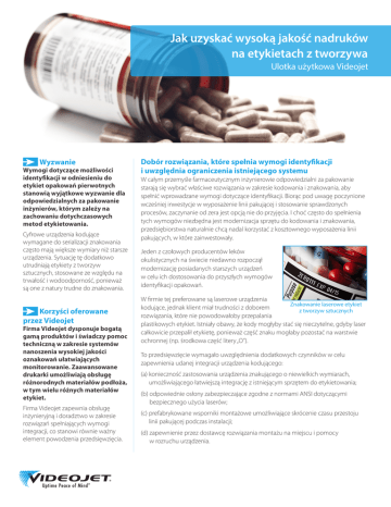 Jak uzyskać wysoką jakość nadruków na etykietach z tworzywa Ulotka użytkowa Videojet Wyzwanie Wymogi dotyczące możliwości identyfikacji w odniesieniu do etykiet opakowań pierwotnych stanowią wyjątkowe wyzwanie dla odpowiedzialnych za pakowanie inżynierów, którym zależy na zachowaniu dotychczasowych metod etykietowania. Cyfrowe urządzenia kodujące wymagane do serializacji znakowania często mają większe wymiary niż starsze urządzenia. Sytuację tę dodatkowo utrudniają etykiety z tworzyw sztucznych, stosowane ze względu na trwałość i wodoodporność, ponieważ są one z natury trudne do znakowania. Korzyści oferowane przez Videojet Firma Videojet dysponuje bogatą gamą produktów i świadczy pomoc techniczną w zakresie systemów nanoszenia wysokiej jakości oznakowań ułatwiających monitorowanie. Zaawansowane drukarki umożliwiają obsługę różnorodnych materiałów podłoża, w tym wielu różnych materiałów etykiet. Firma Videojet zapewnia obsługę inżynieryjną i doradztwo w zakresie rozwiązań spełniających wymogi integracji, co stanowi równie ważny element powodzenia przedsięwzięcia. Dobór rozwiązania, które spełnia wymogi identyfikacji i uwzględnia ograniczenia istniejącego systemu W całym przemyśle farmaceutycznym inżynierowie odpowiedzialni za pakowanie starają się wybrać właściwe rozwiązania w zakresie kodowania i znakowania, aby spełnić wprowadzane wymogi dotyczące identyfikacji. Biorąc pod uwagę poczynione wcześniej inwestycje w wyposażenie linii pakującej i stosowanie sprawdzonych procesów, zaczynanie od zera jest opcją nie do przyjęcia. I choć często do spełnienia tych wymogów niezbędna jest modernizacja sprzętu do kodowania i znakowania, przedsiębiorstwa naturalnie chcą nadal korzystać z kosztownego wyposażenia linii pakujących, w które zainwestowały. Jeden z czołowych producentów leków okulistycznych na świecie niedawno rozpoczął modernizację posiadanych starszych urządzeń w celu ich dostosowania do przyszłych wymogów identyfikacji opakowań. W firmie tej preferowane są laserowe urządzenia Znakowanie laserowe etykiet kodujące, jednak klient miał trudności z doborem z tworzyw sztucznych rozwiązania, które nie powodowałoby przepalania plastikowych etykiet. Istniały obawy, że kody mogłyby stać się nieczytelne, gdyby laser całkowicie przepalił etykietę, ponieważ część znaku mogłaby pozostać na warstwie ochronnej (np. środkowa część litery „O”). To przedsięwzięcie wymagało uwzględnienia dodatkowych czynników w celu zapewnienia udanej integracji urządzenia kodującego: (a) konieczność zastosowania urządzenia znakującego o niewielkich wymiarach, umożliwiającego łatwiejszą integrację z istniejącym sprzętem do etykietowania; (b) o dpowiednie osłony zabezpieczające zgodne z normami ANSI dotyczącymi bezpiecznego użycia laserów; (c) p refabrykowane wsporniki montażowe umożliwiające skrócenie czasu przestoju linii pakującej podczas instalacji; (d) z apewnienie przez dostawcę rozwiązania montażu na miejscu i pomocy w rozruchu urządzenia. Małe urządzenie kodujące spełnia oczekiwania W ścisłej współpracy z korporacyjną i zakładową kadrą inżynierską klienta firma Videojet zaproponowała zastosowanie modelu 7310 — urządzenia kodującego wyposażonego w światłowodowy laser impulsowy. Światłowodowa technologia laserowa ma wyjątkową zaletę, dzięki której rozwiązanie jest idealne do takiego zastosowania. Długość fali wiązki (1 060 nm) jest tu z definicji inna niż w przypadku laserów CO2. W źródle lasera światłowodowego w modelu 7310 wykorzystano iterb, dzięki czemu uzyskano lepsze znakowanie materiału etykiety preferowanego przez klienta (etykiety z tworzywa) i zmniejszono do minimum ryzyko jego przepalenia. Model 7310 posiada też inne zalety: (1) niewielkie wymiary urządzenia składającego się z dwóch modułów — zespołu znakującego i zespołu zasilania lasera, dzięki którym całość zabiera mało miejsca; (2) wyższy współczynnik sprawności w porównaniu z laserem CO2 o podobnej mocy wyjściowej; (3) niezawodne światłowodowe źródło lasera, eliminujące konieczność konserwacji występującą w tradycyjnych laserach (wymiana tub w laserze CO2); Po wyborze lasera światłowodowego jako właściwego urządzenia eliminującego przepalanie etykiet najważniejsze stały się kwestie instalacji i bezpieczeństwa. Firma Videojet zaangażowała swoje zakładowe i terenowe służby inżynieryjne, aby spełnić nietypowe wymagania projektu klienta. W ramach zapewnionych usług: Kwestia kluczowa Urządzenie kodujące Videojet 7310, w którym zastosowano światłowodowy laser impulsowy, zapewniło wyższą jakość oznakowań na etykietach farmaceutycznych niż tradycyjne lasery CO2, eliminując ryzyko przepalenia i „opuszczania” znaków kodu przy zwalnianiu etykiety. Zalecamy rozważenie podobnego rozwiązania w przypadku unikatowych etykiet farmaceutycznych. Zapewniając spełnienie wymogów dotyczących zarówno znakowania, jak i integracji, firma Videojet umożliwiła klientowi szybkie wdrożenie rozwiązania i ponowne uruchomienie produkcji. Pozwoliło to jednocześnie wyeliminować ryzyko przepalenia etykiet i uszkodzenia oznakowania. (1) zaprojektowano i wykonano na zamówienie osłonę wiązki laserowej w celu spełnienia wymogów bezpieczeństwa; (2) wykonano prefabrykowane wsporniki w celu przyspieszenia instalacji; (3) inżynierowie serwisu firmy Videojet wykonali instalację, oddali urządzenie do użytku i przeszkolili załogę. Rysunek urządzenia Videojet 7310 wyposażonego w laser światłowodowy, ukazujący osłony wiązki i wsporniki montażowe 22 886 00 77 / www.videojet.pl / [email protected] Videojet Technologies Sp. z o.o. / ul. Emaliowa 28 / 02-295 Warszawa Telefon +48 (22) 886 00 77 Faks +48 (22) 720 19 12 ©2013 Videojet Technologies Inc. — Wszelkie prawa zastrze