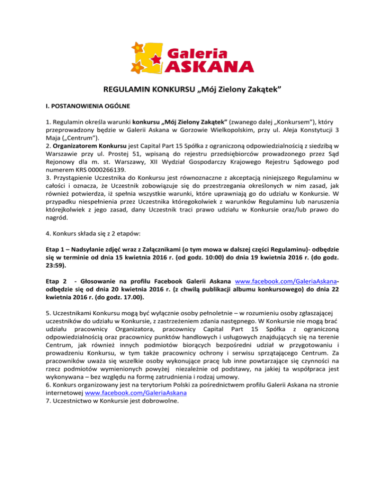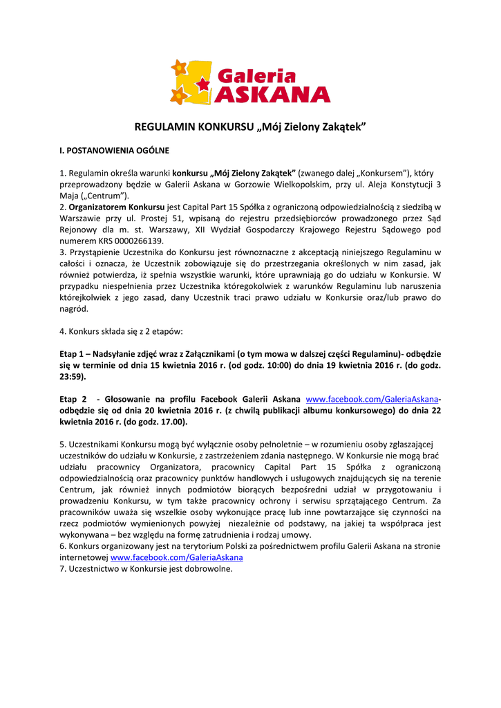 REGULAMIN KONKURSU „Mój Zielony Zakątek” I. POSTANOWIENIA OGÓLNE 1. Regulamin określa warunki konkursu „Mój Zielony Zakątek” (zwanego dalej „Konkursem”), który przeprowadzony będzie w Galerii Askana w Gorzowie Wielkopolskim, przy ul. Aleja Konstytucji 3 Maja („Centrum”). 2. Organizatorem Konkursu jest Capital Part 15 Spółka z ograniczoną odpowiedzialnością z siedzibą w Warszawie przy ul. Prostej 51, wpisaną do rejestru przedsiębiorców prowadzonego przez Sąd Rejonowy dla m. st. Warszawy, XII Wydział Gospodarczy Krajowego Rejestru Sądowego pod numerem KRS 0000266139. 3. Przystąpienie Uczestnika do Konkursu jest równoznaczne z akceptacją niniejszego Regulaminu w całości i oznacza, że Uczestnik zobowiązuje się do przestrzegania określonych w nim zasad, jak również potwierdza, iż spełnia wszystkie warunki, które uprawniają go do udziału w Konkursie. W przypadku niespełnienia przez Uczestnika któregokolwiek z warunków Regulaminu lub naruszenia którejkolwiek z jego zasad, dany Uczestnik traci prawo udziału w Konkursie oraz/lub prawo do nagród. 4. Konkurs składa się z 2 etapów: Etap 1 – Nadsyłanie zdjęć wraz z Załącznikami (o tym mowa w dalszej części Regulaminu)- odbędzie się w terminie od dnia 15 kwietnia 2016 r. (od godz. 10:00) do dnia 19 kwietnia 2016 r. (do godz. 23:59). Etap 2 - Głosowanie na profilu Facebook Galerii Askana www.facebook.com/GaleriaAskanaodbędzie się od dnia 20 kwietnia 2016 r. (z chwilą publikacji albumu konkursowego) do dnia 22 kwietnia 2016 r. (do godz. 17.00). 5. Uczestnikami Konkursu mogą być wyłącznie osoby pełnoletnie – w rozumieniu osoby zgłaszającej uczestników do udziału w Konkursie, z zastrzeżeniem zdania następnego. W Konkursie nie mogą brać udziału pracownicy Organizatora, pracownicy Capital Part 15 Spółka z ograniczoną odpowiedzialnością oraz pracownicy punktów handlowych i usługowych znajdujących się na terenie Centrum, jak również innych podmiotów biorących bezpośredni udział w przygotowaniu i prowadzeniu Konkursu, w tym także pracownicy ochrony i serwisu sprzątającego Centrum. Za pracowników uważa się wszelkie osoby wykonujące pracę lub inne powtarzające się czynności na rzecz podmiotów wymienionych powyżej niezależnie od podstawy, na jakiej ta współpraca jest wykonywana – bez względu na formę zatrudnienia i rodzaj umowy. 6. Konkurs organizowany jest na terytorium Polski za pośrednictwem profilu Galerii Askana na stronie internetowej www.facebook.com/GaleriaAskana 7. Uczestnictwo w Konkursie jest dobrowolne. II. ZASADY KONKURSU, OCENA PRAC, NAGRODY I ICH ODBIÓR 8. Warunkiem udziału w Konkursie i możliwości ubiegania się o uzyskanie nagrody jest: a) Przesłanie jednego zdjęcia (w formacie JPG) swojego BALKONU lub TARASU lub OGRODU z krótkim opisem (2-3 zdania) na podany adres mailowy: [email protected] w terminie od dnia 15 kwietnia 2016 r. (od godz. 10:00) do dnia 19 kwietnia 2016 r. (do godz. 23:59) ETAP 1). b) W mailu należy podać dane osobowe konieczne do przeprowadzenia konkursu : imię, nazwisko, miasto, numer telefonu kontaktowego, adres e-mail/ w temacie maila proszę wpisać: KONKURS Mój Zielony Zakątek. c) Wyrażenie zgody na przetwarzanie danych osobowych przez Organizatora Konkursu w celach konkursowych oraz marketingowych, jak również na przekazanie danych osobowych w celach konkursowych oraz marketingowych spółce Capital Part 15 Spółka z ograniczoną odpowiedzialnością, zgodnie z Ustawą z dnia 29 sierpnia 1997 r. o ochronie danych osobowych (Załącznik nr 1 do niniejszego Regulaminu). d) Złożenie oświadczenia dotyczącego własności praw autorskich do wykorzystania zdjęcia, oraz przeniesienie tych praw na rzecz Organizatora oraz właściciela Centrum (spółce Capital Part 15 Spółka z ograniczoną odpowiedzialnością) na polach eksploatacji wskazanych w oświadczeniu m.in.: Internet, prasa, materiały promocyjne Galerii Askana (Załącznik nr 2 do niniejszego Regulaminu). 9. Nadesłane zdjęcia wezmą udział w głosowaniu na FB na profilu www.facebook.com/GaleriaAskana w specjalnym albumie konkursowym. 10. Głosowanie na profilu www.facebook.com/GaleriaAskana odbędzie się w terminie od dnia 20 kwietnia 2016 r. (z chwilą publikacji albumu konkursowego) do dnia 22 kwietnia 2016 r. (do godz. 17.00) – ETAP II. 11. Zwycięży zdjęcie, które otrzyma największą liczbę „lajków” w głosowaniu na Facebooku. 12. Organizatorzy zastrzegają sobie prawo do publikowania wszystkich zdjęć na profilu Galerii Askana. Za ich publikację autorowi nie przysługuje wynagrodzenie. 13. W przypadku uzyskania tej samej ilości polubień dla więcej niż jednego zdjęcia Organizator powoła Komisję Konkursową , która dokona oceny i wyłoni zwycięzcę w dniu 22 kwietnia 2016 r. 14. Zwycięzca Konkursu o wygranej zostanie poinformowany w drodze korespondencji mailowej lub telefonicznej, ogłoszenie nastąpi również na oficjalnym profilu Galerii Askana na Facebooku www.facebook.com/GaleriaAskana w dniu 22 kwietnia 2016 r. (do godz. 21.00). 15. Nagroda w postaci profesjonalnej Kosiarki - HECHT 541SW o wartości 617,00 zł zostanie wręczona 23 kwietnia 2016 roku o godzinie 14.00 na scenie głównej w Galerii Askana podczas trwania Festiwalu Zieleni. 16. Odbiór nagrody potwierdza się podpisaniem stosownego dokumentu. Nagrodę nieodebraną w dniu 23 kwietnia 2016 r. należy odebrać najpóźniej do 30 kwietnia w Punkcie Obsługi Klienta Galerii Askana. 17. Nagroda nieodebrana przez Zwycięzcę w terminie przepada. III. POSTANOWIENIA KOŃCOWE 17. Informacje o Konkursie, w tym niniejsze zasady, dostępne są przez cały okres trwania Konkursu w biurze Organizatora oraz na stronie www.galeria-askana.pl i Facebooku Galerii Askana www.facebook.com/GaleriaAskana. 18. Organizator oświadcza, iż nagrody zostaną wydane zgodnie z przepisami ustawy z dnia 26.07.1991 r. o podatku dochodowym od osób fizyczn