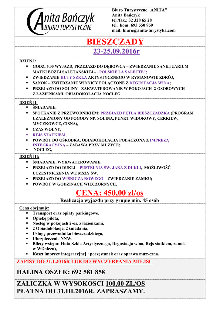 Biuro Turystyczne „ANITA” Anita Bańczyk tel./fax.: 32 328 65 28 tel. kom: 693 550 959 mail: [email protected] BIESZCZADY 23-25.09.2016r DZIEŃ I: GODZ. 5.00 WYJAZD, PRZEJAZD DO DĘBOWCA – ZWIEDZANIE SANKTUARIUM MATKI BOŻEJ SALETAŃSKIEJ – „POLSKIE LA SALETTE”; ZWIEDZANIE HUTY SZKŁA ARTYSTYCZNEGO W RYMANOWIE ZDRÓJ, SANOK – ZWIEDZANIE WINNICY POŁĄCZONE Z DEGUSTACJA WINA; PRZEJAZD DO SOLINY - ZAKWATEROWANIE W POKOJACH 2-OSOBOWYCH Z ŁAZIENKAMI, OBIADOKOLACJA NOCLEG. DZIEŃ II: ŚNIADANIE, SPOTKANIE Z PRZEWODNIKIEM: PRZEJAZD PĘTLĄ BIESZCZADZKĄ (PROGRAM UZALEŻNIONY OD POGODY NP. SOLINA, PUNKT WIDOKOWY, CERKIEW, MYCZKOWCE, CISNA), CZAS WOLNY, REJS STATKIEM, POWRÓT DO OŚRODKA, OBIADOKOLACJA POŁĄCZONA Z IMPREZĄ INTEGRACYJNĄ – ZABAWA PRZY MUZYCE;, NOCLEG, DZIEŃ III: ŚNIADANIE, WYKWATEROWANIE, PRZEJAZD DO DUKLI – PUSTELNIA ŚW. JANA Z DUKLI, MOŻLIWOŚĆ UCZESTNICZENIA WE MSZY ŚW. PRZEJAZD DO WIŚNICZA NOWEGO – ZWIEDZANIE ZAMKU; POWRÓT W GODZINACH WIECZORNYCH, CENA: 450,00 zł/os Realizacja wyjazdu przy grupie min. 45 osób Cena obejmuje: Transport oraz opłaty parkingowe, Opiekę pilota, Nocleg w pokojach 2-os. z łazienkami, 2 Obiadokolacje, 2 śniadania, Usługę przewodnika bieszczadzkiego, Ubezpieczenie NNW, Bilety wstępu: Huta Szkła Artystycznego, Degustacja wina, Rejs statkiem, zamek w Wiśniczu), Koszt imprezy integracyjnej : poczęstunek oraz oprawa muzyczna. ZAPISY DO 31.I.2016R LUB DO WYCZERPANIA MIEJSC HALINA OSZEK: 692 581 858 ZALICZKA W WYSOKOSCI 100,00 ZŁ/OS PŁATNA DO 31.III.2016R. ZAPRASZAMY.