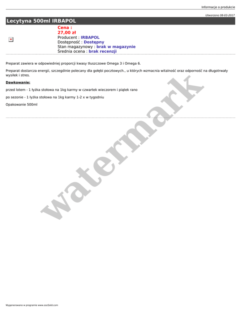 Informacje o produkcie Utworzono 08-03-2017 Lecytyna 500ml IRBAPOL Cena : 27,00 zł Producent : IRBAPOL Dostępność : Dostępny Stan magazynowy : brak w magazynie Średnia ocena : brak recenzji Preparat zawiera w odpowiedniej proporcji kwasy tłuszczowe Omega 3 i Omega 6. Preparat dostarcza energii, szczególnie polecany dla gołębi pocztowych., u których wzmacnia witalność oraz odporność na długotrwały wysiłek i stres. er m ar k Dawkowanie: przed lotem - 1 łyżka stołowa na 1kg karmy w czwartek wieczorem i piątek rano po sezonie - 1 łyżka stołowa na 1kg karmy 1-2 x w tygodniu w at Opakowanie 500ml Wygenerowano w programie www.oscGold.com
