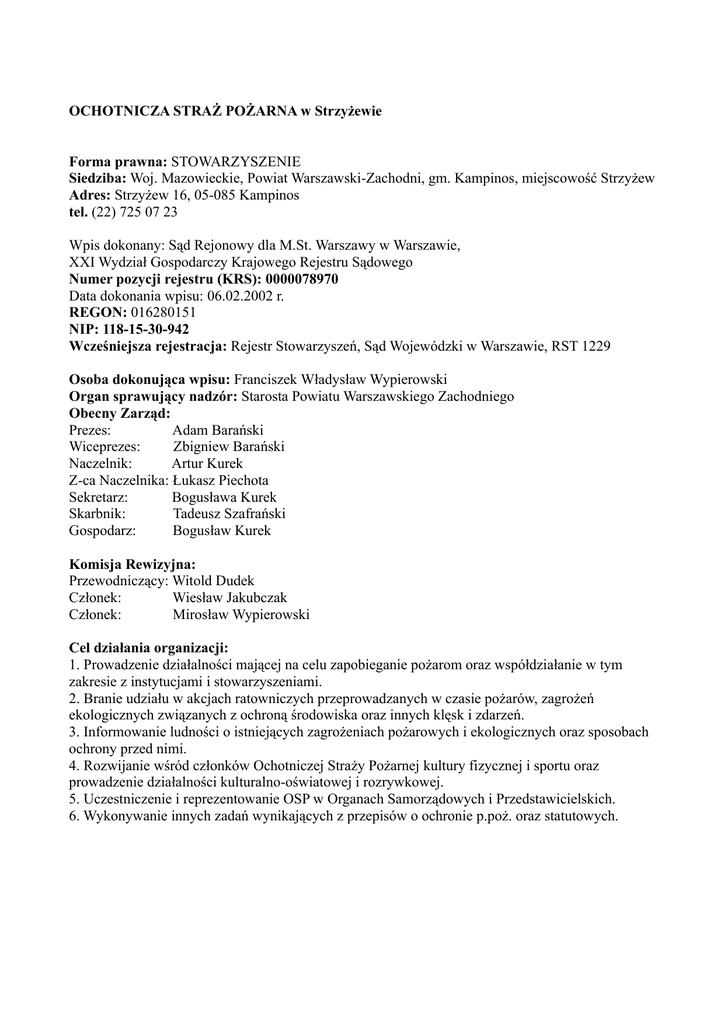 OCHOTNICZA STRAŻ POŻARNA w Strzyżewie Forma prawna: STOWARZYSZENIE Siedziba: Woj. Mazowieckie, Powiat Warszawski-Zachodni, gm. Kampinos, miejscowość Strzyżew Adres: Strzyżew 16, 05-085 Kampinos tel. (22) 725 07 23 Wpis dokonany: Sąd Rejonowy dla M.St. Warszawy w Warszawie, XXI Wydział Gospodarczy Krajowego Rejestru Sądowego Numer pozycji rejestru (KRS): 0000078970 Data dokonania wpisu: 06.02.2002 r. REGON: 016280151 NIP: 118-15-30-942 Wcześniejsza rejestracja: Rejestr Stowarzyszeń, Sąd Wojewódzki w Warszawie, RST 1229 Osoba dokonująca wpisu: Franciszek Władysław Wypierowski Organ sprawujący nadzór: Starosta Powiatu Warszawskiego Zachodniego Obecny Zarząd: Prezes: Adam Barański Wiceprezes: Zbigniew Barański Naczelnik: Artur Kurek Z-ca Naczelnika: Łukasz Piechota Sekretarz: Bogusława Kurek Skarbnik: Tadeusz Szafrański Gospodarz: Bogusław Kurek Komisja Rewizyjna: Przewodniczący: Witold Dudek Członek: Wiesław Jakubczak Członek: Mirosław Wypierowski Cel działania organizacji: 1. Prowadzenie działalności mającej na celu zapobieganie pożarom oraz współdziałanie w tym zakresie z instytucjami i stowarzyszeniami. 2. Branie udziału w akcjach ratowniczych przeprowadzanych w czasie pożarów, zagrożeń ekologicznych związanych z ochroną środowiska oraz innych klęsk i zdarzeń. 3. Informowanie ludności o istniejących zagrożeniach pożarowych i ekologicznych oraz sposobach ochrony przed nimi. 4. Rozwijanie wśród członków Ochotniczej Straży Pożarnej kultury fizycznej i sportu oraz prowadzenie działalności kulturalno-oświatowej i rozrywkowej. 5. Uczestniczenie i reprezentowanie OSP w Organach Samorządowych i Przedstawicielskich. 6. Wykonywanie innych zadań wynikających z przepisów o ochronie p.poż. oraz statutowych.