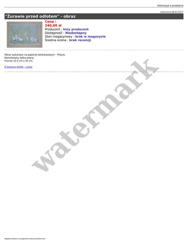 Informacje o produkcie Utworzono 08-03-2017 "Żurawie przed odlotem" - obraz Cena : 240,00 zł Producent : Inny producent Dostępność : Niedostępny Stan magazynowy : brak w magazynie Średnia ocena : brak recenzji Obraz wykonany na papierze bezkwasowym - Pittura. Namalowany farbą olejną. Format 32,5 cm x 45 cm. w at er m ar k O Autorce dzieła - czytaj Wygenerowano w programie www.oscGold.com