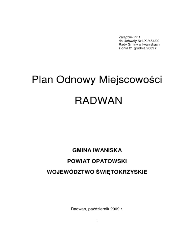 Załącznik nr 1 do Uchwały Nr LX /454/09 Rady Gminy w Iwaniskach z dnia 21 grudnia 2009 r. Plan Odnowy Miejscowości RADWAN GMINA IWANISKA POWIAT OPATOWSKI WOJEWÓDZTWO ŚWIĘTOKRZYSKIE Radwan, październik 2009 r. 1 Plan Odnowy Miejscowości Radwan SPIS TREŚCI 1. Charakterystyka miejscowości …………………………………4-5 2. Inwentaryzacja zasobów miejscowości………………………..6-8 3. Słabe i mocne strony miejscowości – Analiza SWOT………9-10 4. Planowane kierunki rozwoju miejscowości - wizja rozwoju miejscowości……………………………………………………….10 5. Opis planowanego przedsięwzięcia…………………………… 11 6. Szacunkowy kosztorys planowanego przedsięwzięcia…….....11 7. Harmonogram rzeczowo - finansowy planowanego przedsięwzięcia……………………………………………………12 2 Plan Odnowy Miejscowości Radwan Plan Odnowy Miejscowości Radwan jest dokumentem strategicznym, stworzonym przy udziale mieszkańców. Określa najważniejsze działania, które mieszkańcy uznali za istotne dla swojej miejscowości. Plan Odnowy Miejscowości pozwolił na uświadomienie mieszkańcom ich roli, w tworzeniu pomysłów na własny rozwój i poprawę warunków życia. 3 Plan Odnowy Miejscowości Radwan I. CHARAKTERYSTYKA MIEJSCOWOŚCI 1. Położenie Miejscowość Radwan położona jest w województwie świętokrzyskim, w powiecie opatowskim, w gminie Iwaniska, w obrębie ewidencyjnym Radwan. Graniczy z obrębami: Kujawy, Kopiec, Ujazd, Łopatno. Miejscowość ta leży około. 17 km na południowy zachód od Opatowa, około 17 km na północny zachód od Klimontowa i około 27 km na północny wschód od Staszowa. 2. Liczba ludności Liczba ludności w miejscowości Kujawy wynosi 160 osób. (Stan na dzień 20 października 2009 r. – dane z Ewidencji Ludności U.G. Iwaniska) 3. Infrastruktura techniczna Miejscowość wyposażona jest w podstawową infrastrukturę techniczną: wodociąg, sieci energetyczne, sieć telekomunikacyjną. 4. Dane historyczne Nazwa miejscowości Radwan pochodzi od nazwiska najbogatszego gospodarza we wsi – Radwańskiego. 4 Plan Odnowy Miejscowości Radwan 5. Położenie komunikacyjne Miejscowości położona jest przy drodze powiatowej nr 0713 T Haliszka-Radwan-Brzezionki-Grzybów. 6. Gospodarka i rolnictwo Na terenie miejscowości Radwan zarejestrowanych jest 4 podmioty gospodarcze, zajmujące się działalnością usługową i handlową. Są to podmioty jednoosobowe lub tzw. rodzinne. Struktura prowadzonej działalności gospodarczej w miejscowości Radwan przedstawia się następująco: Usługi Handel 3 1 (stan na dzień 20 października 2009 r. dane z ewidencji działalności gospodarczej U.G. w Iwaniskach). Profil produkcji rolniczej w Radwanie nastawiony jest w większej części na zaspakajanie potrzeb własnych gospodarstw domowych niż masowego zapotrzebowania konsumenta. 5 Plan Odnowy Miejscowości Radwan II. INWENTARYZACJA ZASOBÓW MIEJSCOWOŚCI Zasoby – to wszelkie elementy materialne i niematerialne miejscowości i otaczającego ją obszaru, które mogą być wykorzystane obecnie bądź w przyszłości w działaniach na rzecz jej rozwoju. Rodzaj zasobu Opis zasobu, jakim dysponuje miejscowość Środowisko przyrodnicze, położenie Atrakcyjne krajobrazowo i przyrodniczo środowisko, Walory krajobrazu malowniczy krajobraz Korzystne warunki klimatyczne dla zamieszkiwania Walory klimatu Walory szaty roślinnej i wypoczynku W pobliżu lasy Bliskość: Sąsiedztwo - centrum gminy - większych aglomeracji miejskich (Opatów, Staszów, Ostrowiec Świętokrzyski ), - otoczenie lasów, 6 Środowisko kulturowe Walory architektury, zabytki W pobliżu: - Zabytkowy zespół zamkowy Ossolińskich w Ujeździe: Zamek Krzyżtopór, park podworski (pozostałości), Walory ukształtowania przestrzeni publicznej - Brak uporządkowanej, zorganizowanej przestrzeni publicznej, służącej mieszkańcom Obiekty i tereny Place i miejsca publicznych - istniejący budynek świetlicy wiejskiej wymaga remontu spotkań - brak urządzonych terenów zieleni wiejskiej Miejsca sportu i rekreacji - Boisko sportowe Infrastruktura techniczna Miejscowość posiada sieć: - wodociągową, - telekomunikacyjną, - energetyczną Gospodarka, rolnictwo Miejsca pracy Rolnictwo, ale także pozarolnicze miejsca poza miejscowością 7 Zakłady produkcyjne i obiekty usługowe - 1 sklep spożywczo-przemysłowy Miejsca noclegowe, - Brak bazy: - noclegowej, - gastronomicznej gastronomia, baza noclegowo-gastronomiczna 8 Plan Odnowy Miejscowości Radwan III. SŁABE I MOCNE STRONY MIEJSCOWOŚCI – Analiza SWOT Na podstawie analizy zasobów, opracowano korzystne i niekorzystne cechy wewnętrzne miejscowości, jak i potencjalne szanse i zagrożenia występujące w otoczeniu, które mogą mieć wpływ na przyszłość miejscowości i jej mieszkańców. MOCNE STRONY-ATUTY ROZWOJU MIEJSCOWOŚCI czyste otoczenie i środowisko naturalne SŁABE STRONY-CZYNNIKI OGRANICZAJĄCE ROZWÓJ MIEJSCOWOŚCI brak sieci kanalizacyjnej budynek świetlicy wiejskiej wymaga remontu atrakcyjne położenie w malowniczej okolicy, w urozmaiconym krajobrazowo otoczeniu brak estetycznych przestrzeni publicznych wysokie walory krajobrazowe bogate walory turystyczno- wypoczynkowych przyrodnicze w pobliżu zabytkowy zespół brak terenów rekreacyjno- brak urządzonych publicznych zamkowy Ossolińskich w Ujeździe terenów zielonych SZANSE-MOŻLIWOŚCI ROZWOJU MIEJSCOWOŚCI, WYNIKAJĄCE Z OTOCZENIA ZAGROŻENIA –CZYNNIKI NIESPRZYJAJĄCE, WYNIKAJĄCE Z OTOCZENIA wykorzystanie potencjału i atutów położenia niewystarczające fundusze na właściwe zagospodarowanie terenów ważnych dla wizerunku miejscowości sprzyjająca polityka regionalna zwiększanie się dostępności do i funkcjonowania jej społeczności kapitałów i środków pomocowych rosnące bezrobocie alkoholizm zwłaszcza wśród w tym pochodzących z UE bezrobotnych zagospodar