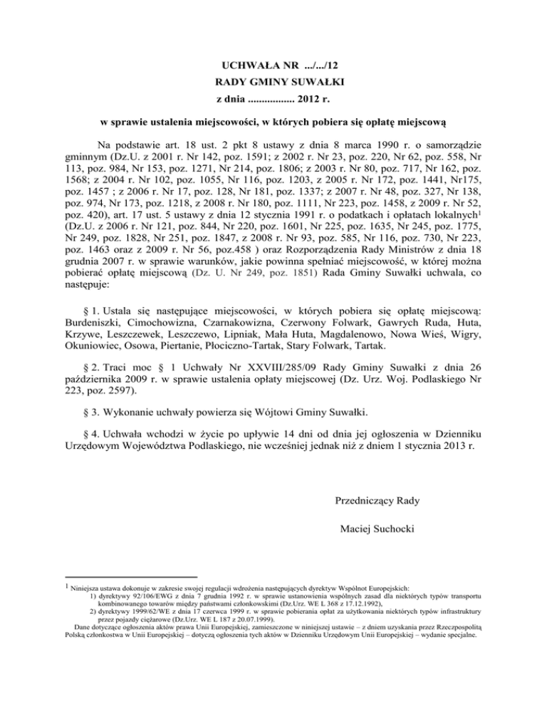 UCHWAŁA NR .../.../12 RADY GMINY SUWAŁKI z dnia ................. 2012 r. w sprawie ustalenia miejscowości, w których pobiera się opłatę miejscową Na podstawie art. 18 ust. 2 pkt 8 ustawy z dnia 8 marca 1990 r. o samorządzie gminnym (Dz.U. z 2001 r. Nr 142, poz. 1591; z 2002 r. Nr 23, poz. 220, Nr 62, poz. 558, Nr 113, poz. 984, Nr 153, poz. 1271, Nr 214, poz. 1806; z 2003 r. Nr 80, poz. 717, Nr 162, poz. 1568; z 2004 r. Nr 102, poz. 1055, Nr 116, poz. 1203, z 2005 r. Nr 172, poz. 1441, Nr175, poz. 1457 ; z 2006 r. Nr 17, poz. 128, Nr 181, poz. 1337; z 2007 r. Nr 48, poz. 327, Nr 138, poz. 974, Nr 173, poz. 1218, z 2008 r. Nr 180, poz. 1111, Nr 223, poz. 1458, z 2009 r. Nr 52, poz. 420), art. 17 ust. 5 ustawy z dnia 12 stycznia 1991 r. o podatkach i opłatach lokalnych1 (Dz.U. z 2006 r. Nr 121, poz. 844, Nr 220, poz. 1601, Nr 225, poz. 1635, Nr 245, poz. 1775, Nr 249, poz. 1828, Nr 251, poz. 1847, z 2008 r. Nr 93, poz. 585, Nr 116, poz. 730, Nr 223, poz. 1463 oraz z 2009 r. Nr 56, poz.458 ) oraz Rozporządzenia Rady Ministrów z dnia 18 grudnia 2007 r. w sprawie warunków, jakie powinna spełniać miejscowość, w której można pobierać opłatę miejscową (Dz. U. Nr 249, poz. 1851) Rada Gminy Suwałki uchwala, co następuje: § 1. Ustala się następujące miejscowości, w których pobiera się opłatę miejscową: Burdeniszki, Cimochowizna, Czarnakowizna, Czerwony Folwark, Gawrych Ruda, Huta, Krzywe, Leszczewek, Leszczewo, Lipniak, Mała Huta, Magdalenowo, Nowa Wieś, Wigry, Okuniowiec, Osowa, Piertanie, Płociczno-Tartak, Stary Folwark, Tartak. § 2. Traci moc § 1 Uchwały Nr XXVIII/285/09 Rady Gminy Suwałki z dnia 26 października 2009 r. w sprawie ustalenia opłaty miejscowej (Dz. Urz. Woj. Podlaskiego Nr 223, poz. 2597). § 3. Wykonanie uchwały powierza się Wójtowi Gminy Suwałki. § 4. Uchwała wchodzi w życie po upływie 14 dni od dnia jej ogłoszenia w Dzienniku Urzędowym Województwa Podlaskiego, nie wcześniej jednak niż z dniem 1 stycznia 2013 r. Przedniczący Rady Maciej Suchocki 1 Niniejsza ustawa dokonuje w zakresie swojej regulacji wdrożenia następujących dyrektyw Wspólnot Europejskich: 1) dyrektywy 92/106/EWG z dnia 7 grudnia 1992 r. w sprawie ustanowienia wspólnych zasad dla niektórych typów transportu kombinowanego towarów między państwami członkowskimi (Dz.Urz. WE L 368 z 17.12.1992), 2) dyrektywy 1999/62/WE z dnia 17 czerwca 1999 r. w sprawie pobierania opłat za użytkowania niektórych typów infrastruktury przez pojazdy ciężarowe (Dz.Urz. WE L 187 z 20.07.1999). Dane dotyczące ogłoszenia aktów prawa Unii Europejskiej, zamieszczone w niniejszej ustawie – z dniem uzyskania przez Rzeczpospolitą Polską członkostwa w Unii Europejskiej – dotyczą ogłoszenia tych aktów w Dzienniku Urzędowym Unii Europejskiej – wydanie specjalne. Uzasadnienie Zgodnie z art. 17 ust. 5 ustawy z dnia 12 stycznia 1991 r. o podatkach i opłatach lokalnych kompetencje w zakresie ustalania miejscowości, w których pobiera się opłatę miejscową zostały przyznane radom gminy. Rozporządzenie Rady Ministrów z dnia 18 grudnia 2007 roku określa warunki, jakie powinna spełniać miejscowość, w której można pobierać opłatę miejscową. Są nimi minimalne warunki: klimatyczne i krajobrazowe oraz umożliwiające pobyt osób w celach turystycznych, wypoczynkowych lub szkoleniowych. Według rozporządzenia Nr 33/91 Wojewody Suwalskiego z dnia 8 lipca 1991 r. w sprawie ustalenia miejscowości, w których pobiera się opłatę miejscową (Dz.Urz. Woj. Suwalskiego Nr 26, poz. 238) oraz rozporządzenia Nr 23/02 Wojewody Podlaskiego z dnia 16 lipca 2002 r. w sprawie ustalenia miejscowości, w których pobiera się opłatę miejscową (Dz.Urz. Woj. Podlaskiego Nr 31, poz. 765) na terenie gminy Suwałki do miejscowości tych zaliczone zostały: Burdeniszki, Cimochowizna, Czerwony Folwark, Gawrych Ruda, Krzywe, Leszczewek, Mała Huta, Magdalenowo, Wigry, Okuniowiec, Osowa, Piertanie, Płociczno, Stary Folwark, Tartak, Turówka Stara. W obecnym projekcie proponuje się nazwy tych miejscowości utrzymać, tj. Burdeniszki, Cimochowizna, Czerwony Folwark, Gawrych Ruda, Krzywe, Leszczewek, Mała Huta, Magdalenowo, Wigry, Okuniowiec, Osowa, Piertanie, Stary Folwark, Tartak oraz dodatkowo rozpocząć pobór opłaty miejscowej w miejscowościach: Czarnakowiźnie, Hucie, Leszczewie, Lipniaku oraz Nowej Wsi. Miejscowości te w większości położone są bowiem w bezpośrednim oddziaływaniu klimatu Wigierskiego Parku Narodowego i jego otuliny. Spełniają one również wymogi klimatyczne określone w rozporządzeniu Rady Ministrów, tj. powietrze atmosferyczne wolne jest od zanieczyszczeń przekraczających dopuszczalne stężenia. Nie występują przekroczenia dopuszczalnego poziomu pól elektromagnetycznych. Miejscowości te spełniają ponadto minimalne warunki krajobrazowe w zakresie występowania tam elementów środowiska przyrodniczego istotnego dla wypoczynku oraz walorów krajoznawczych. Dodatkowo w miejscowościach znajdują się obiekty noclegowe w postaci prowadzonych agroturystyk, hoteli, pensjonatów i pól namiotowych. Minimalne warunki klimatyczne spełniają miejscowości, w których powietrze musi być wolne od zanieczyszczeń przekraczających dopuszczalne stężenia ustalane na podstawie przepisów o ochronie środowiska. Nie mogą być w nich również przekroczone dopuszczalne poziomy pól elektromagnetycznych. Zostało to stwierdzone na podstawie opracowań „Oceny poziomów substancji w powietrzu i klasyfikacji stref województwa podlaskiego w 2011 roku” oraz „Wynikach badań pól elektromagnetycznych wykonywanych na terenie województwa podlaskiego w 2011 roku” sporządzonych przez Wojewódzki Inspektorat Ochrony Środowiska. Do walorów krajobrazowych zaliczono się m.in. miejscowości położone na obszarze Wigierskiego Parku Narodowego i jego otuliny. Wigierski Park Narodowy znajduje się w północnowschodniej dzielnicy Pojezier