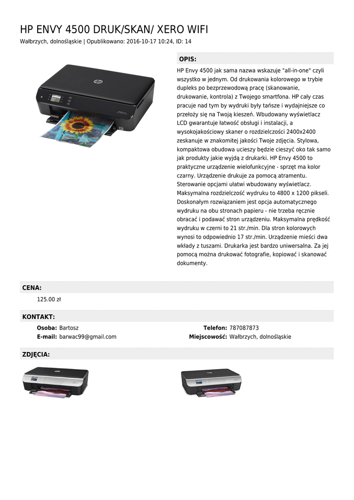 HP ENVY 4500 DRUK/SKAN/ XERO WIFI Wałbrzych, dolnośląskie | Opublikowano: 2016-10-17 10:24, ID: 14 OPIS: HP Envy 4500 jak sama nazwa wskazuje "all-in-one" czyli wszystko w jednym. Od drukowania kolorowego w trybie dupleks po bezprzewodową pracę (skanowanie, drukowanie, kontrola) z Twojego smartfona. HP cały czas pracuje nad tym by wydruki były tańsze i wydajniejsze co przełoży się na Twoją kieszeń. Wbudowany wyświetlacz LCD gwarantuje łatwość obsługi i instalacji, a wysokojakościowy skaner o rozdzielczości 2400x2400 zeskanuje w znakomitej jakości Twoje zdjęcia. Stylowa, kompaktowa obudowa ucieszy będzie cieszyć oko tak samo jak produkty jakie wyjdą z drukarki. HP Envy 4500 to praktyczne urządzenie wielofunkcyjne - sprzęt ma kolor czarny. Urządzenie drukuje za pomocą atramentu. Sterowanie opcjami ułatwi wbudowany wyświetlacz. Maksymalna rozdzielczość wydruku to 4800 x 1200 pikseli. Doskonałym rozwiązaniem jest opcja automatycznego wydruku na obu stronach papieru - nie trzeba ręcznie obracać i podawać stron urządzeniu. Maksymalna prędkość wydruku w czerni to 21 str./min. Dla stron kolorowych wynosi to odpowiednio 17 str./min. Urządzenie mieści dwa wkłady z tuszami. Drukarka jest bardzo uniwersalna. Za jej pomocą można drukować fotografie, kopiować i skanować dokumenty. CENA: 125.00 zł KONTAKT: Osoba: Bartosz E-mail: [email protected] ZDJĘCIA: Telefon: 787087873 Miejscowość: Wałbrzych, dolnośląskie